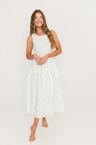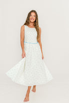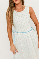 GARMENT DETAILS: Cotton midi dress in a ditsy floral print. Bodice features sleeveless design, rounded neckline, and fully smocked construction for maximum comfort. Features a contrast color ribbon waist accent, with a flowy, feminine skirt and side pockets. Lined.
