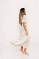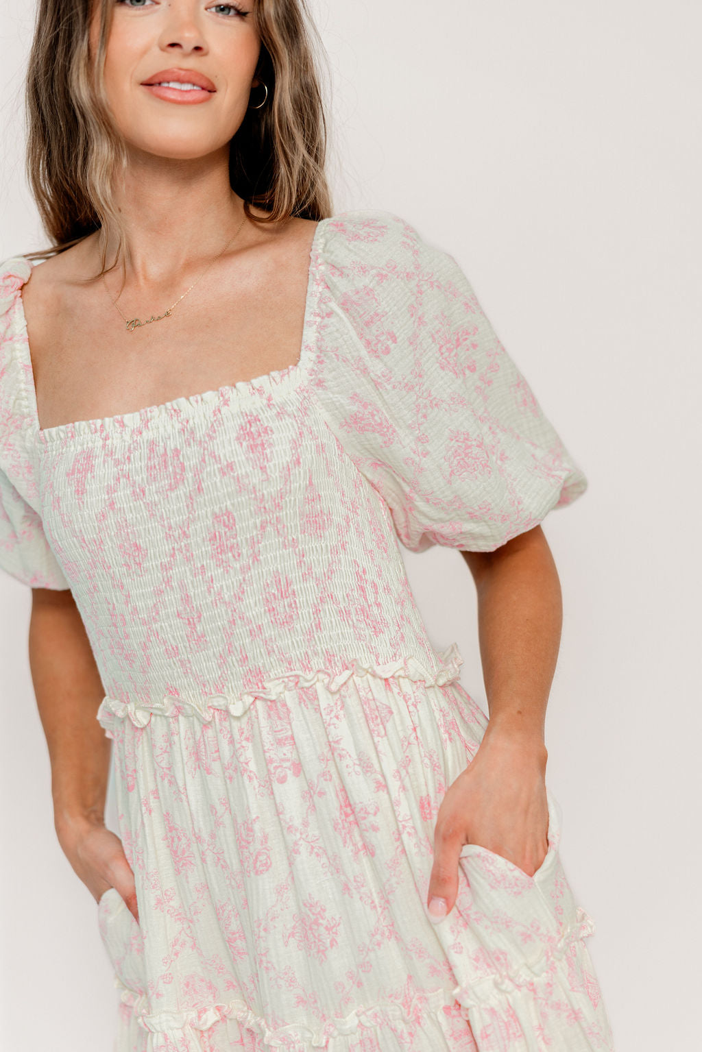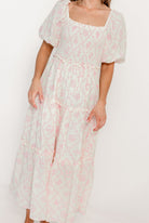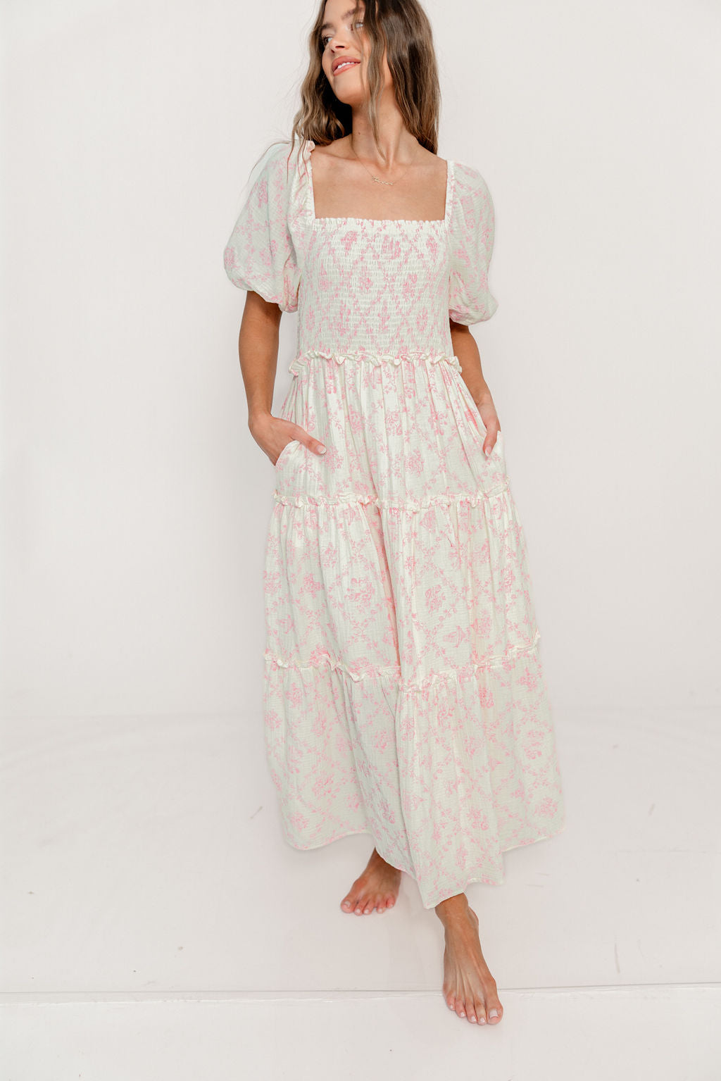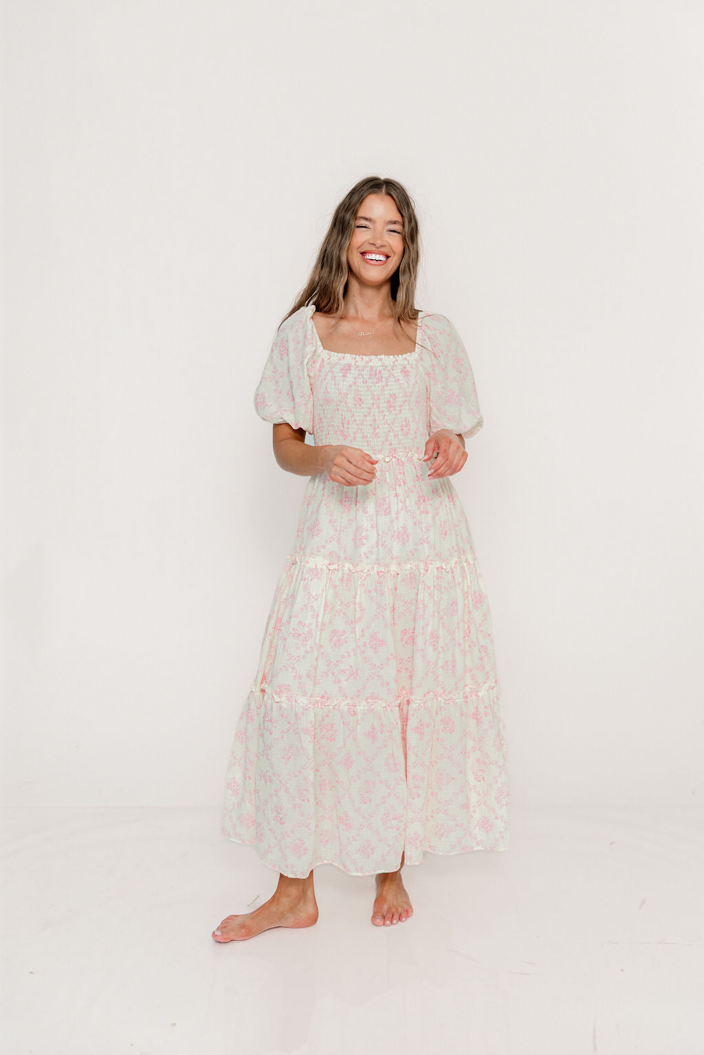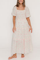 GARMENT DETAILS: Elegant cotton maxi dress with an antique floral print. Features square, stretchy neckline, puffed short sleeves, and dual side pockets. Finished with a smocked bodice and ruffle accents, with multi-tiered skirt.