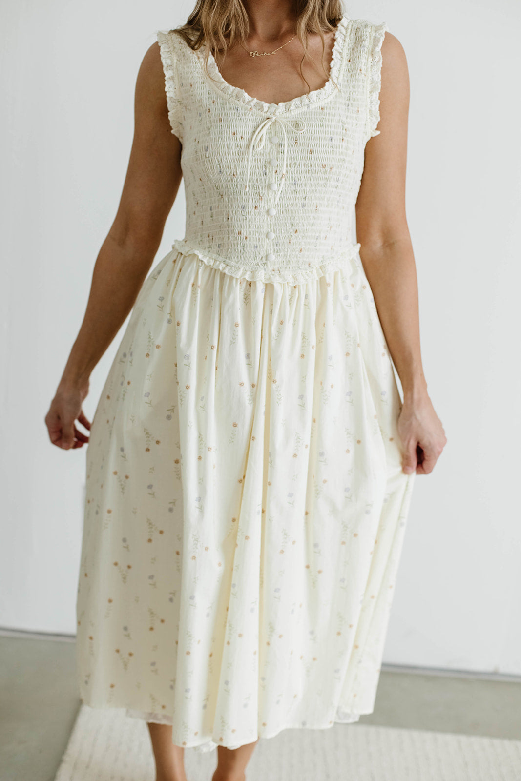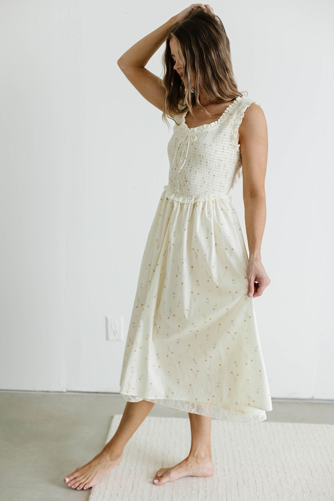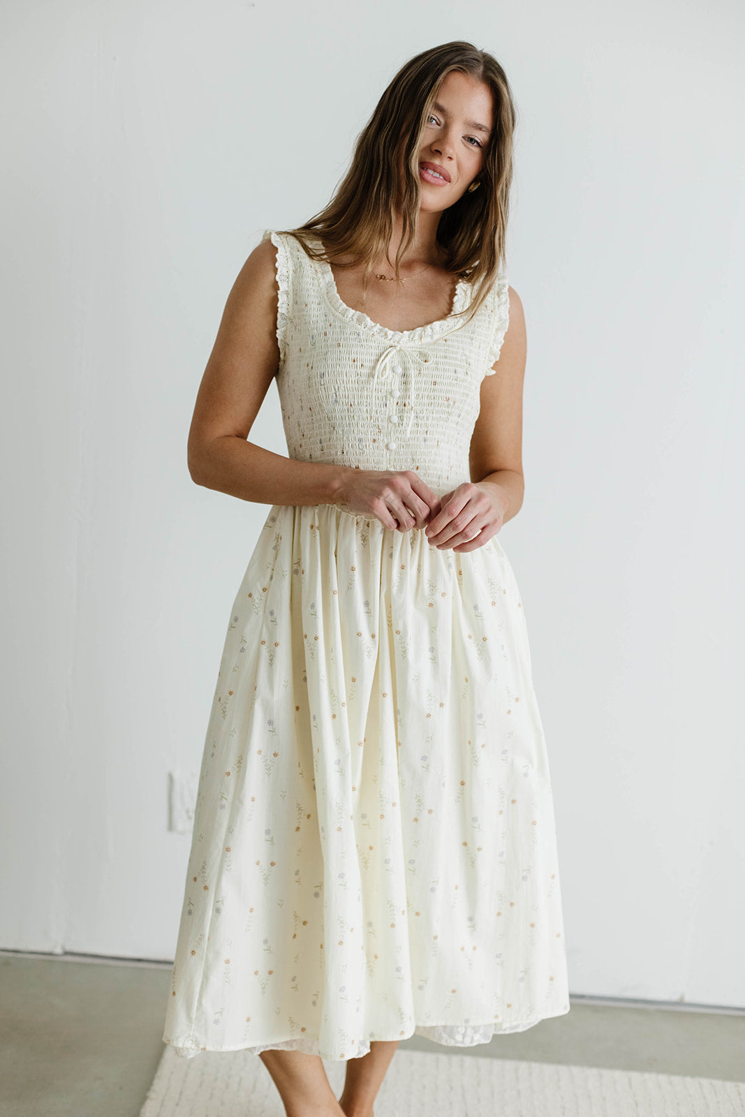 GARMENT DETAILS: Flattering 100% cotton sundress with V-neckline, fully smocked bodice, and wide shoulder straps, with tonal, decorative front buttons and tie detail. Features a flowy skirt and elegant ruffle details throughout. Fully lined.