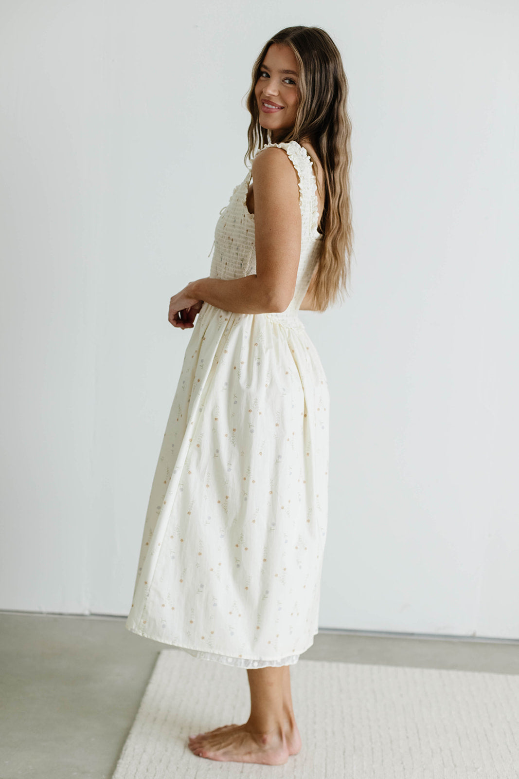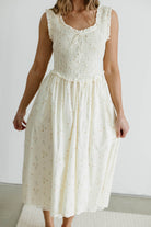 Madeline 100% Cotton Retro Smocked Midi Dress in Cream Multi