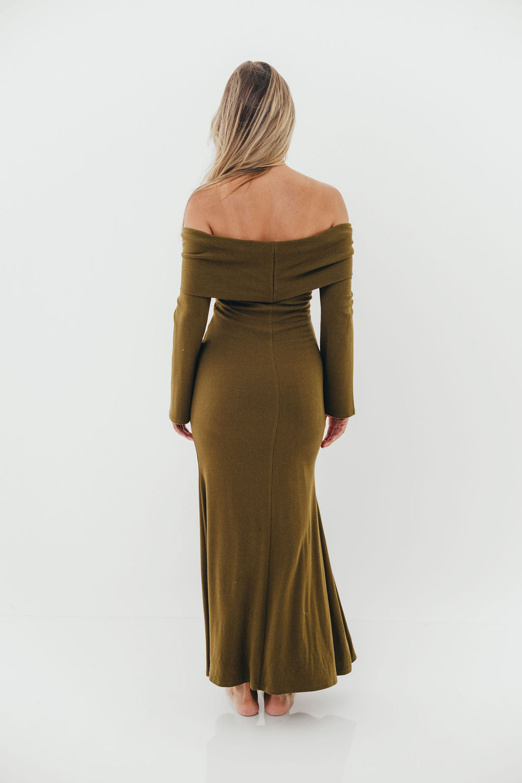 GARMENT DETAILS: Sleek and fitted maxi dress in a luxuriously soft knit. Features a folded off-the-shoulder neckline with long sleeves and a fit-and-flare design that is fitted through the hips and thighs and flares at the knee. Fully lined for maximum coverage and comfort.