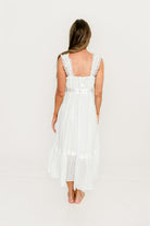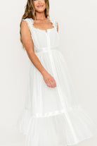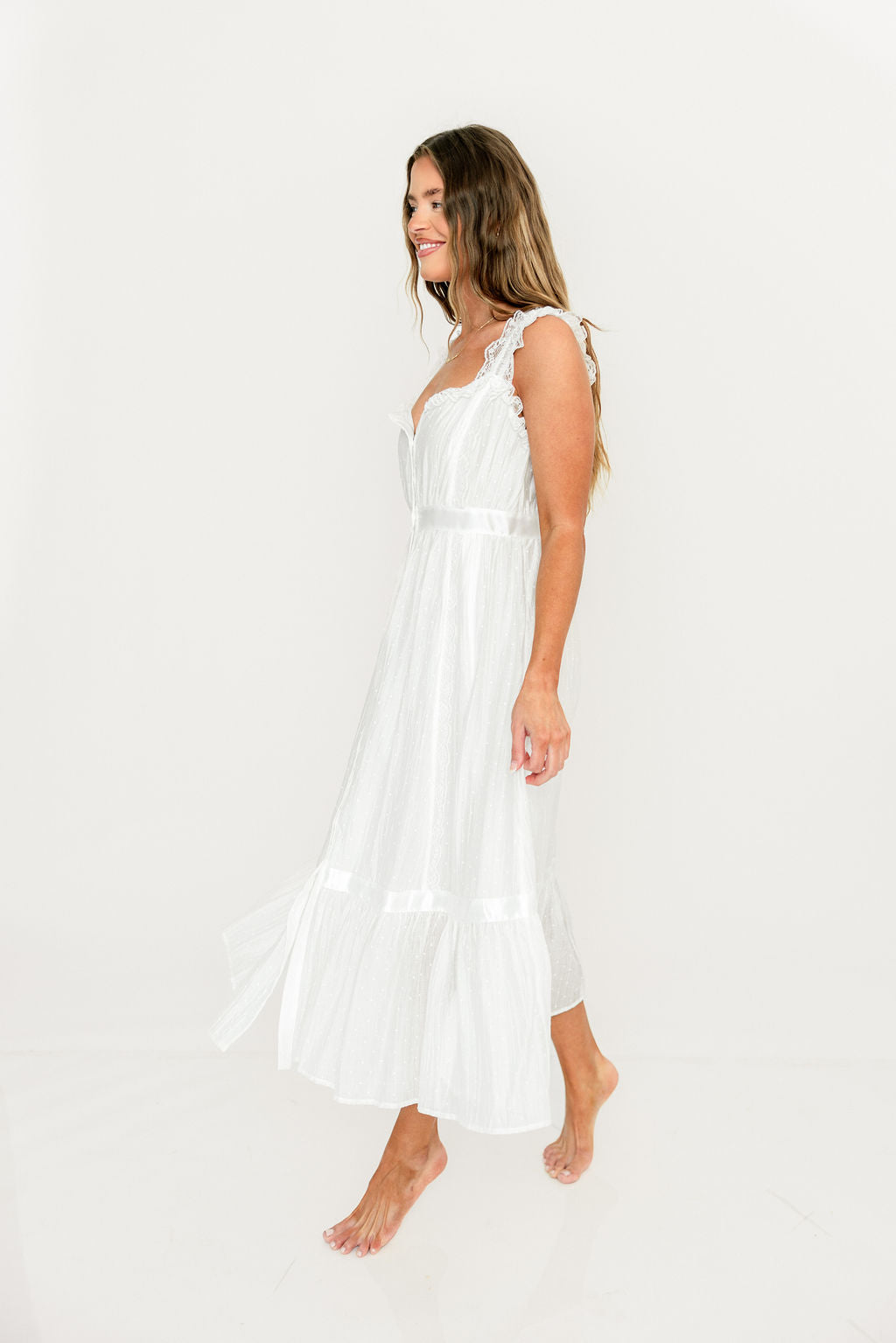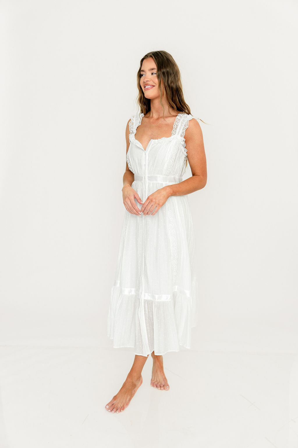 Capture timeless romance with this ethereal white maxi dress, featuring delicate lace-trimmed sleeves, a classic button-up front, and a breezy flared silhouette for an effortlessly sophisticated boutique statement.
