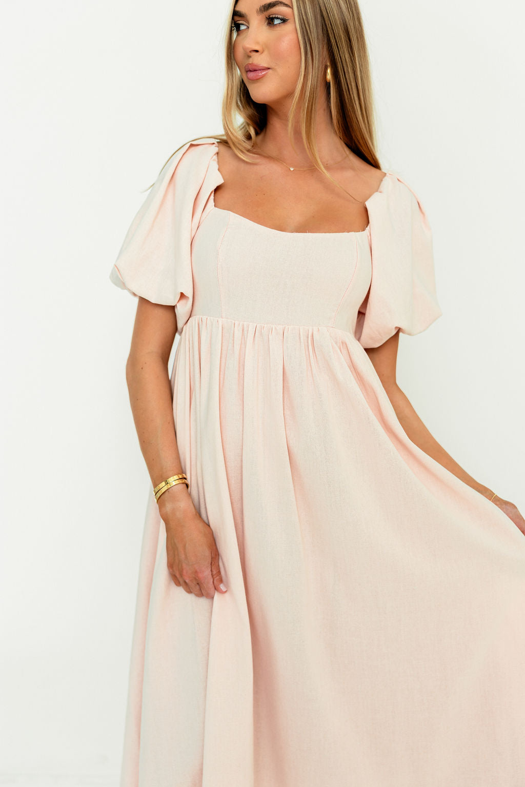GARMENT DETAILS: Empire-waisted midi dress, with sweetheart neckline and statement balloon sleeves that can be worn on or off the shoulders. Features a stretchy, smocked back panel. Fully lined.