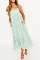 GARMENT DETAILS: Elegant floral print midi dress with an empire waist, adjustable spaghetti straps, and dual side pockets. Features decorative front pockets and full lining, with tiered ruffle hem.