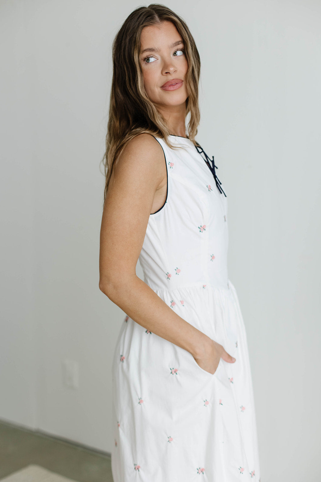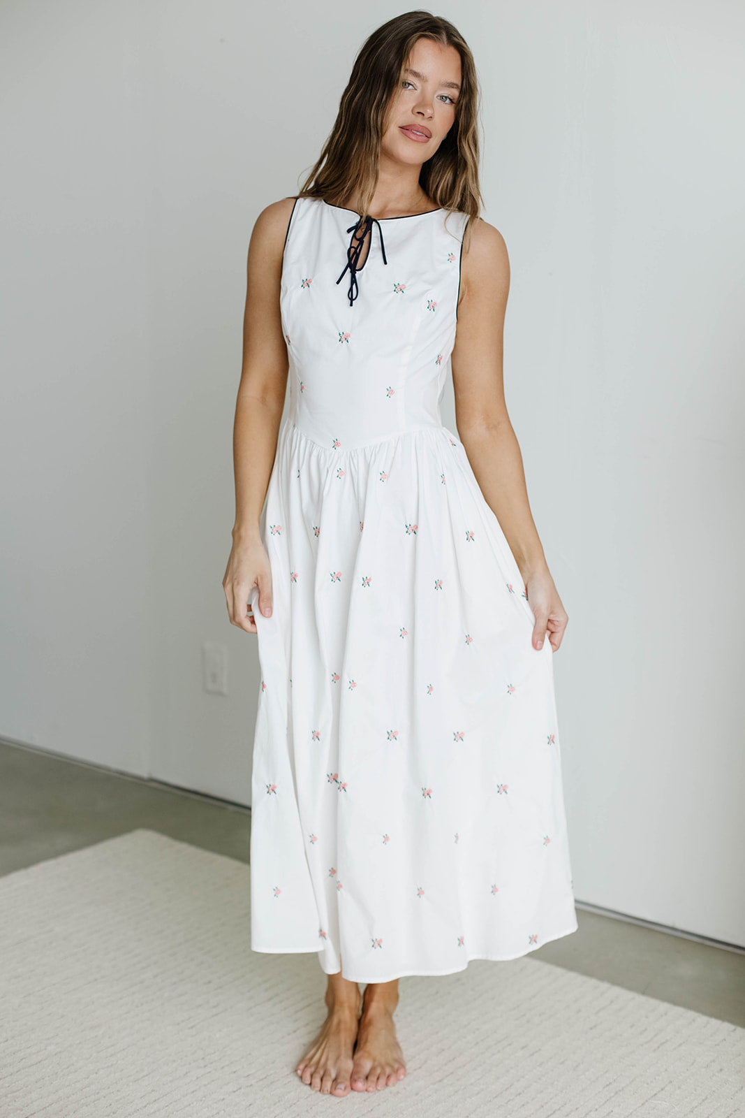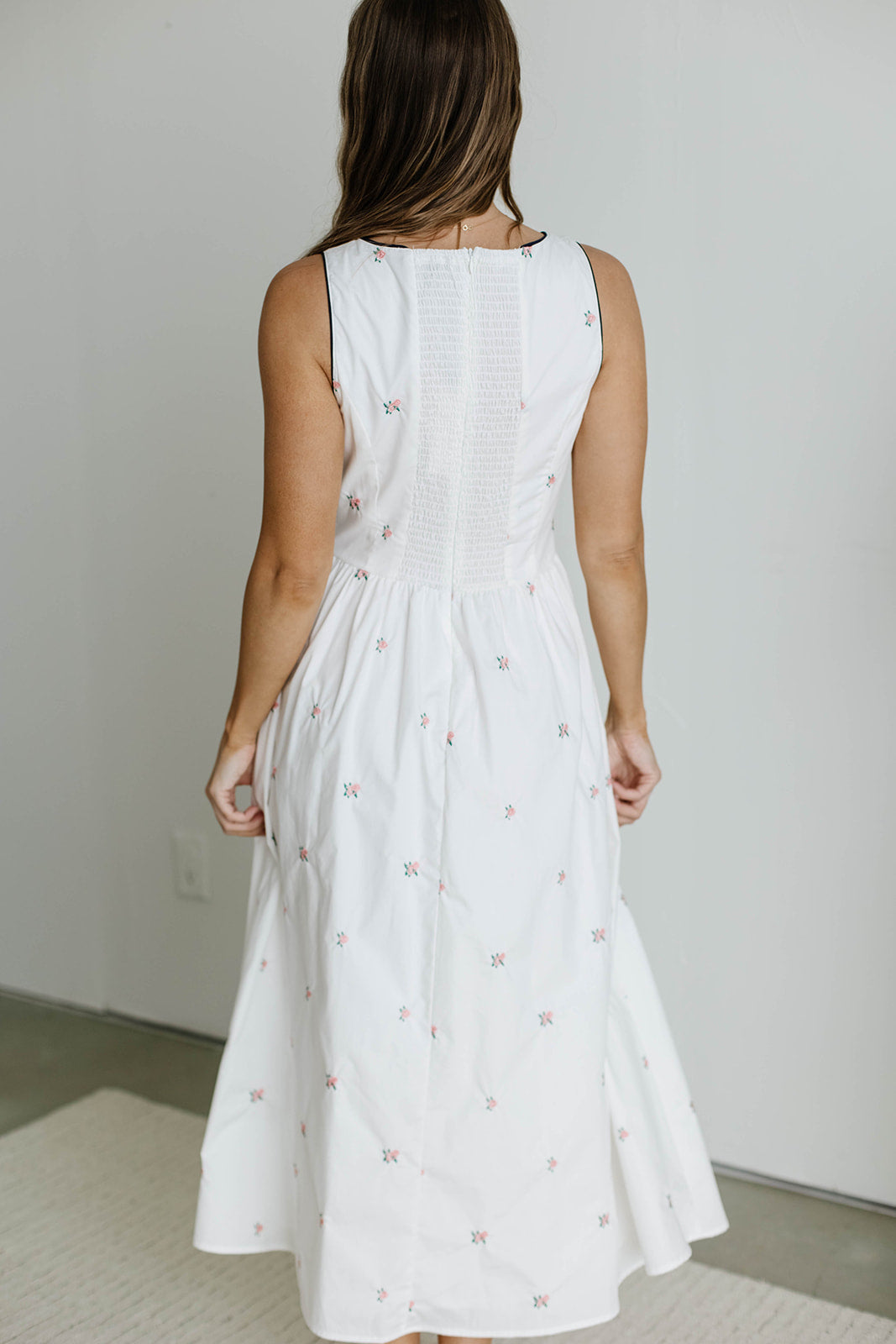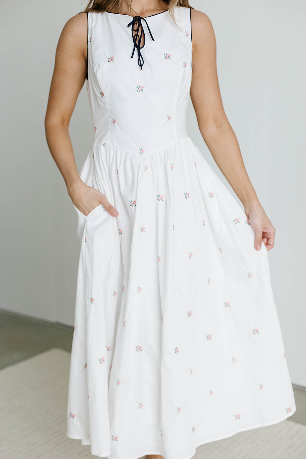 GARMENT DETAILS: Flattering A-line midi dress constructed from a lightweight cotton poplin with dainty floral embroidery. Features a high rounded neckline with contrast binding and front keyhole with self-tie closure, with fitted bodice and smocked back panel. Finished with invisible side zipper and and contrast color binding. Lined.
