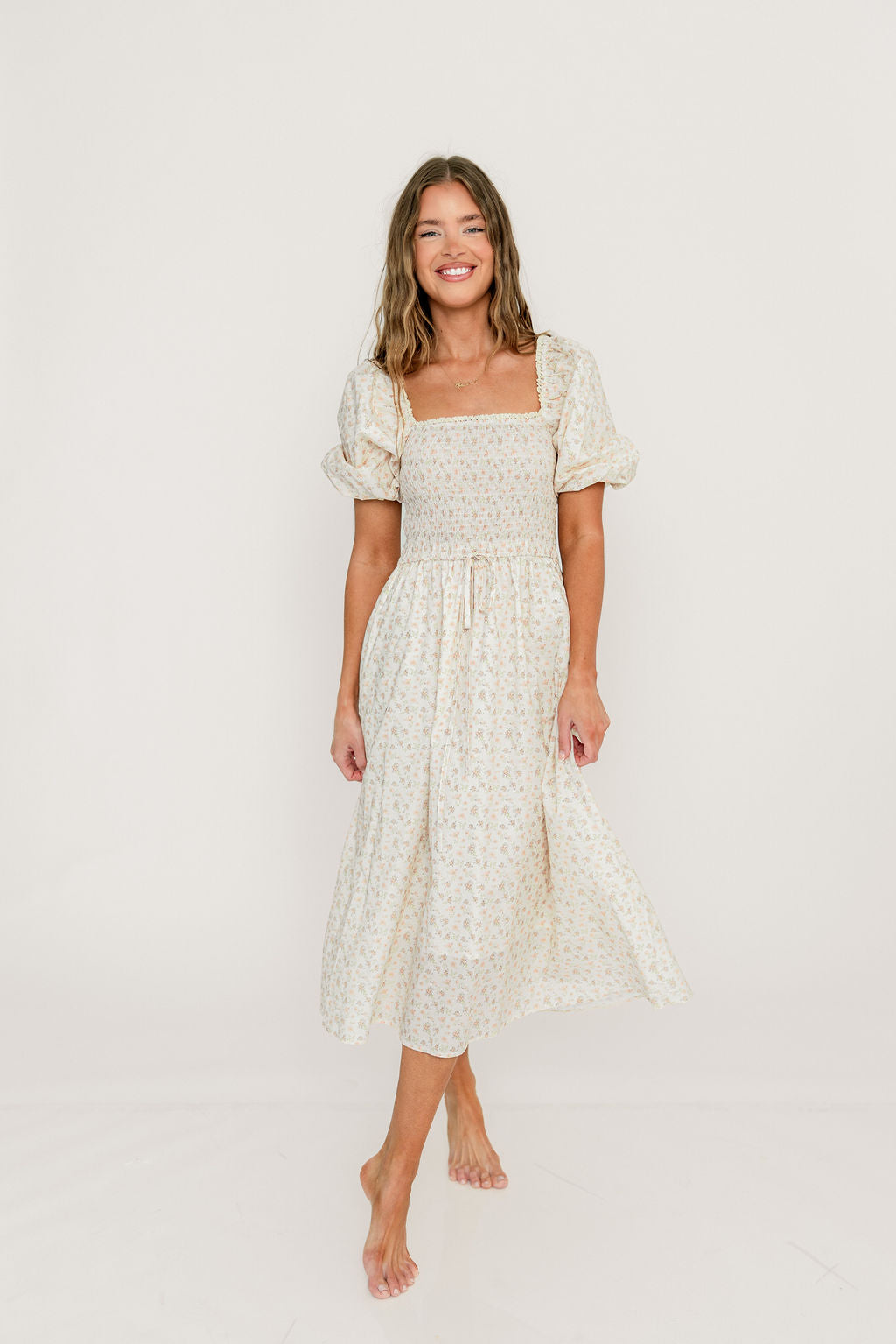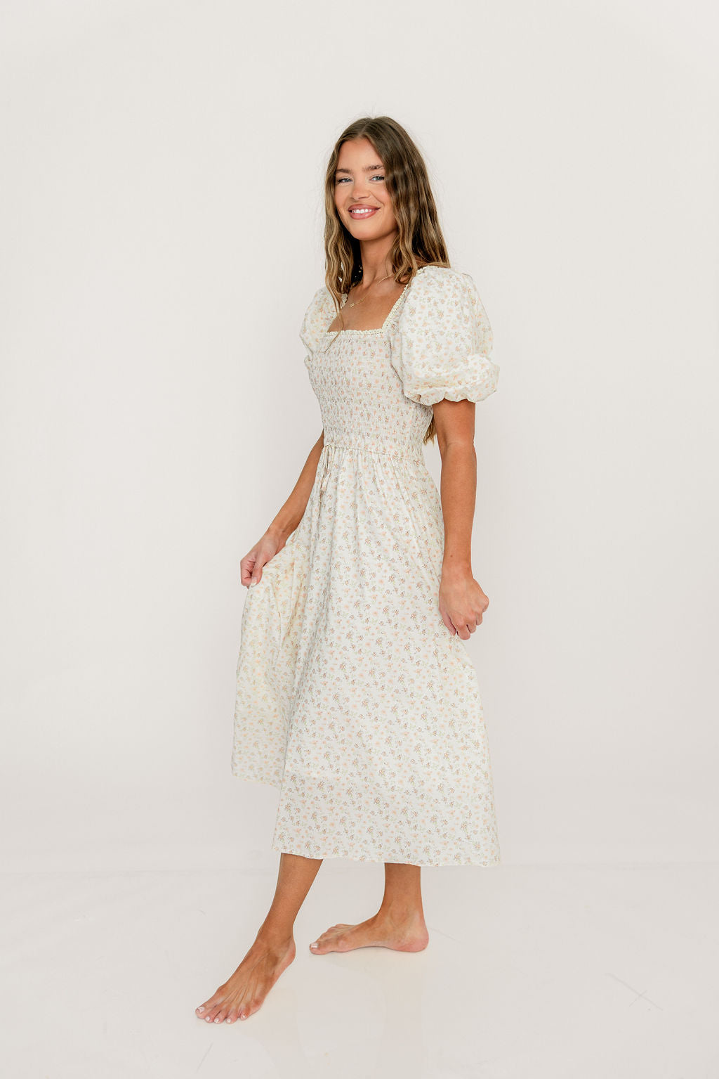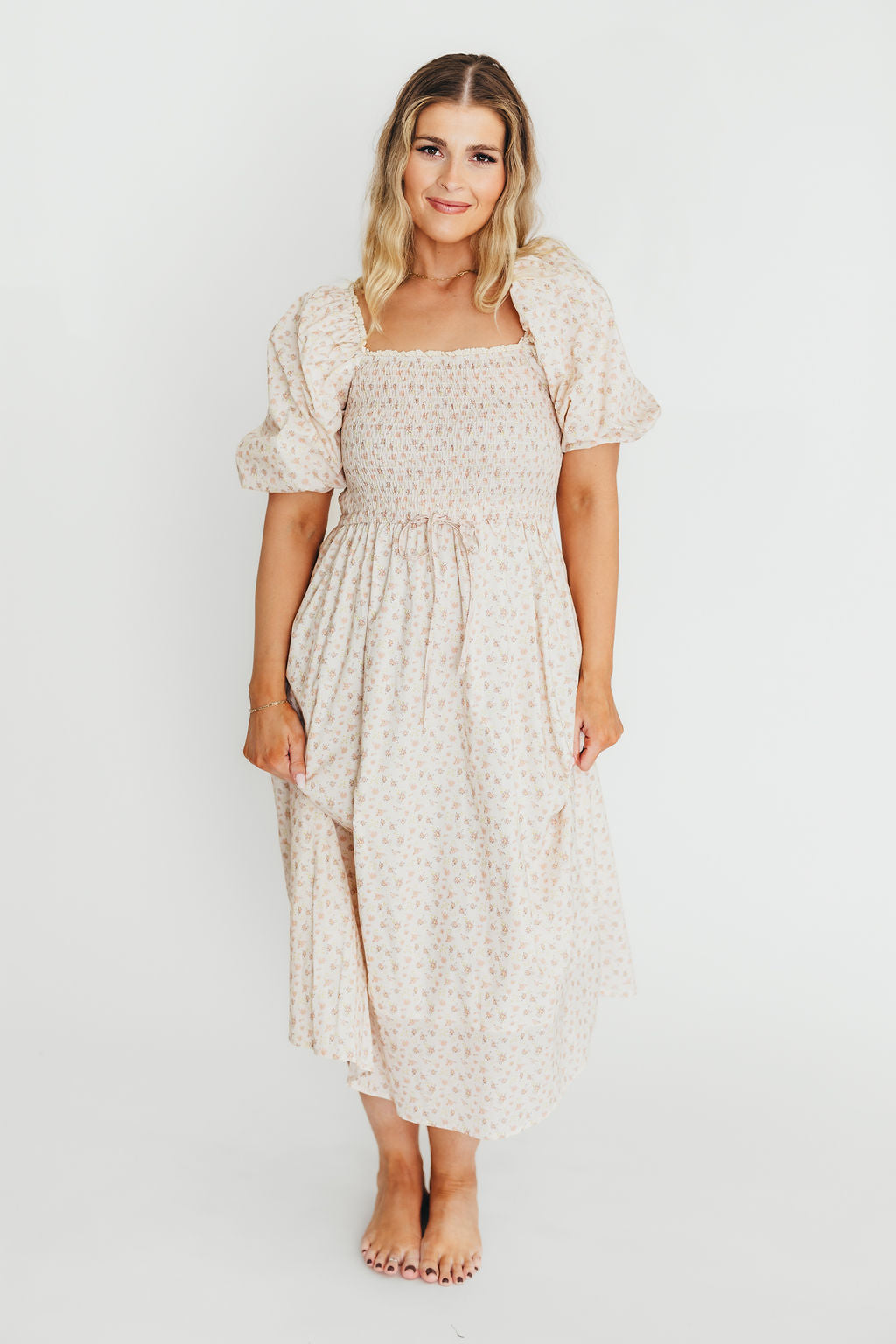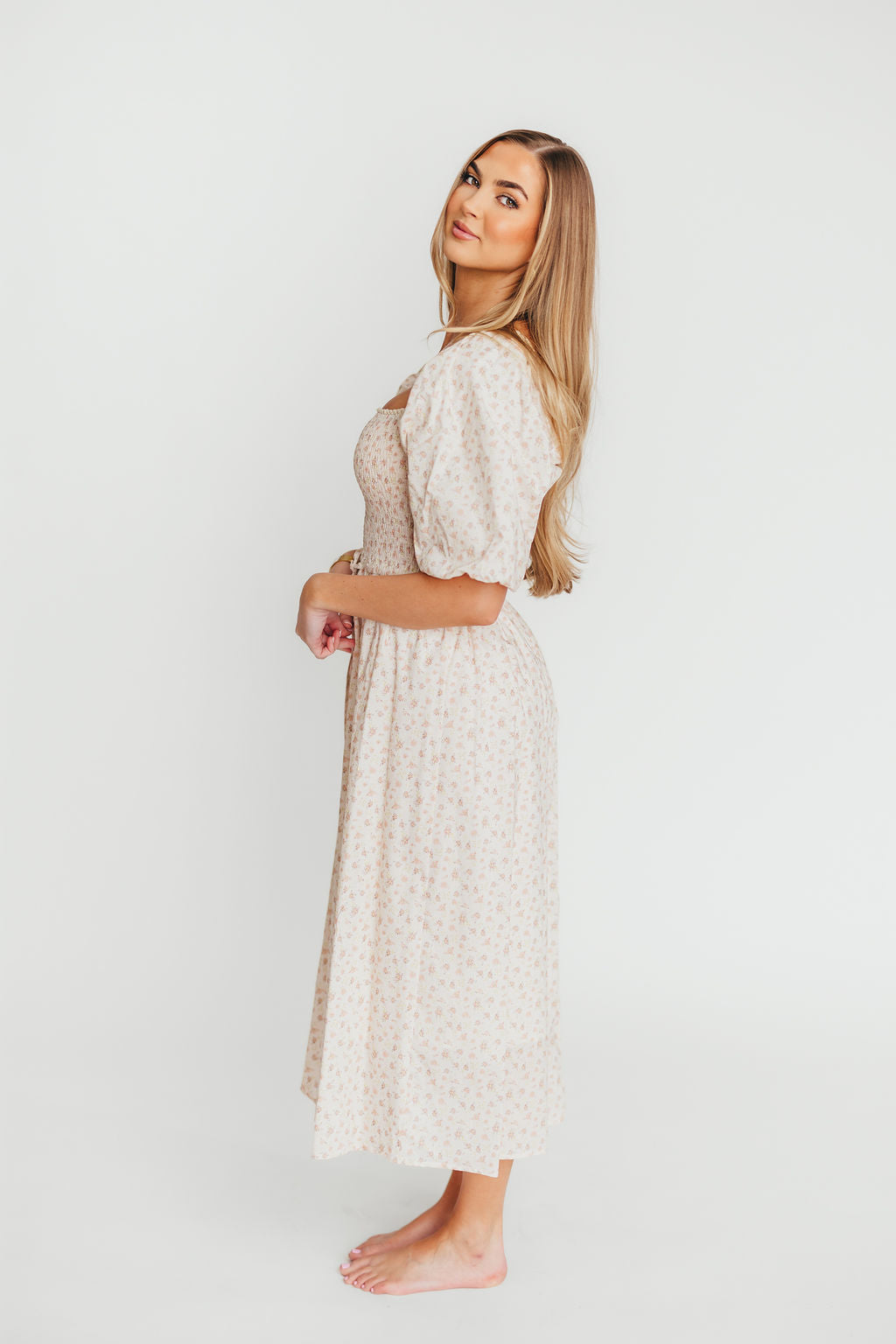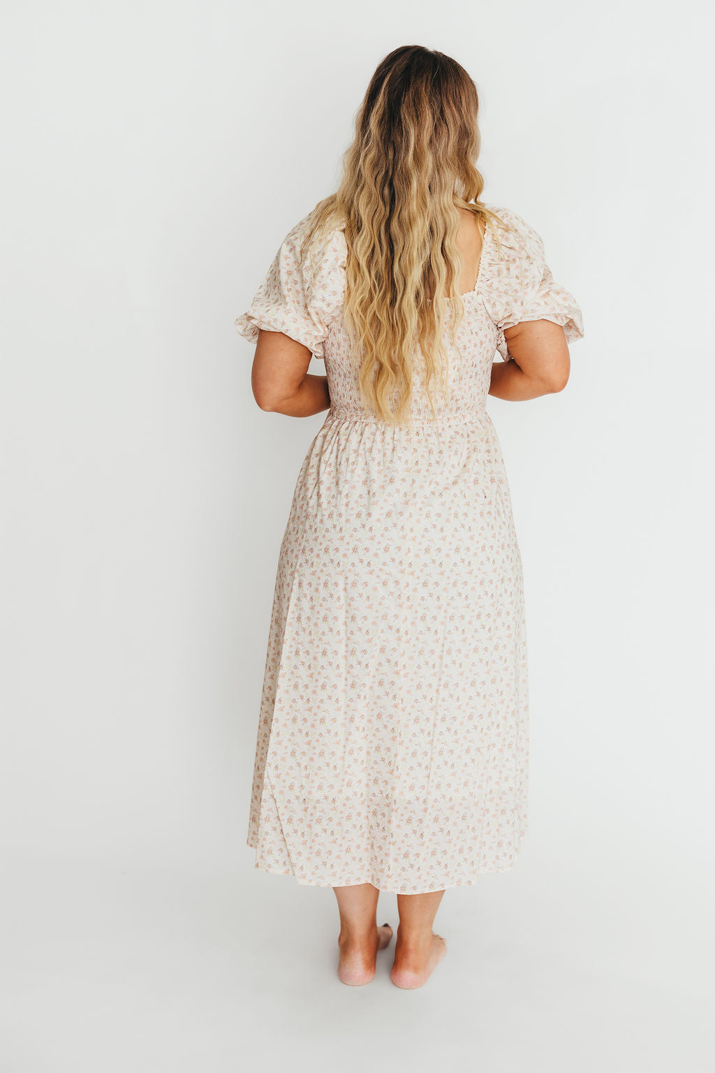 Charlotte Cotton Puff Sleeve Midi Dress in Cream/Pink Floral