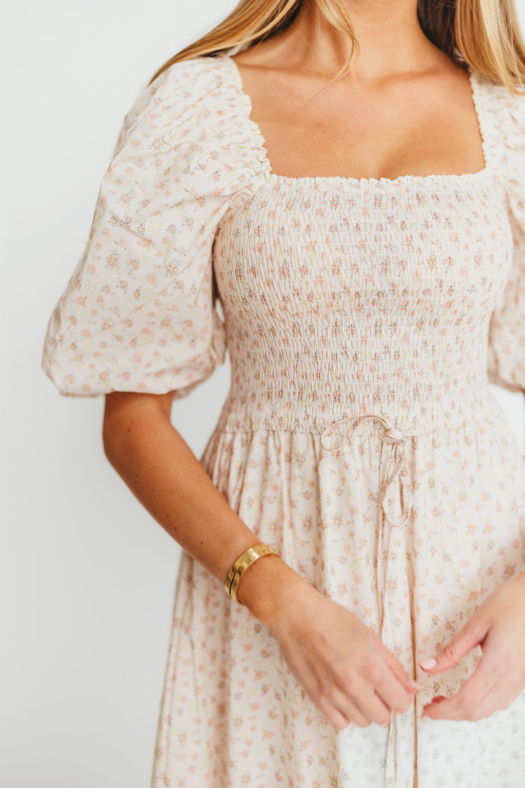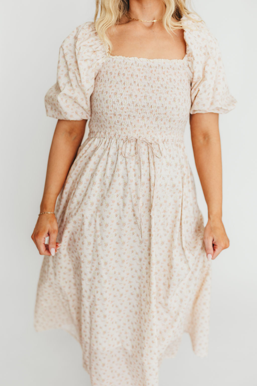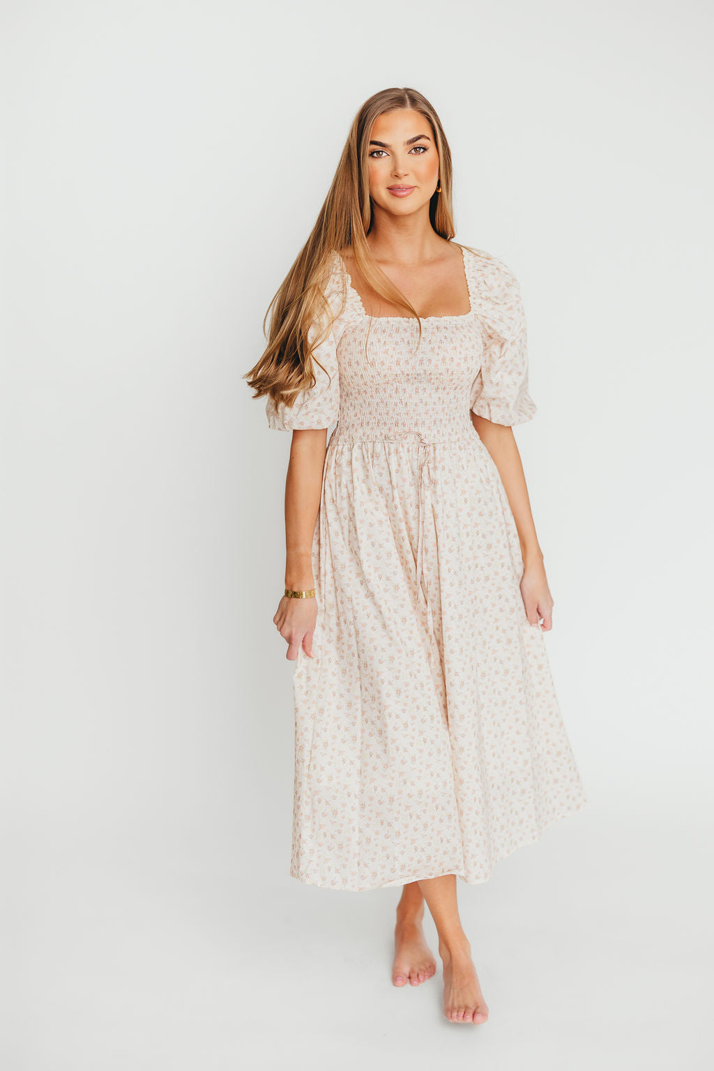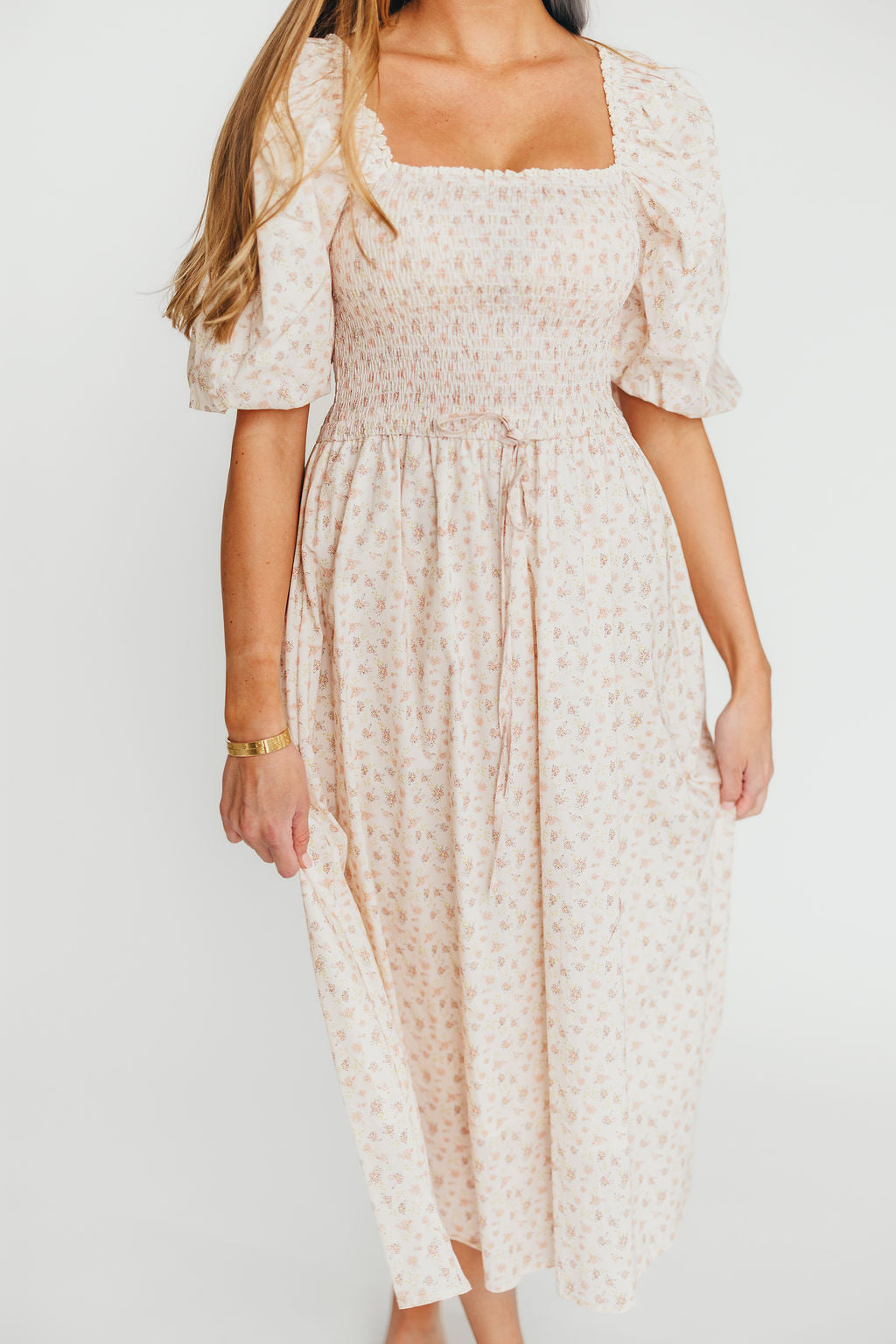 Maeve 100% Cotton Puff Sleeve Midi Dress in Dainty Pink Floral