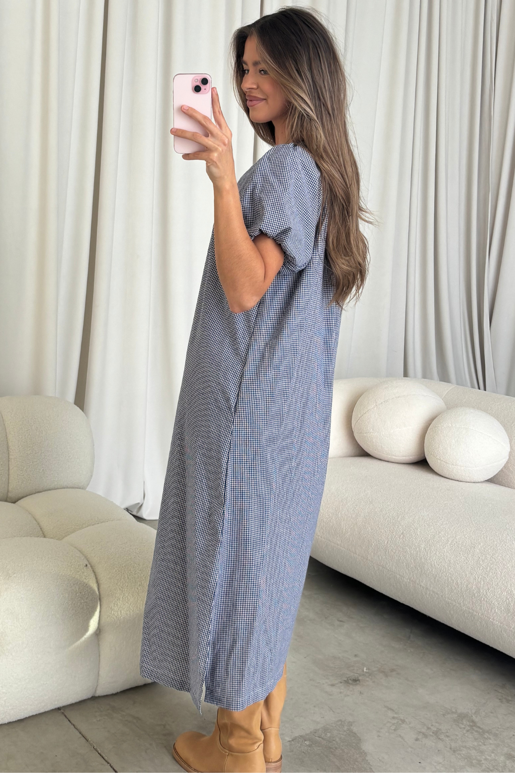 Damaris 100% Cotton Puffed Sleeve Gingham Maxi Dress in Blue