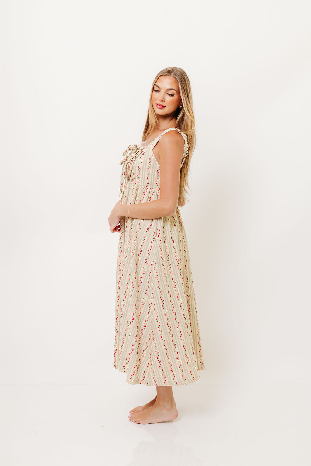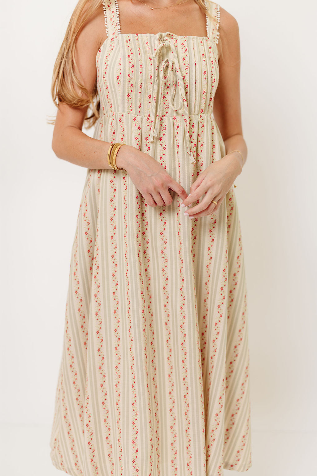 Haley Mae Cotton Floral Embroidered Striped Midi Dress in Sage