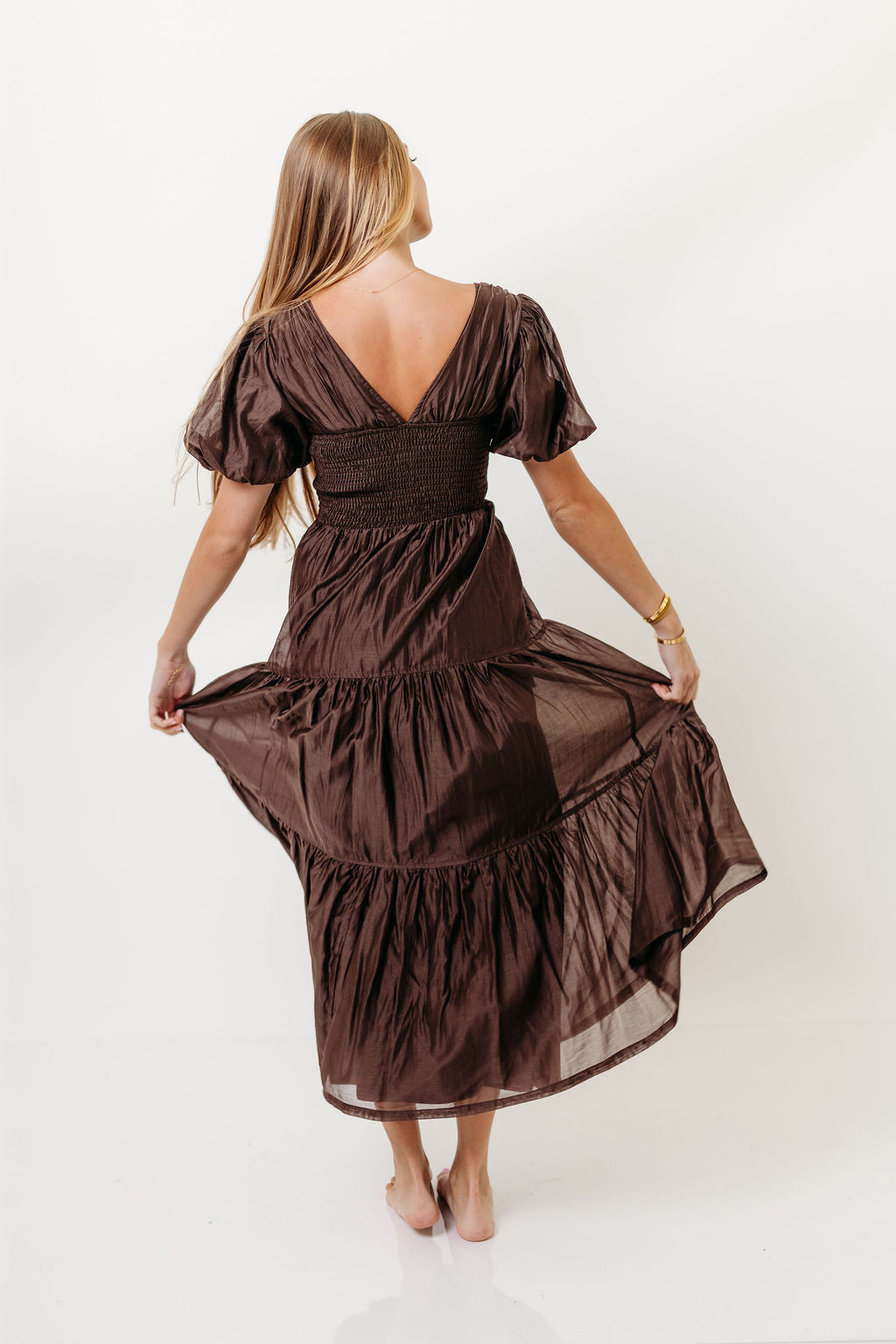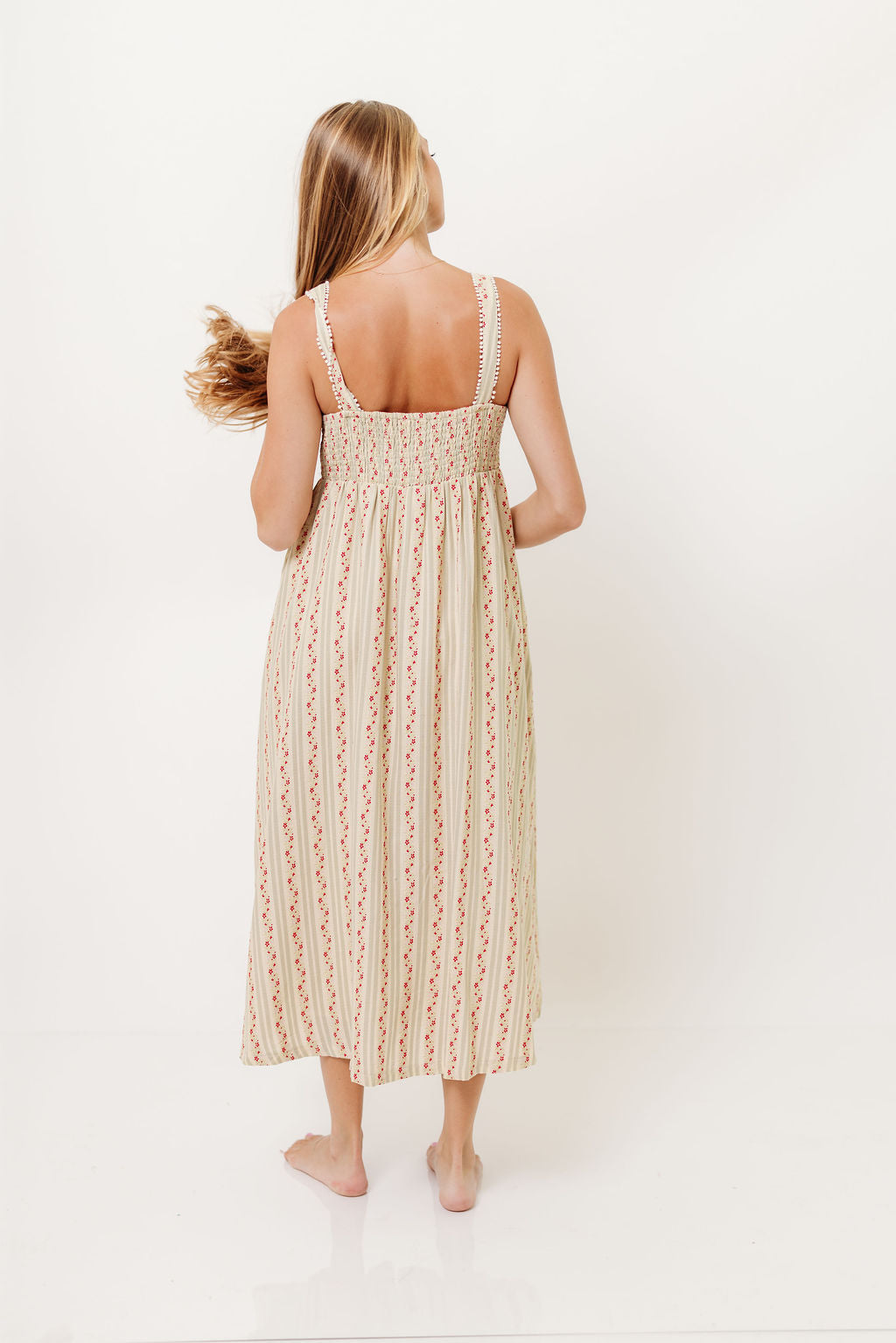 Mercy Cotton Smocked Floral Button Down Maxi Dress in Sepia