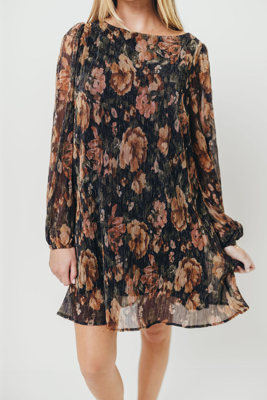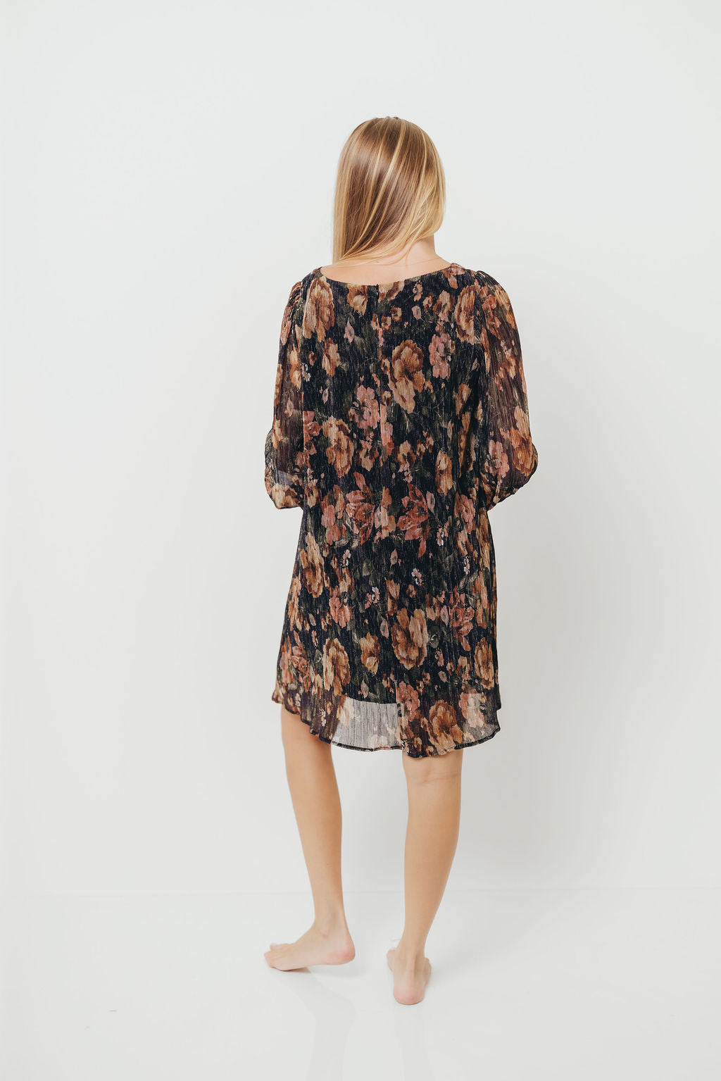 Lorraine Pleated Lurex Floral Print Mini Dress in Black
