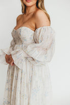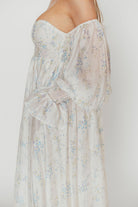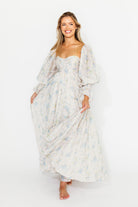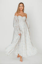 GARMENT DETAILS: Stunning and feminine maxi dress with sweetheart neckline, bustier-style bodice with defined bust (no boning), and sheer long sleeves with elasticized cuffs and ruffle accents. Features a generously cut, sweeping skirt. Lined.