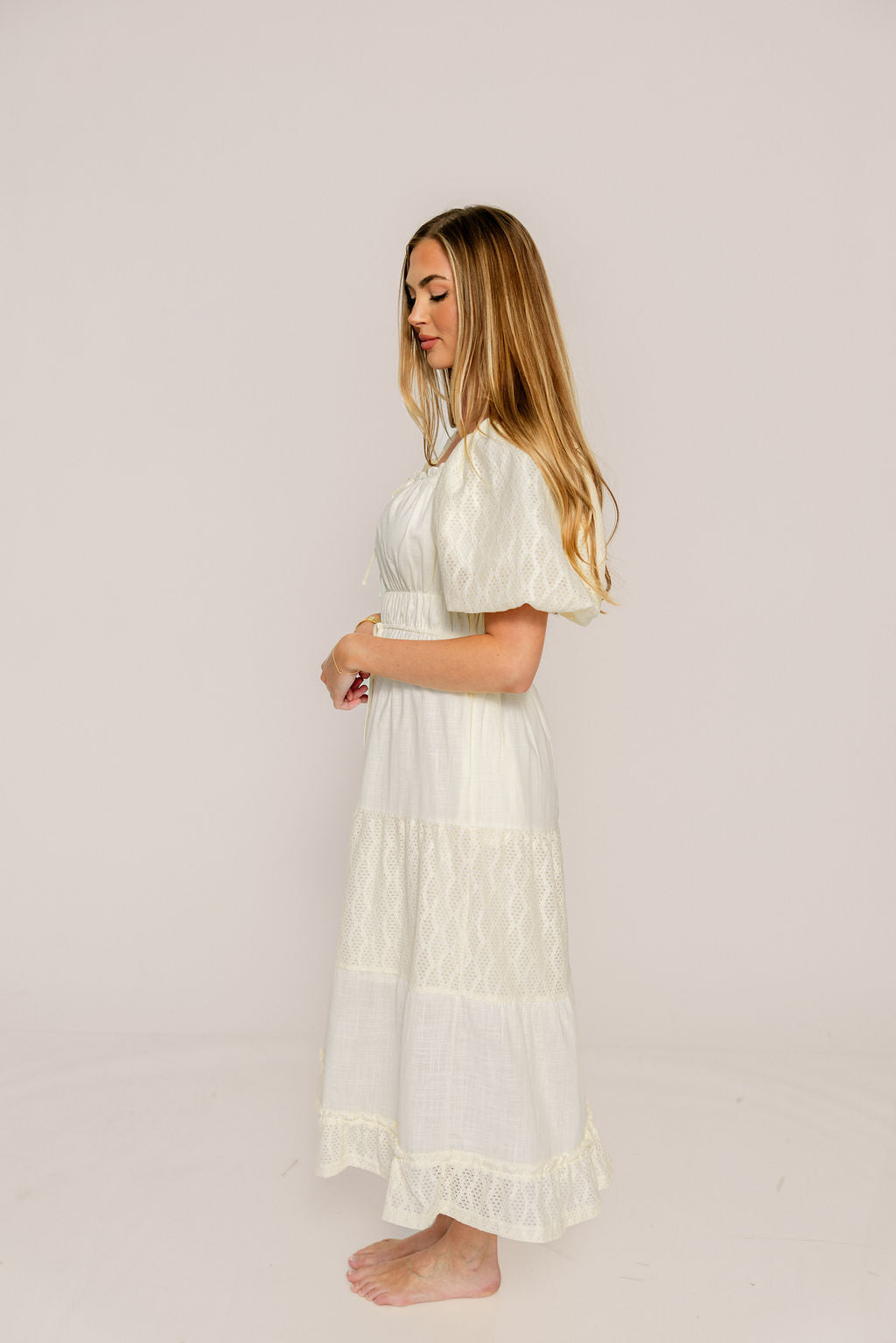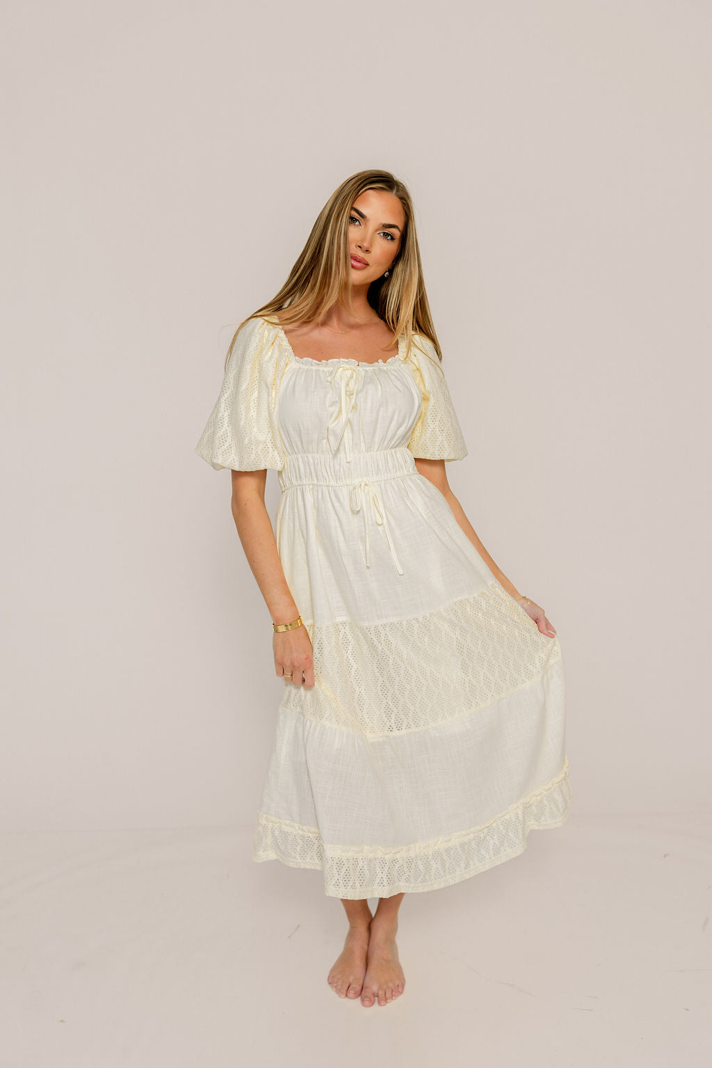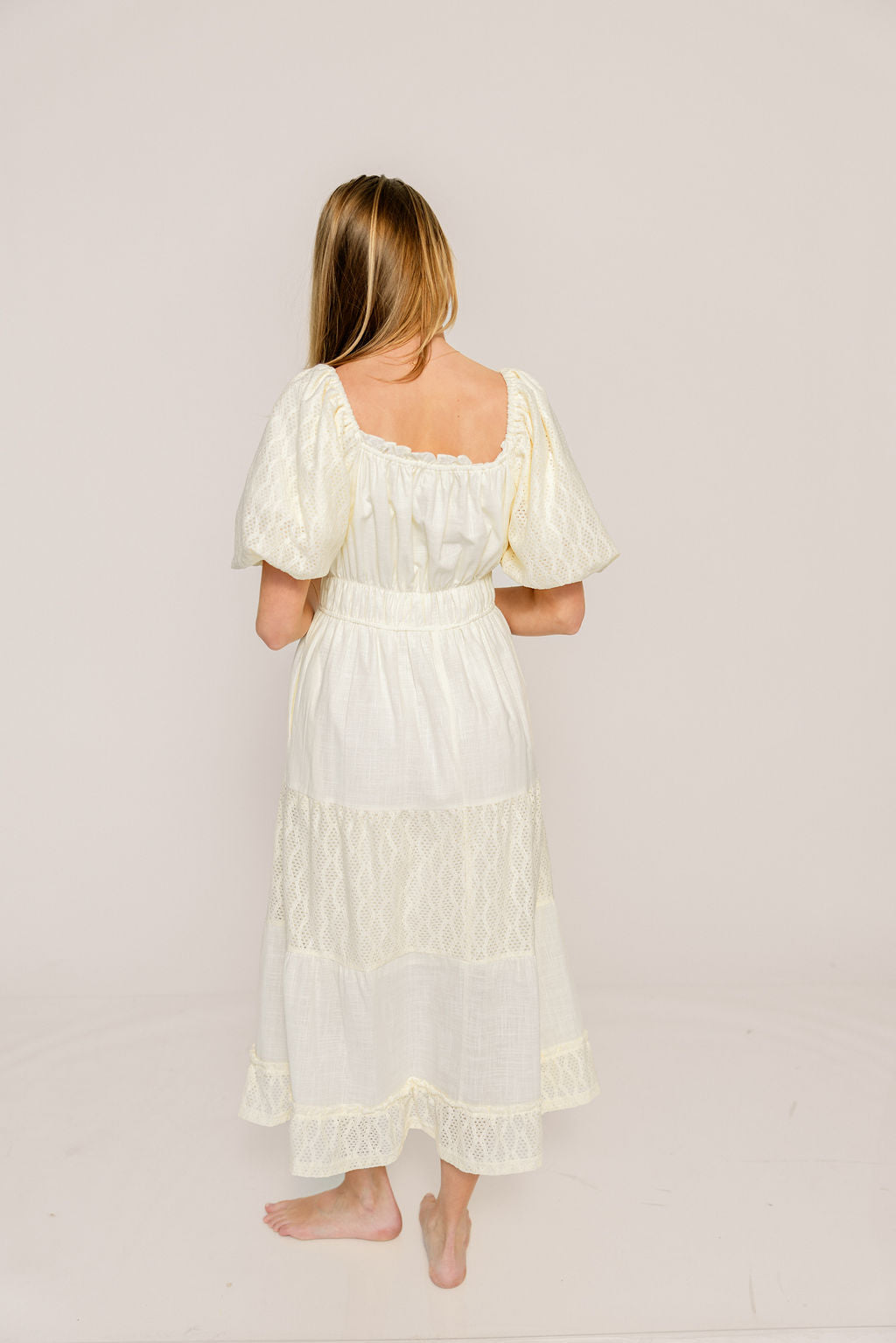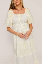 Embrace ethereal charm in the new Noor Midi Dress, a romantic cream concoction that's perfect for vacationing or brunching with the girls. Designed with delicate eyelet lace tiers and puffed sleeves, the Noor offers a flattering fit without sacrificing maximum comfort.