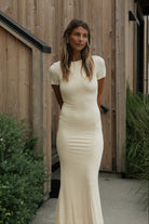 GARMENT DETAILS: Lightweight micro-ribbed knit maxi dress with rounded neckline, short sleeves, and flattering, feminine fit. Features raw edge hem at skirt and sleeves.