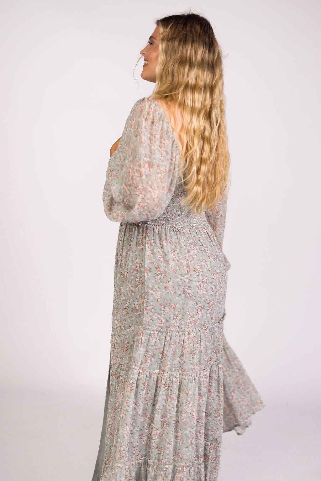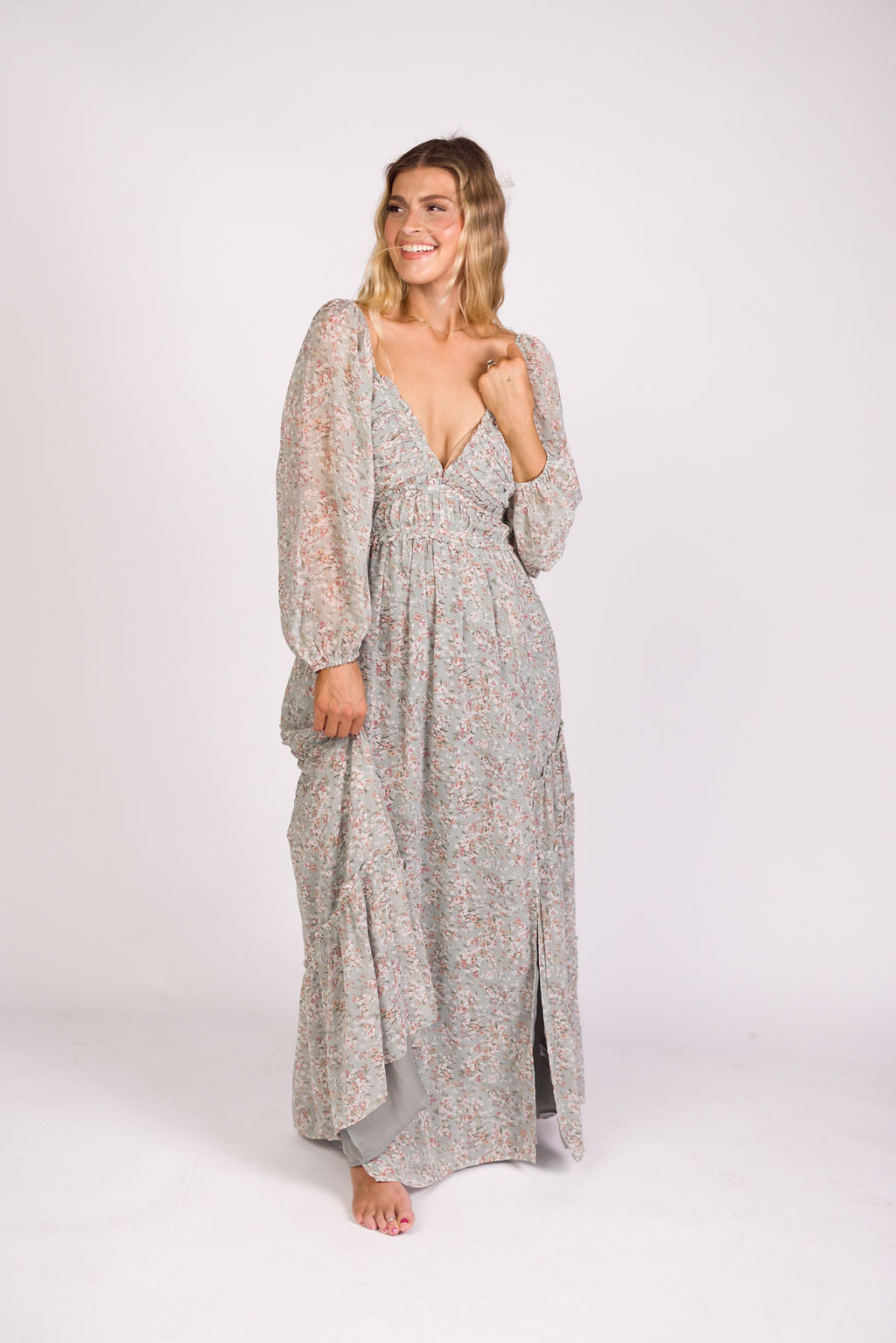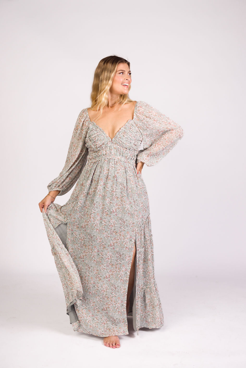 Amelia Ruffle Maxi Dress in Grey/Pink Floral *Final-Sale*