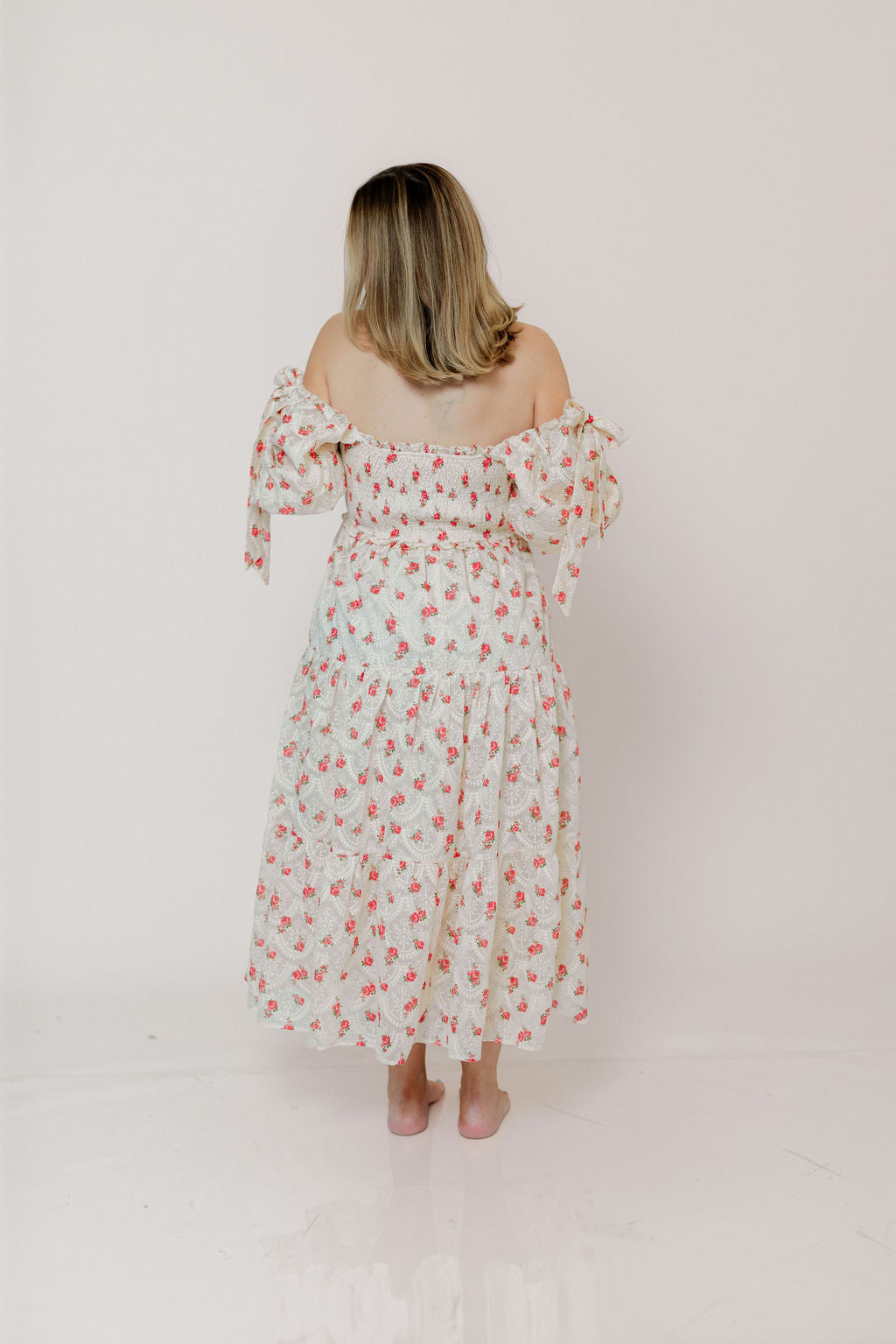GARMENT DETAILS: Elegant midi dress with a square neckline, statement puffed sleeves, and bow accents on the shoulders. Features a fully smocked bodice, with a multi-tiered skirt.