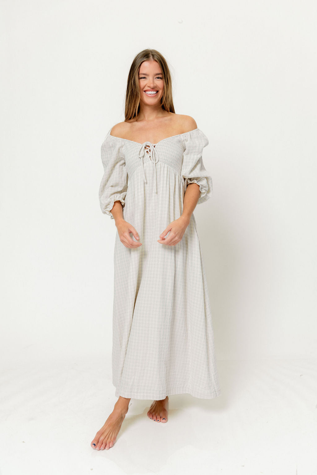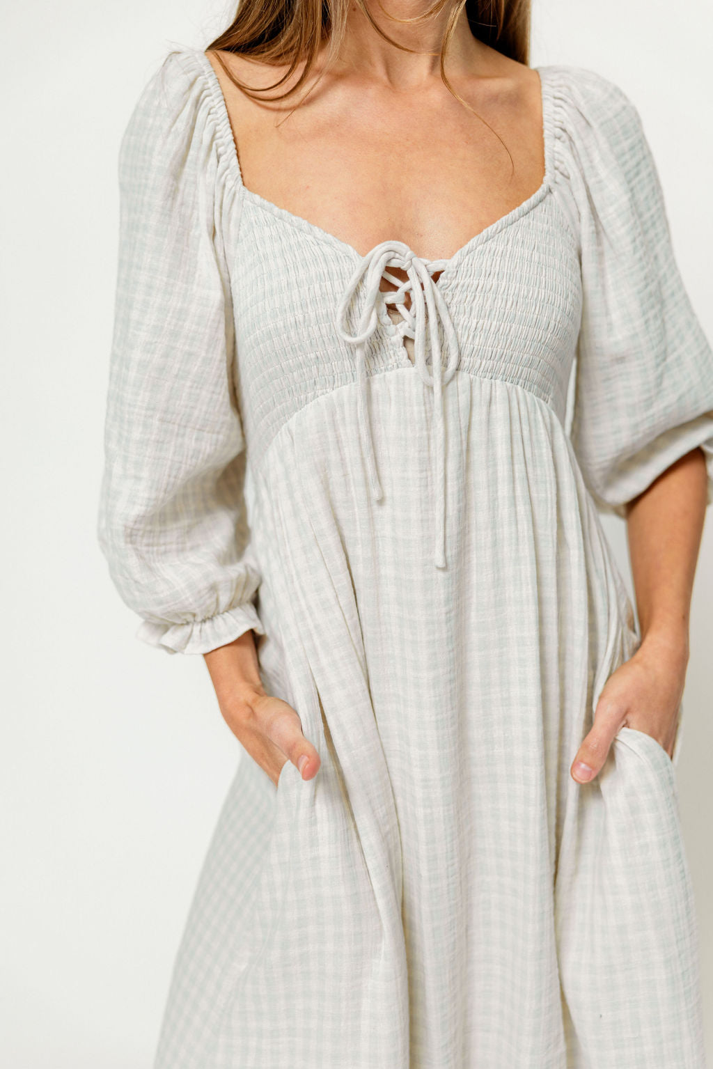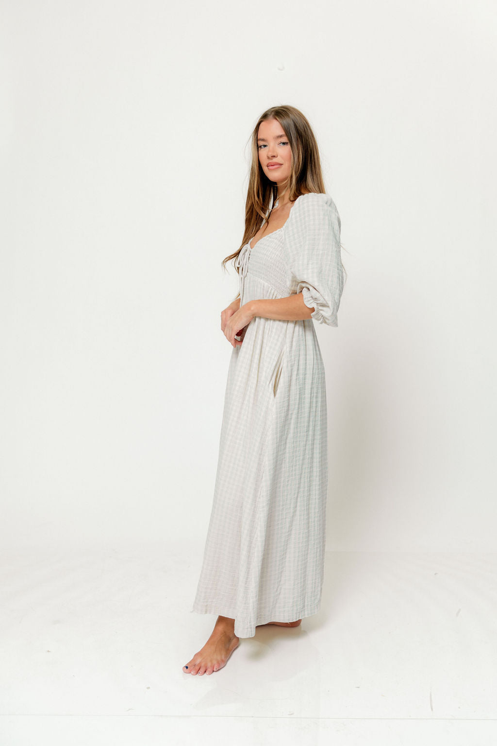 GARMENT DETAILS: Lightweight cotton maxi dress in a charming plaid print, with a sweetheart neckline, 3/4 length sleeves, and an adjustable front tie detail. Features a smocked bodice, side pockets, and ruffle accents. This colorway has a full lining.