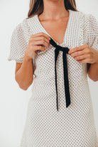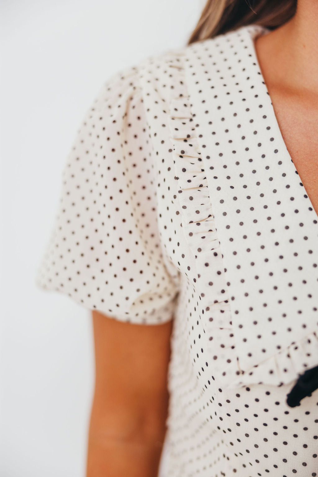 GARMENT DETAILS: Lightweight mini dress in a vintage-inspired polka dot pattern. Features a V-neckline with lapel-style ruffled collar, front bow detail, and puffed short sleeves. Lined.