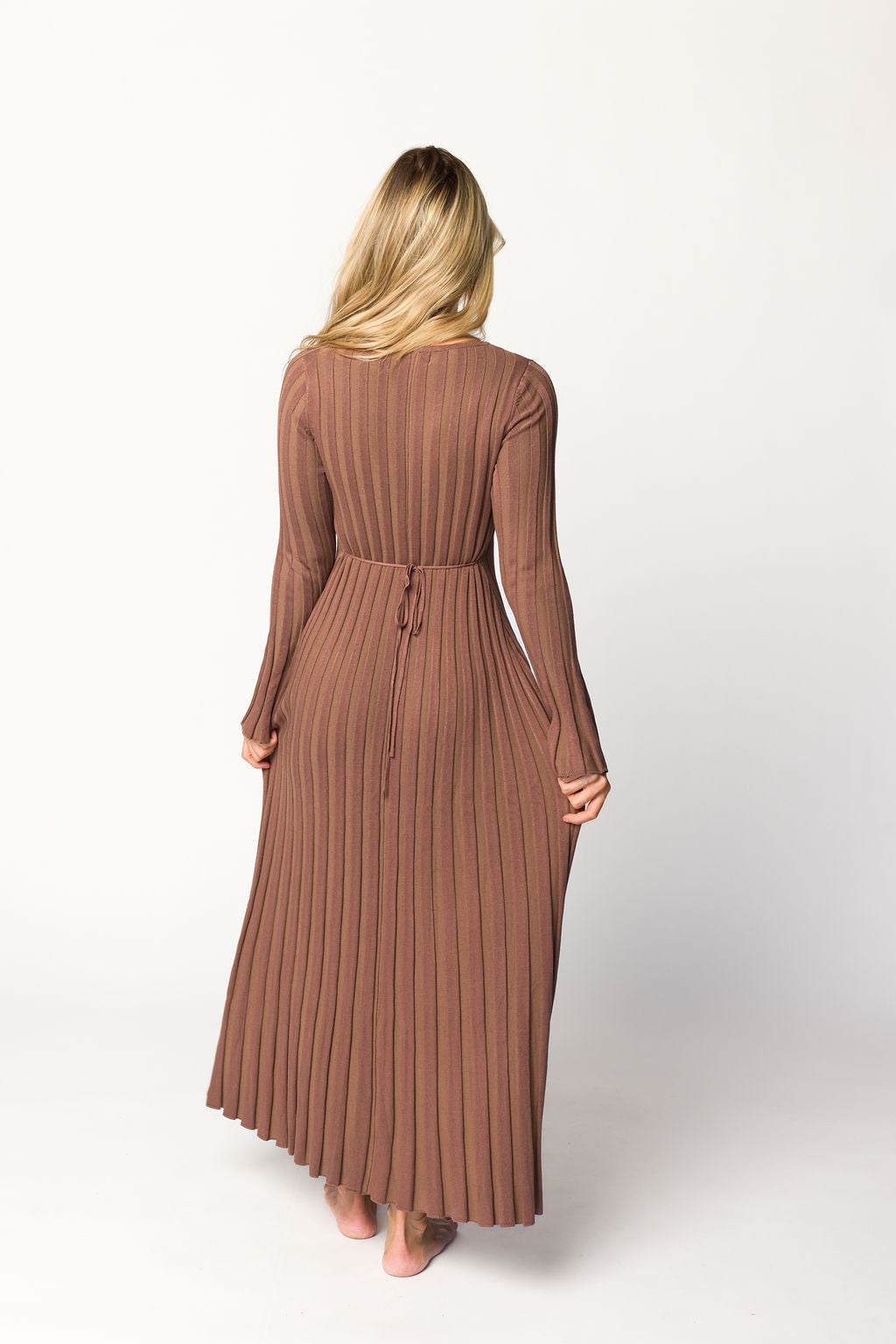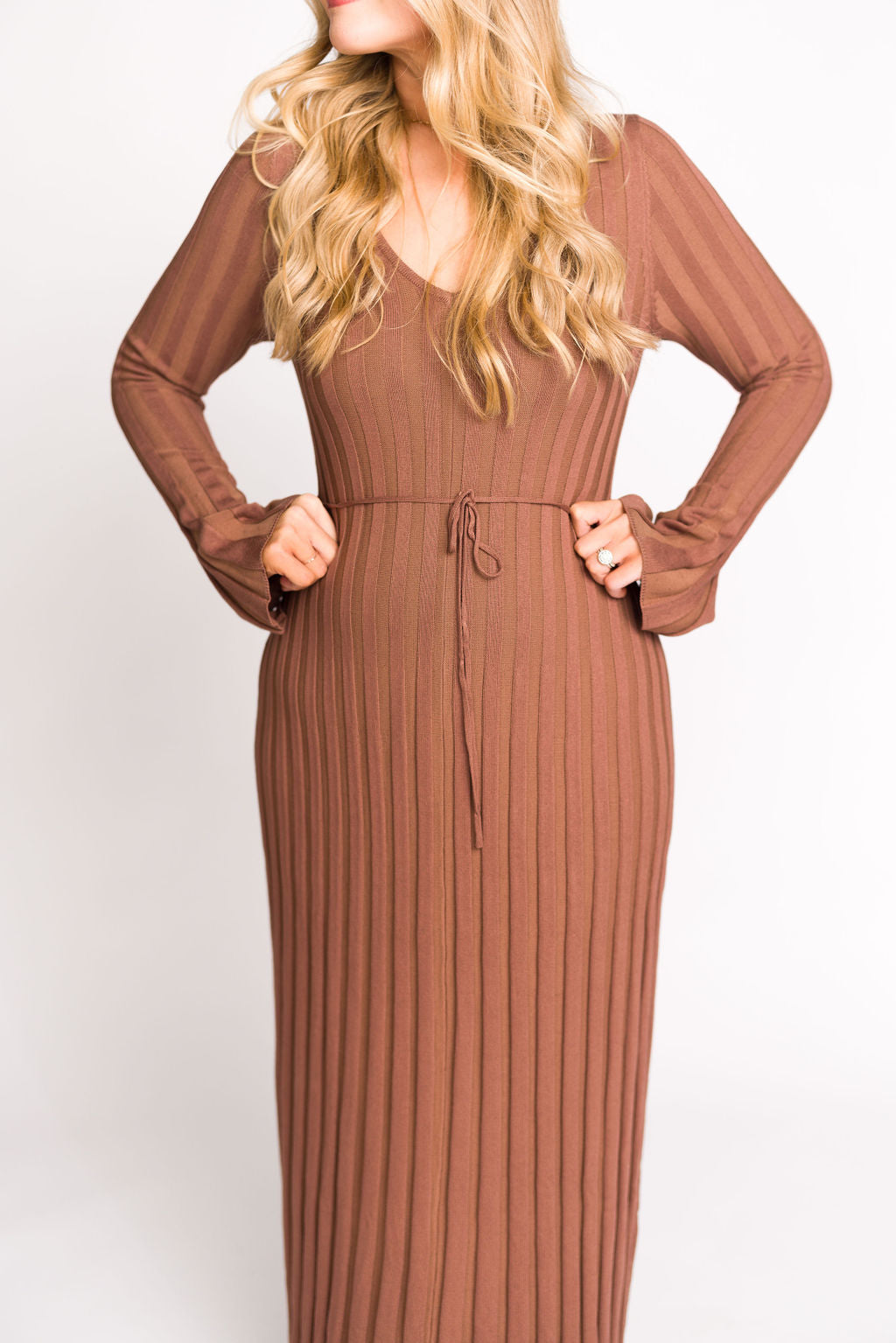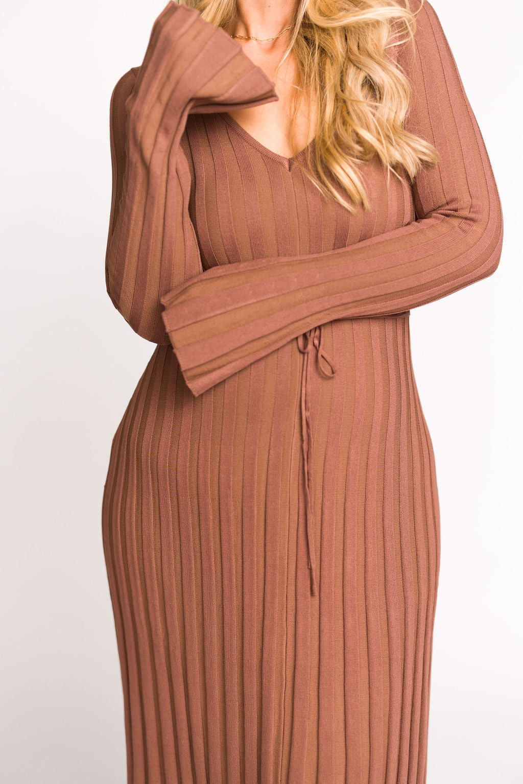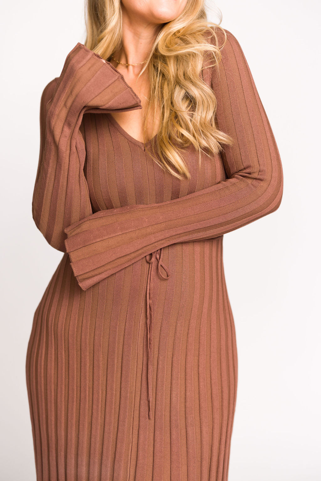 GARMENT DETAILS: Mid-weight, silky ribbed knit maxi dress with long sleeves and V-neckline. Finished with an attached, adjustable waist tie.