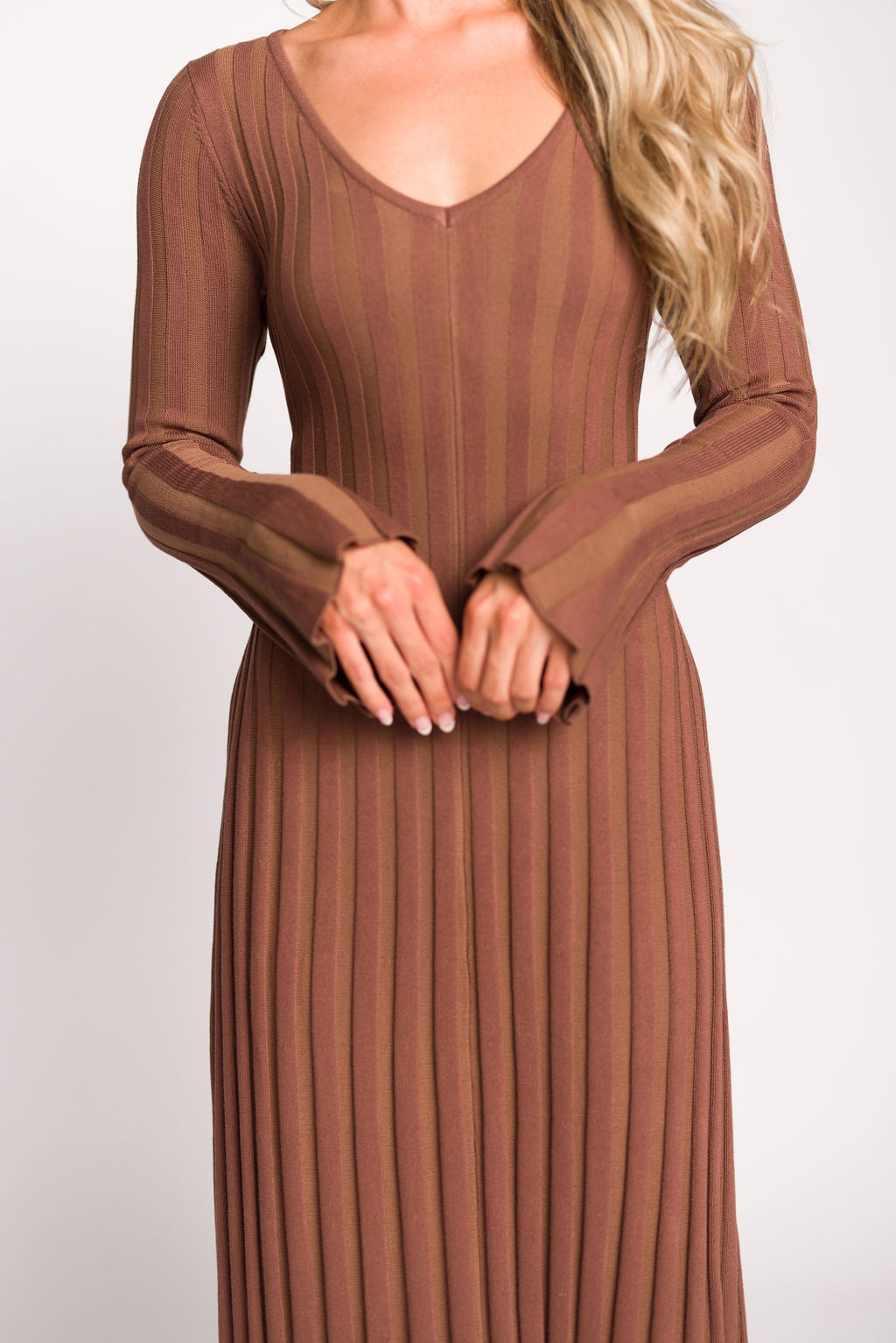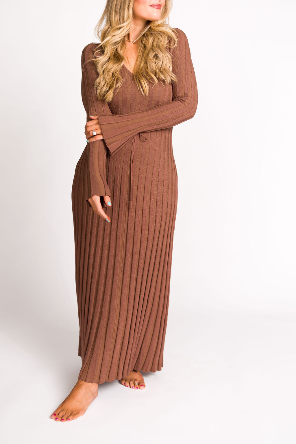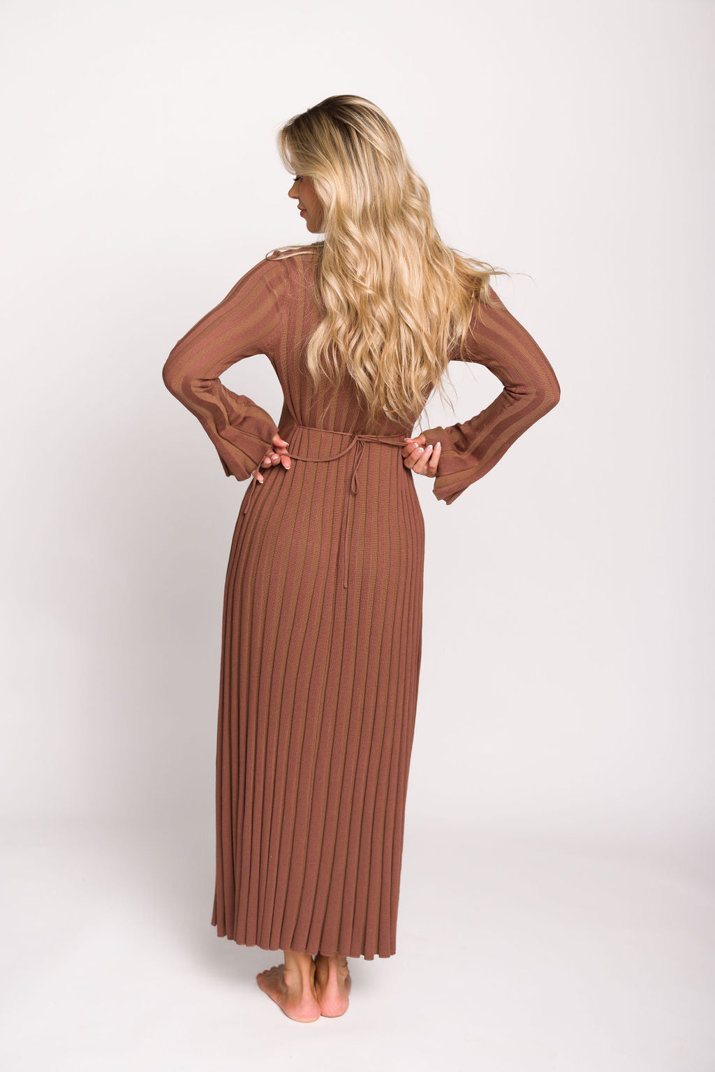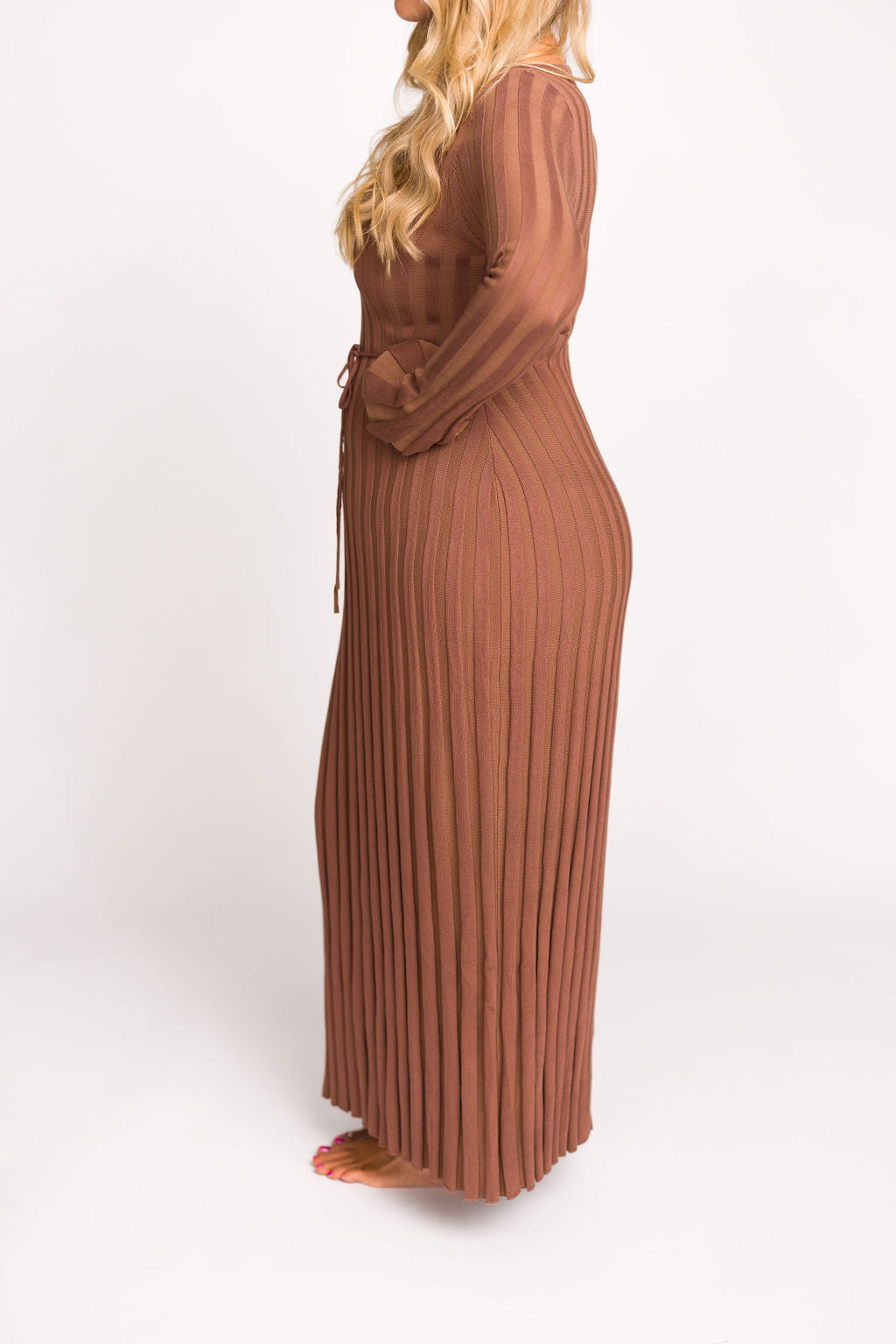 GARMENT DETAILS: Mid-weight, silky ribbed knit maxi dress with long sleeves and V-neckline. Finished with an attached, adjustable waist tie.