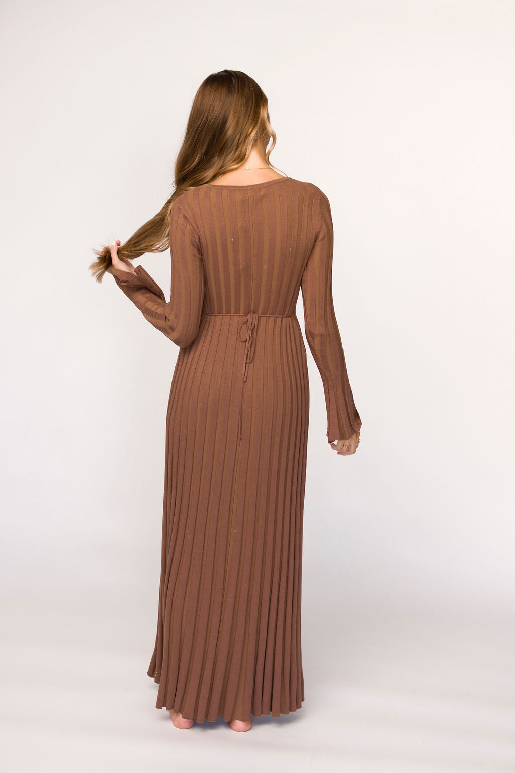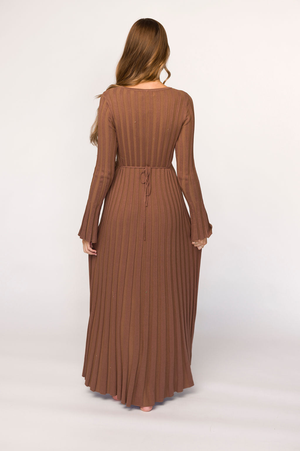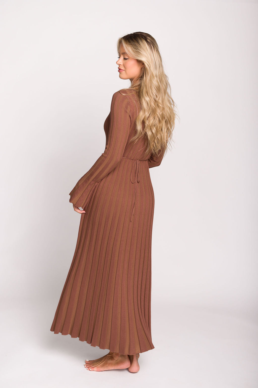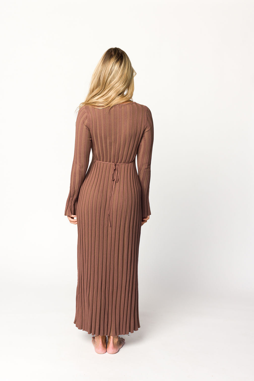 GARMENT DETAILS: Mid-weight, silky ribbed knit maxi dress with long sleeves and V-neckline. Finished with an attached, adjustable waist tie.