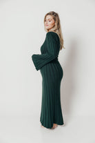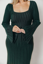 GARMENT DETAILS: Glamorous ribbed knit maxi dress with flattering square neckline, long flared sleeves, and a feminine fit-and-flare silhouette.