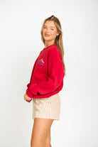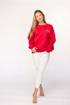 Introducing the Aspen Ski Camp Sweatshirt, perfect for chilly days on the slopes (or in the lodge drinking hot chocolate). Featuring a classic crewneck and darling graphics, this top is sure to keep you cozy while adding a pop of cherry red to your winter outfit!