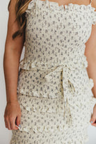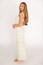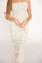 GARMENT DETAILS: Smocked 100% cotton maxi dress with square neckline, adjustable tie shoulder straps, and a fitted, sheath-style silhouette. Features a multi-tiered skirt with ruffle accents and a front tie detail. Lined.