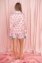GARMENT DETAILS: Silky satin pajama set. Top features a folded collar, long sleeves, and functional front button placket. Shorts feature an elasticized waistband. Both pieces feature contrast color edges and ruffle tie accents.