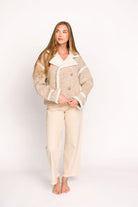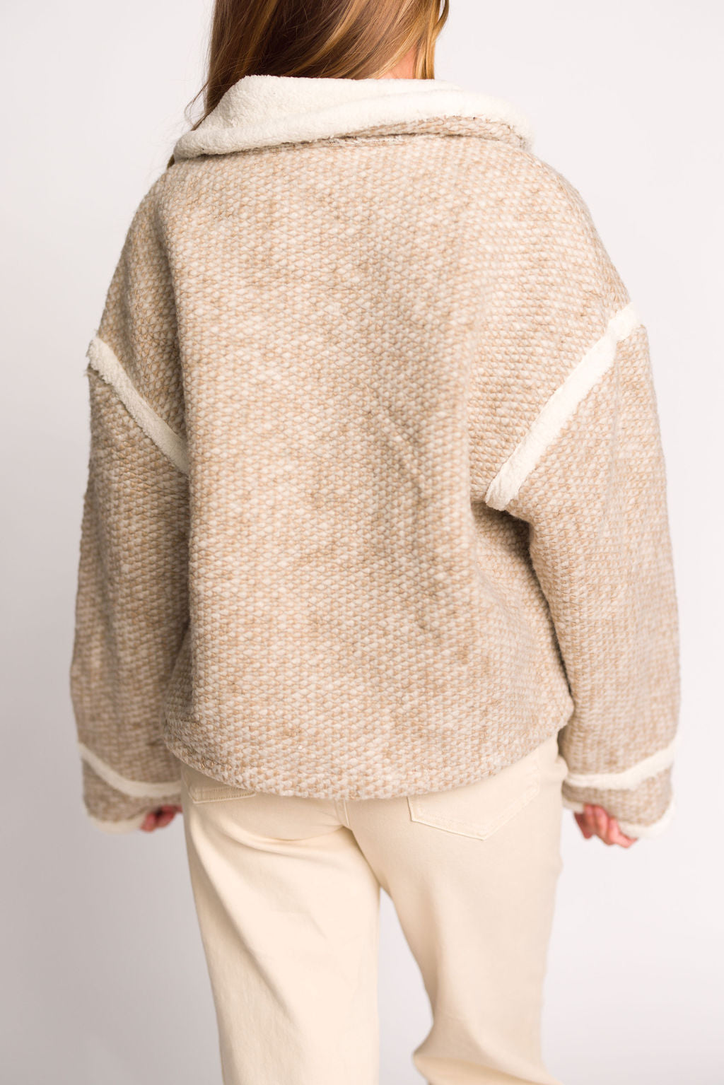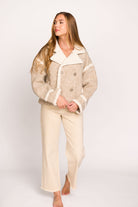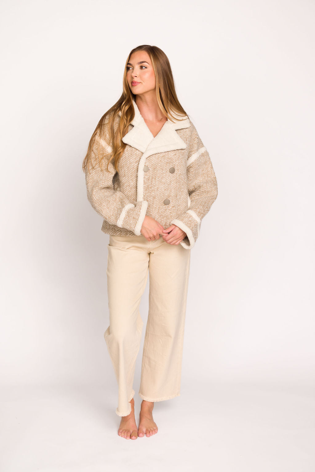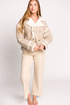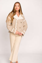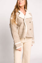 Beige has never looked better! This comfy cozy jacket arrives just in time for cooler weather; you'll love its spread collar, fluffy shearling accents, and warm color combination. Pair it with your favorite athleisure set for a fun little outfit!