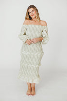 GARMENT DETAILS: Fully smocked midi dress in a comfortable, stretchy design, with 3/4 length sleeves, off-the-shoulder neckline, and multi-tiered skirt. Features ruffle accents throughout, and a fitted, flattering silhouette.