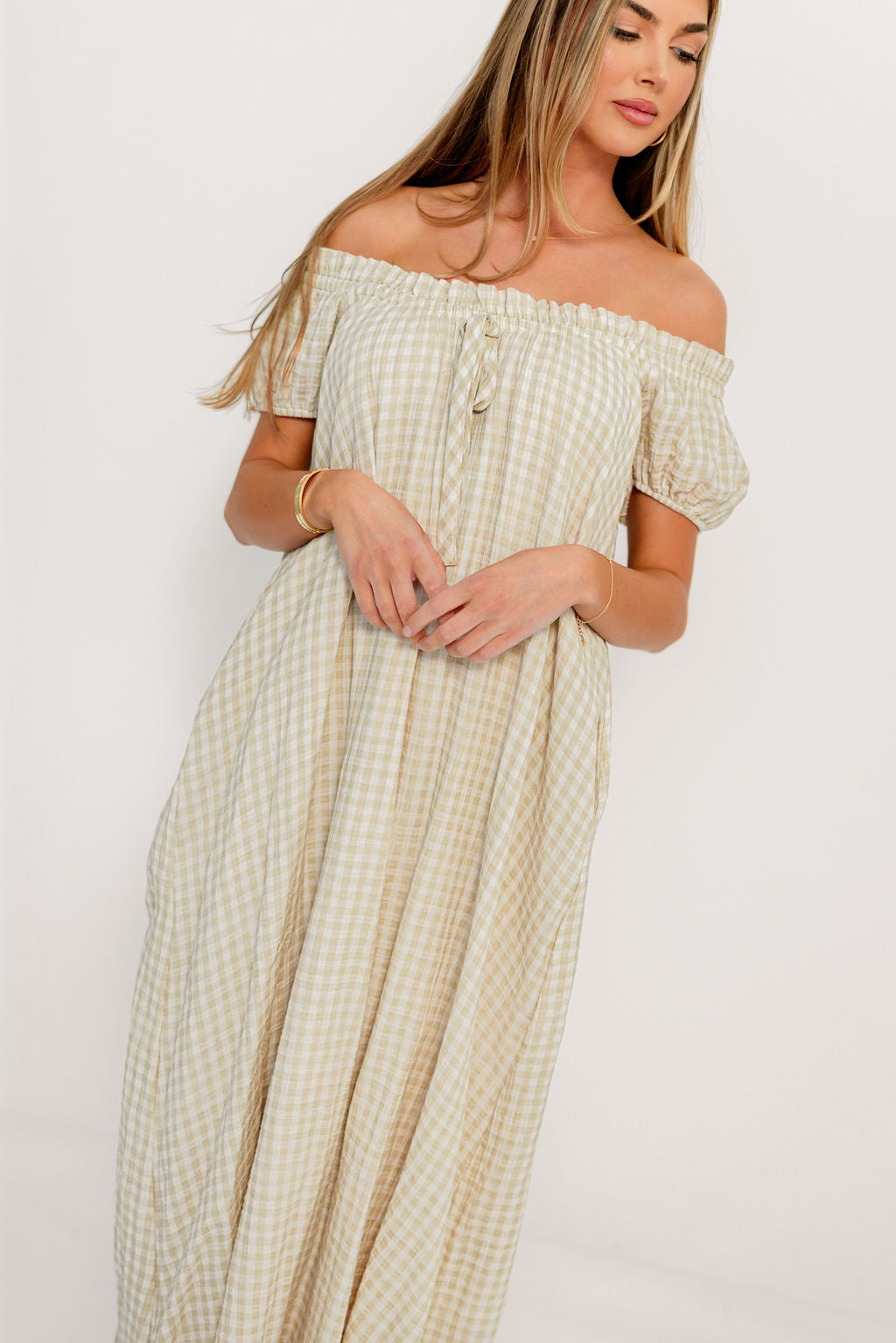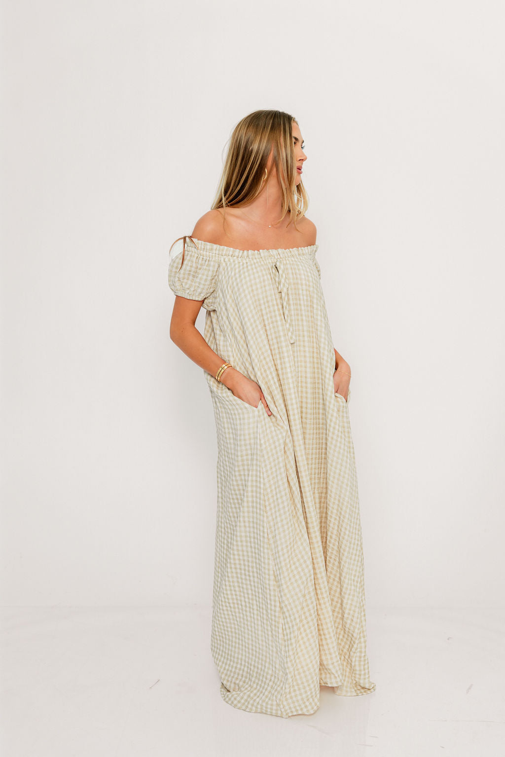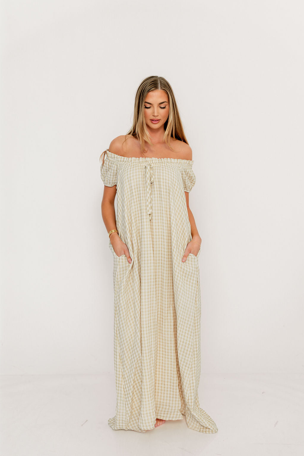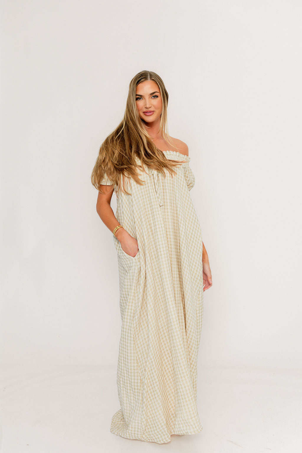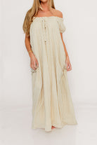 GARMENT DETAILS: Charming, relaxed-fit maxi dress with short puffed sleeves, scooped neckline, and front tie detail. Features ruffled trim and dual side pockets.