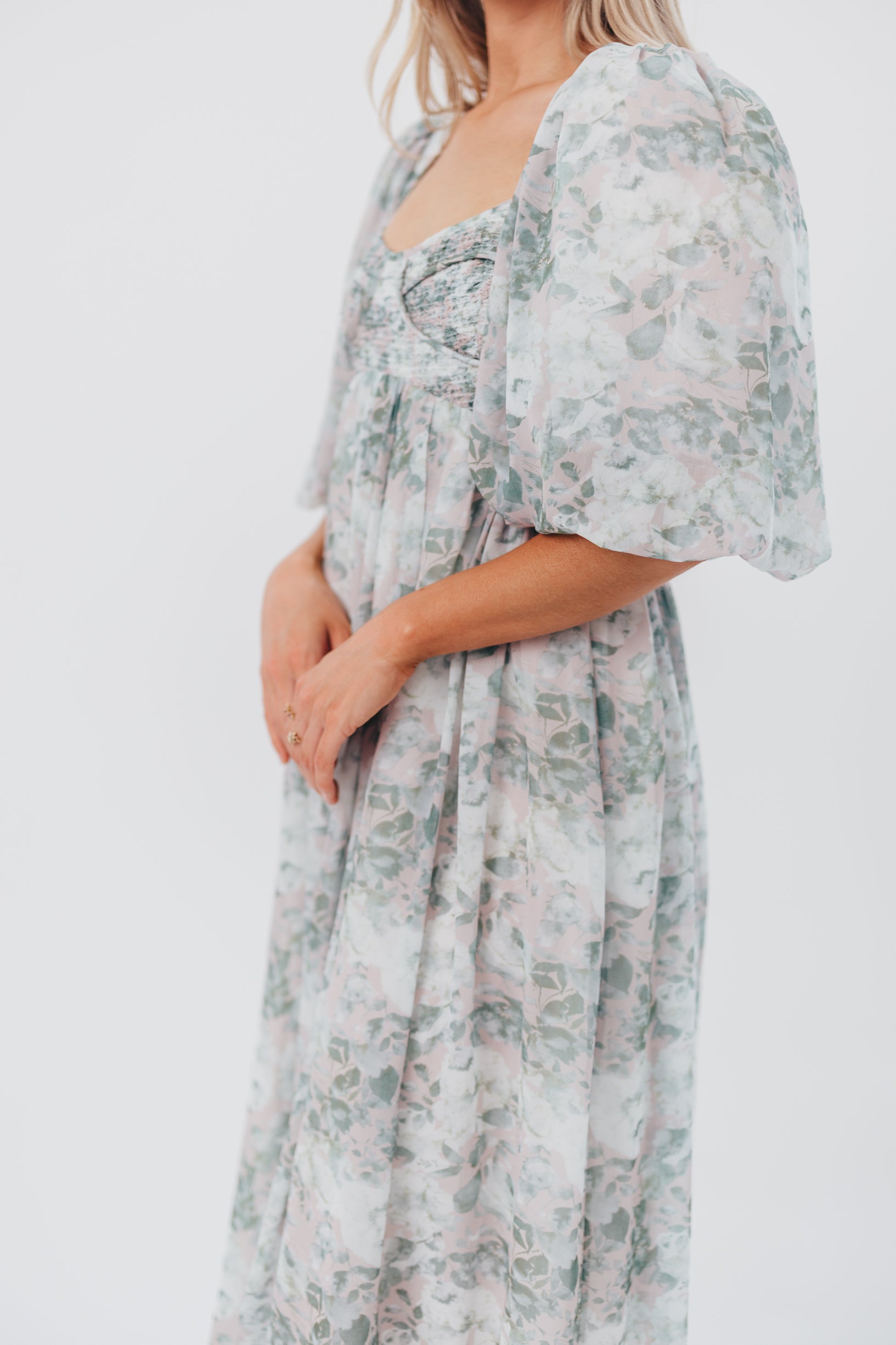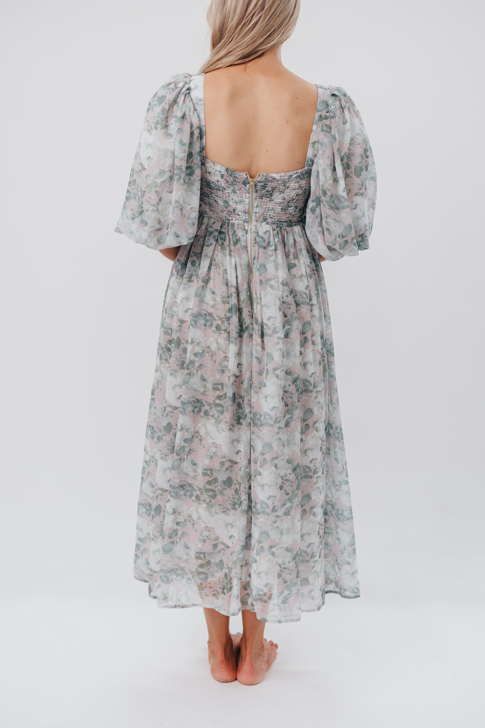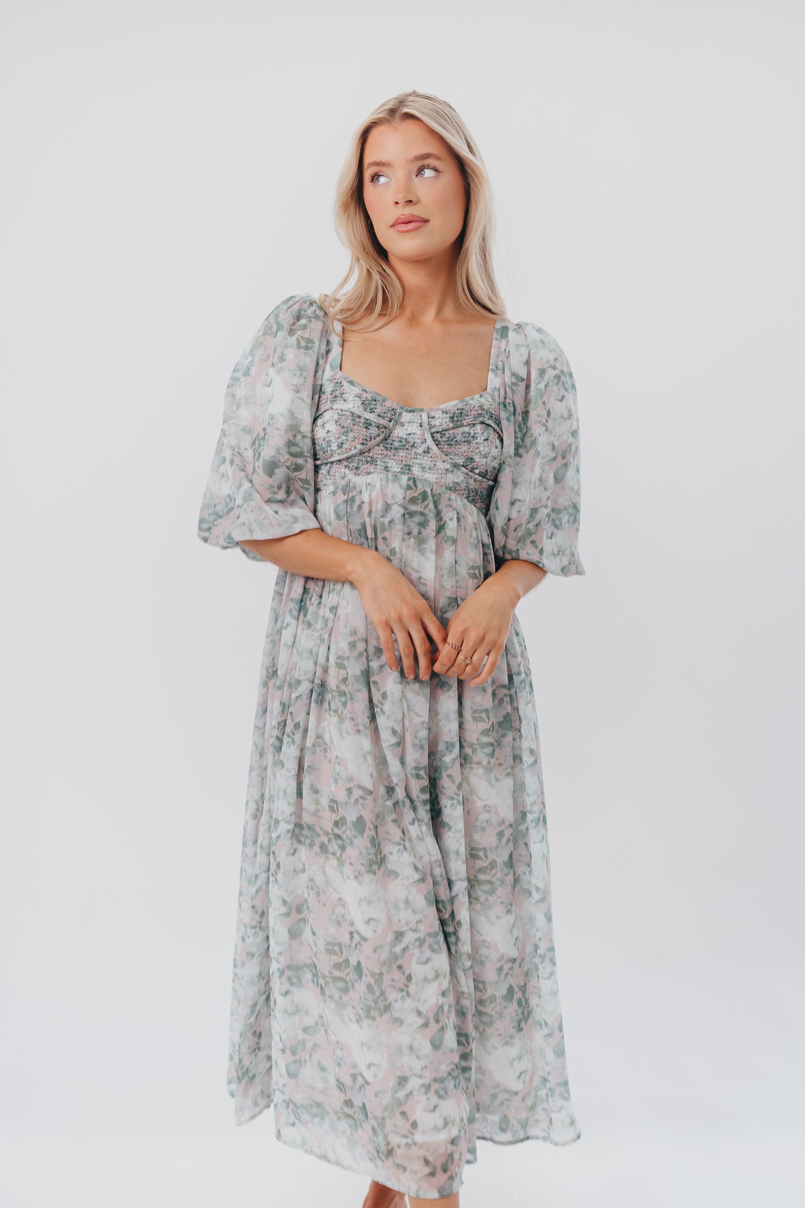 GARMENT DETAILS: Lightweight maxi in a floral print. Features an empire waist silhouette and structured bustier-style bodice, with smocking in the back. Finished with statement puffed sleeves, voluminous skirt, and back zipper. Lined.