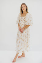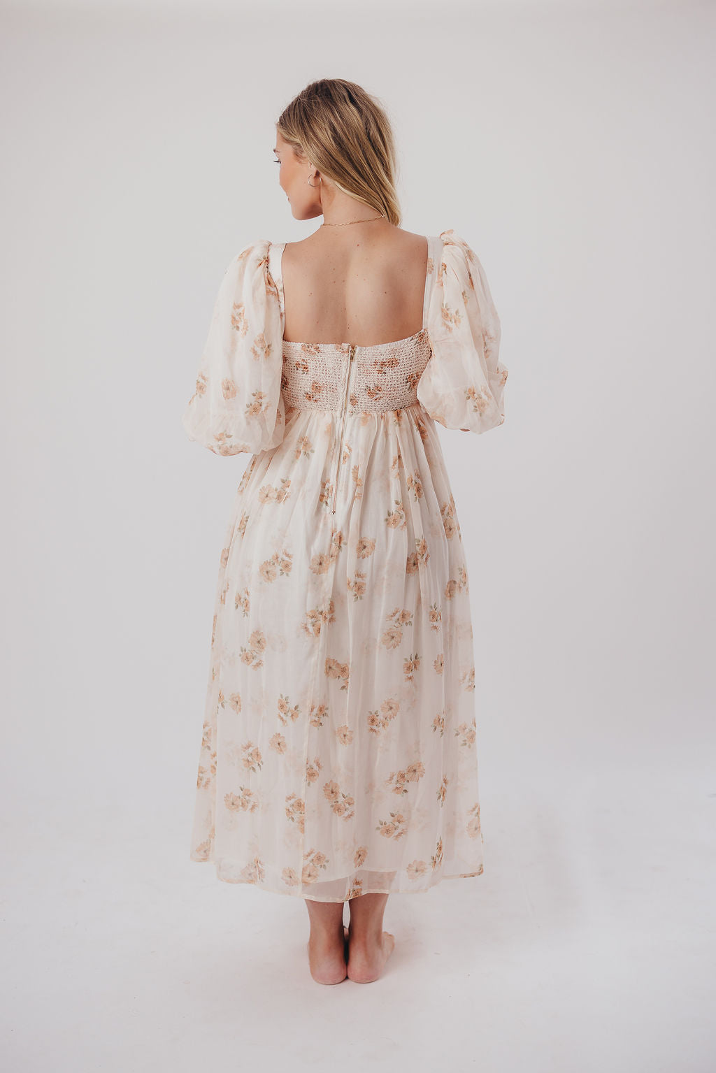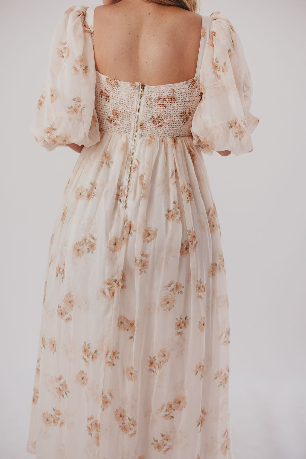 GARMENT DETAILS: Lightweight maxi in a pastel floral print. Features an empire waist silhouette and structured bustier-style bodice, with smocking in the back. Finished with statement puffed sleeves, voluminous skirt, and back zipper. Lined.