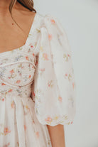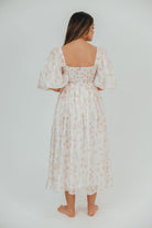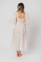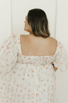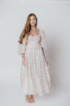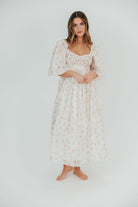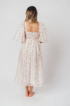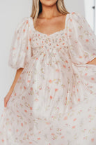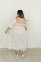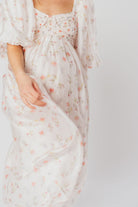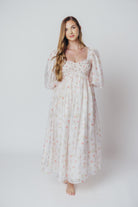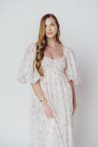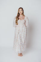 GARMENT DETAILS: Lightweight maxi in a pastel floral print. Features an empire waist silhouette and structured bustier-style bodice, with smocking in the back. Finished with statement puffed sleeves, voluminous skirt, and back zipper. Lined.