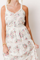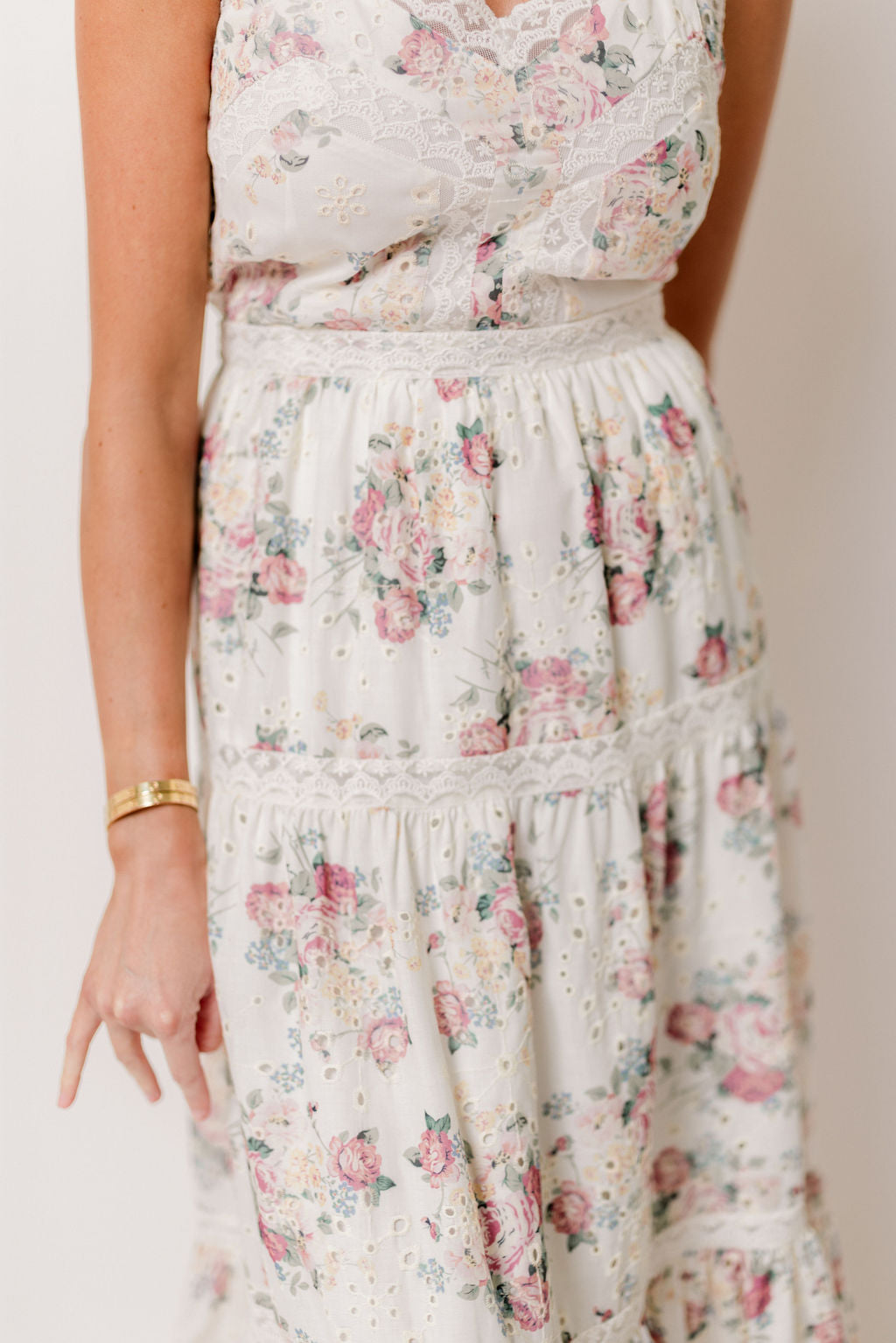 GARMENT DETAILS: Elegant and lightweight maxi dress in a feminine floral print, with V-neckline and delicate lace details. Features a multi-tiered skirt and lightweight, airy silhouette.