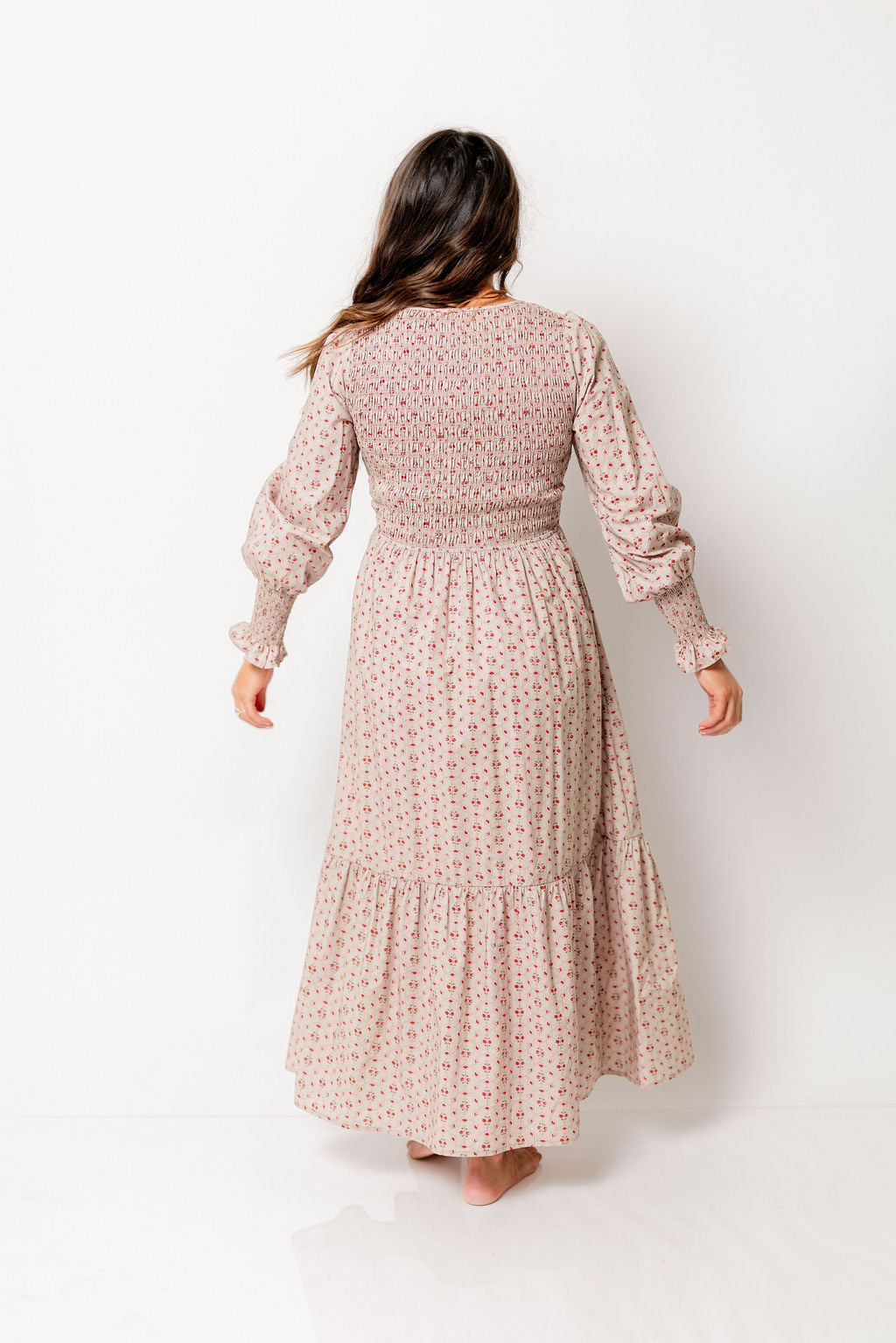 Mercy Cotton Smocked Floral Button Down Maxi Dress in Sepia