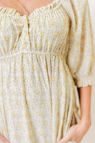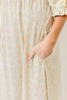 GARMENT DETAILS: Lightweight floral-printed maxi dress with sweetheart neckline, smocked bodice with stretchy waist, and 3/4 length sleeves with elasticated, ruffle cuffs. Finished with an extra-wide tiered skirt, wooden front buttons, and side pockets.