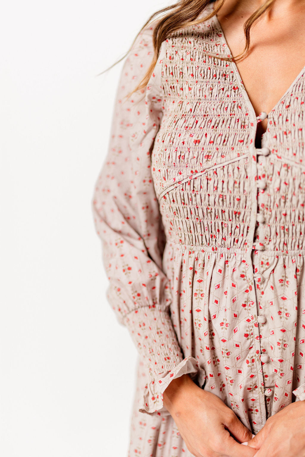 Mercy Cotton Smocked Floral Button Down Maxi Dress in Sepia