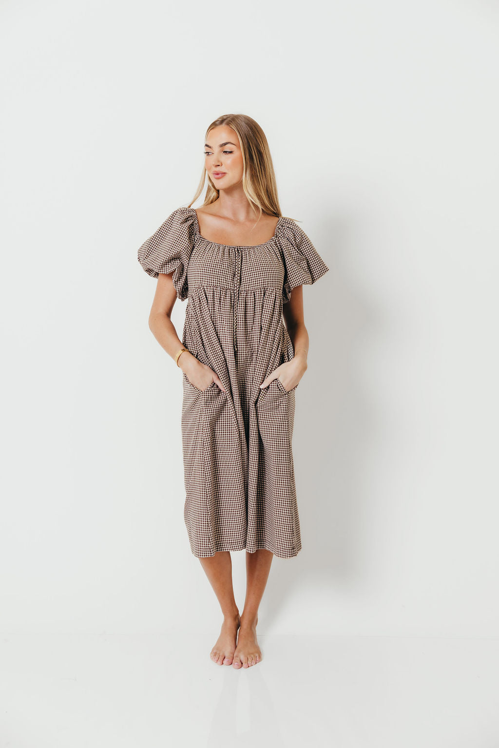 Evelyn Puff Sleeve Gingham Midi Dress in Brown
