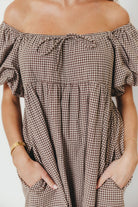 GARMENT DETAILS: Elegant gingham-print midi dress with scooped, elasticated neckline that can be worn on or off the shoulders, puffed short sleeves, and a dainty tie front detail.