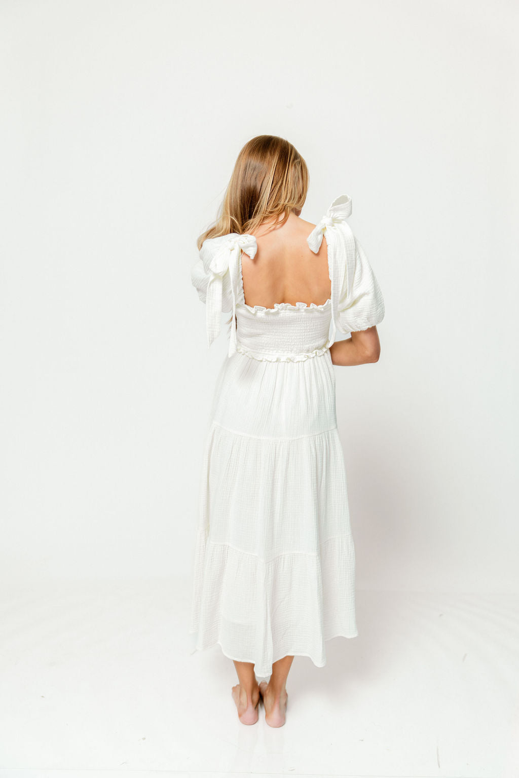 GARMENT DETAILS: Elegant midi dress with a square neckline, statement puffed sleeves, and bow accents on the shoulders. Features a fully smocked bodice, with a multi-tiered skirt.