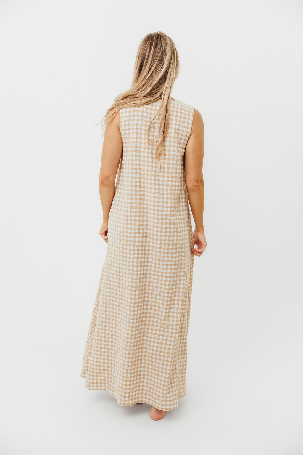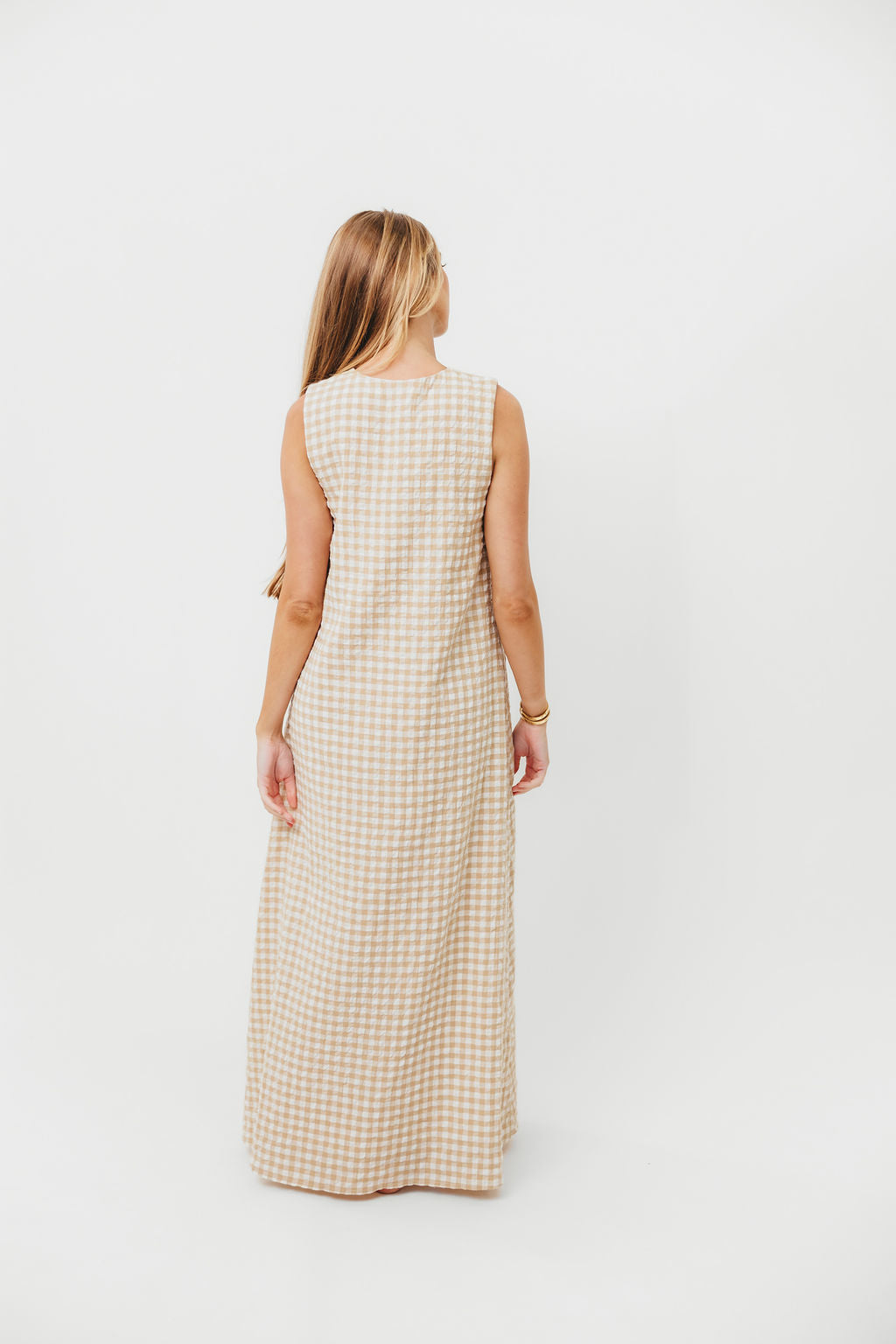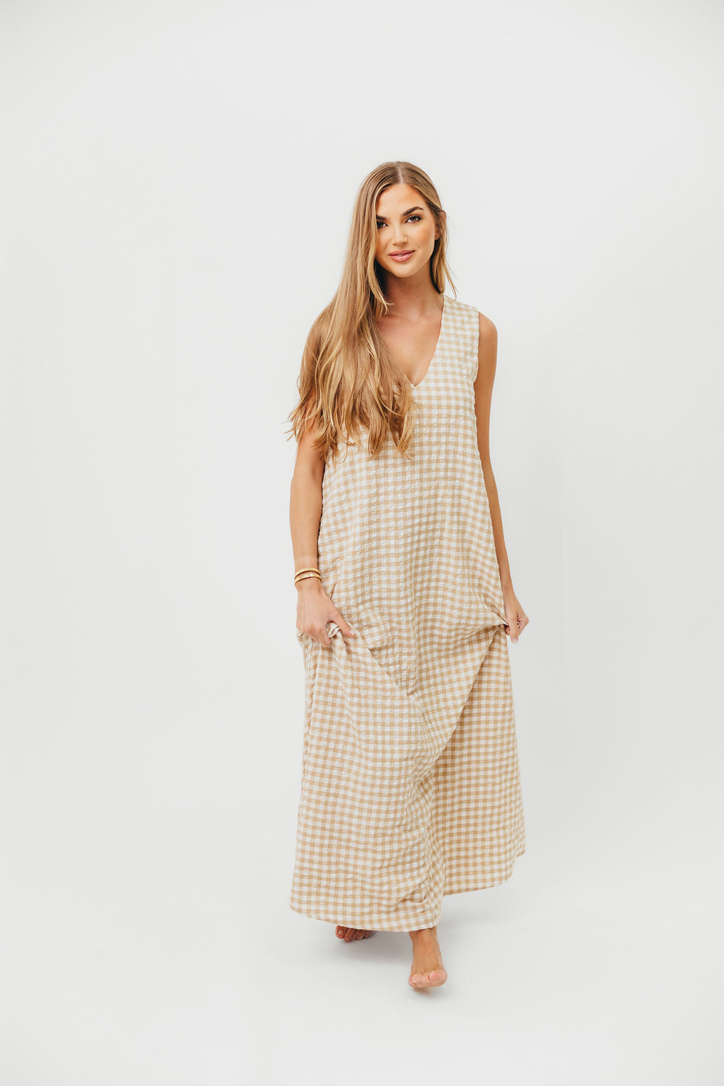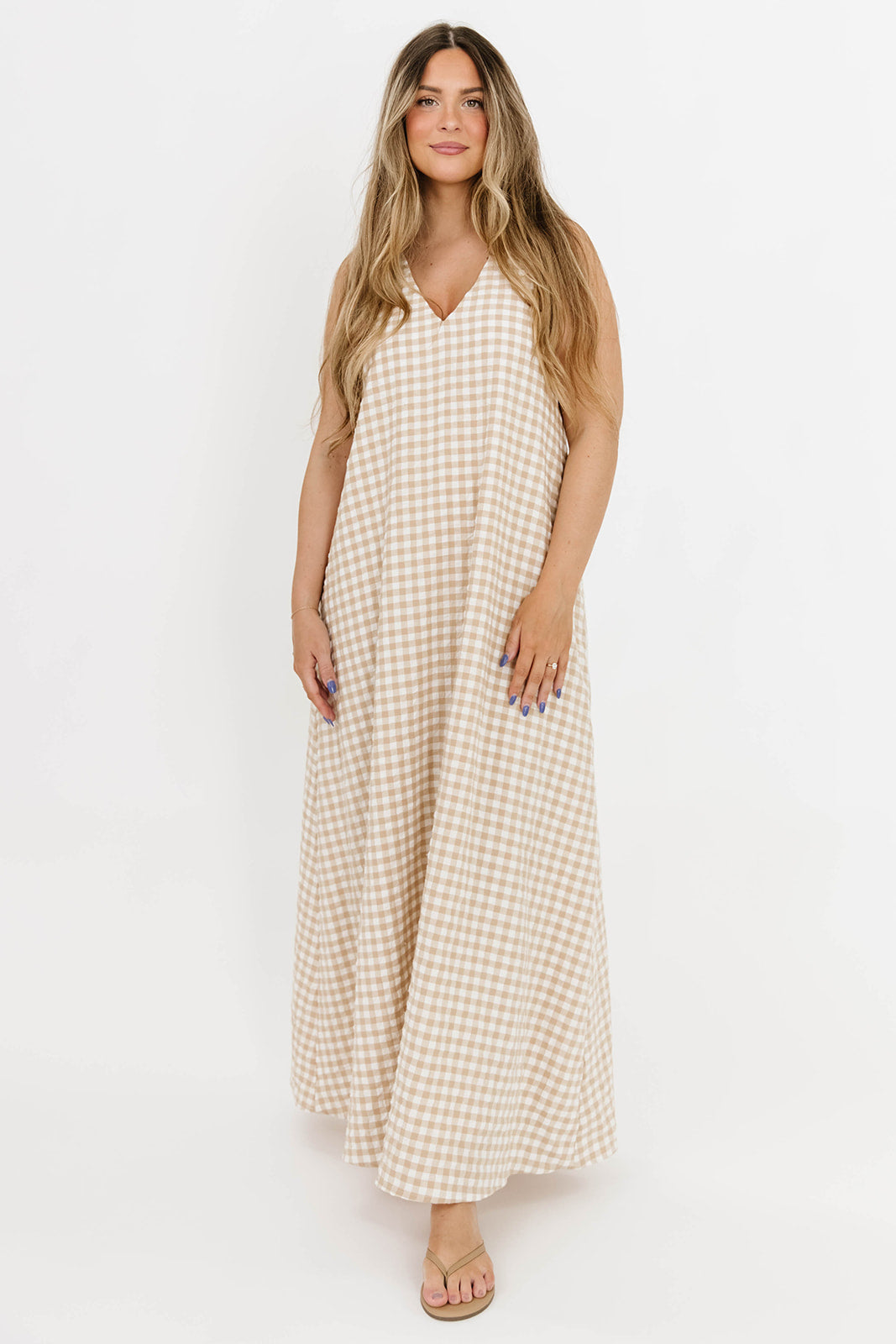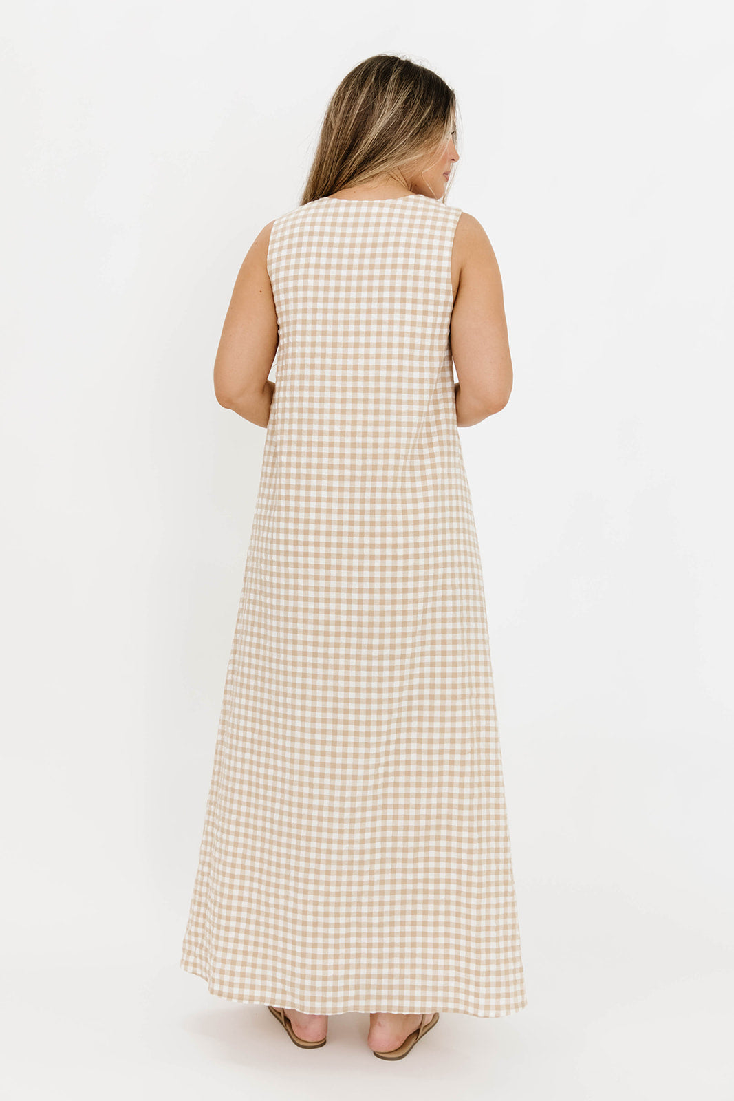 GARMENT DETAILS: Elegant and lightweight maxi in a charming gingham print. Features sleeveless bodice with V-neckline and swing-style, full length skirt.