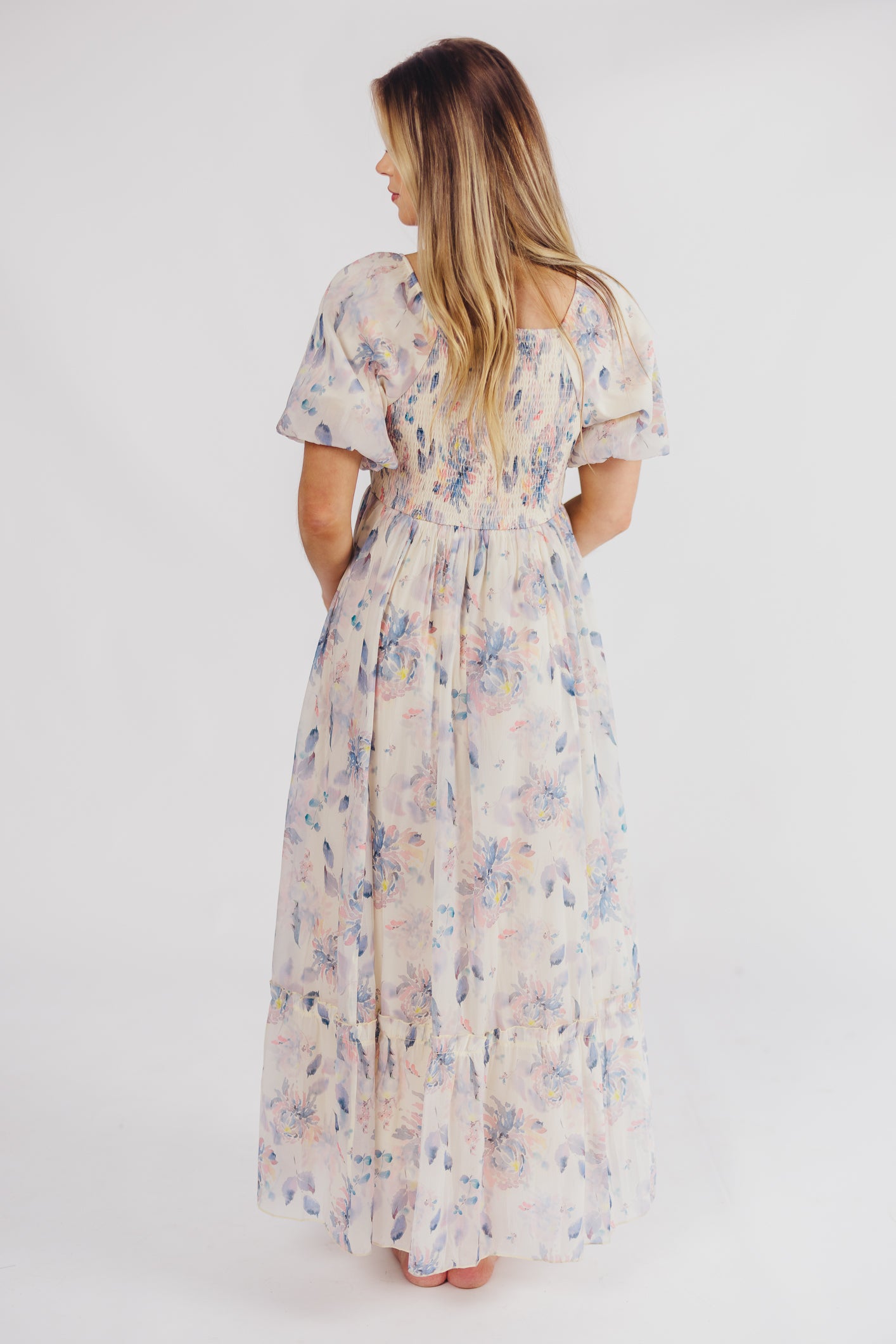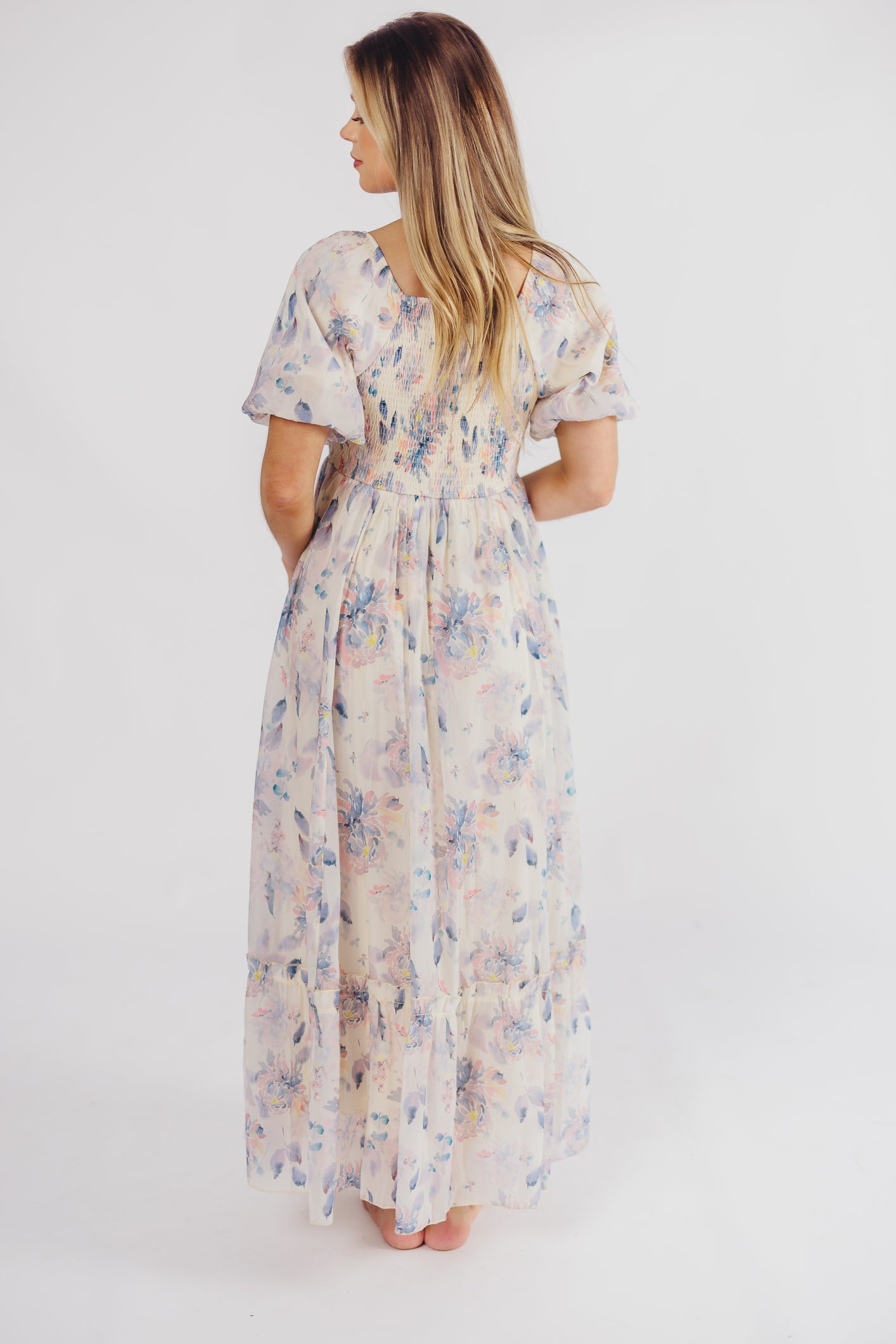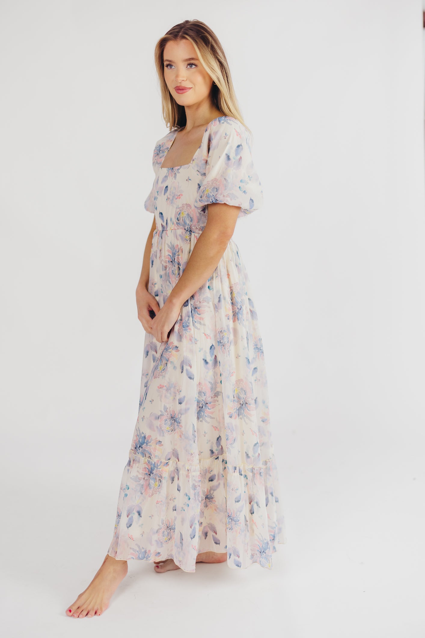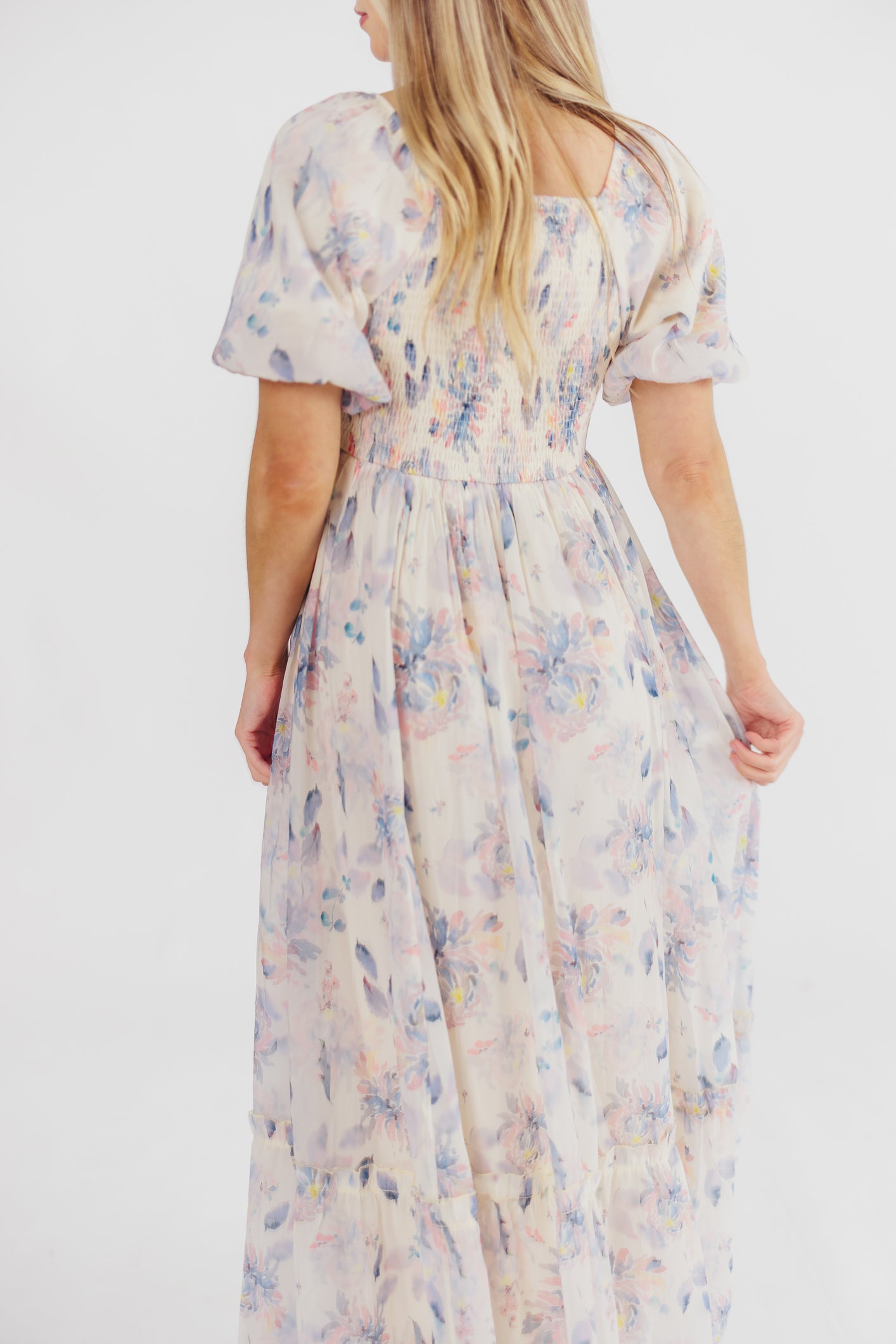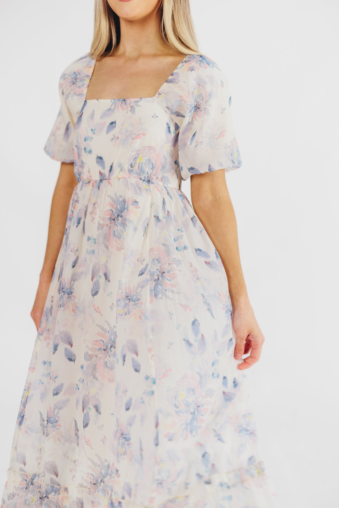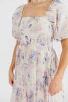 GARMENT DETAILS: Empire-waisted midi dress in an elegant floral pattern with statement 1/2 length balloon sleeves and elasticized square neckline. Features a gathered waist, with a stretchy, smocked back panel, with tiered skirt.