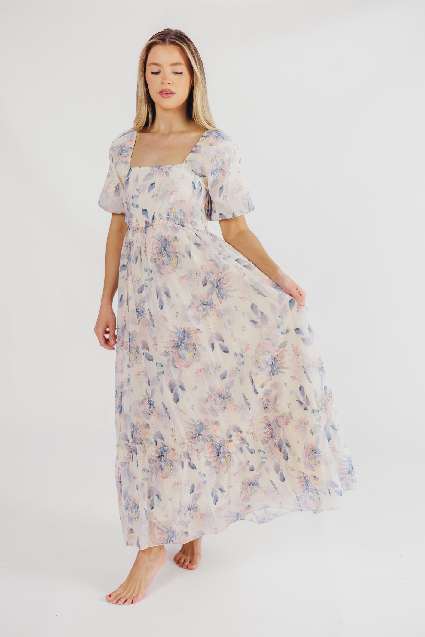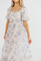 Callie Floral Midi Dress with Square Neckline in Blue Multi - Bump Friendly & Inclusive Sizing (S-3XL)