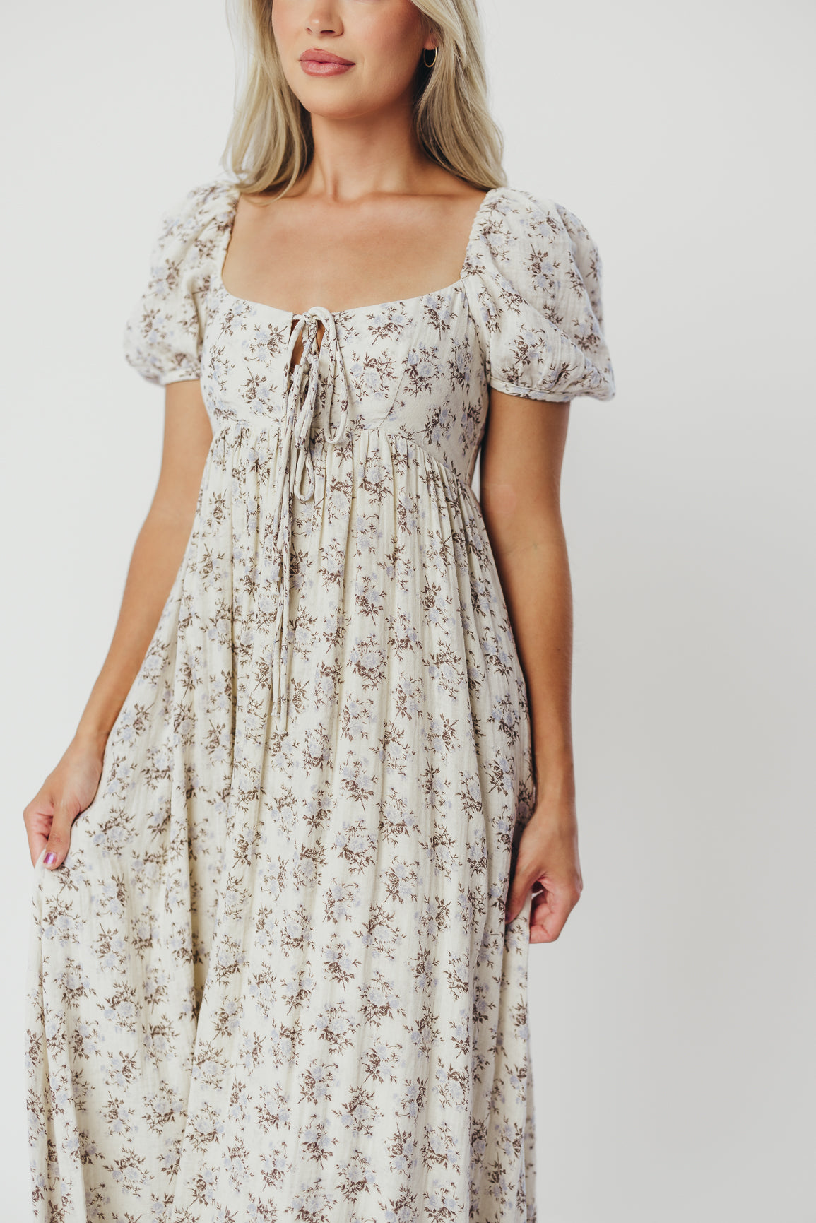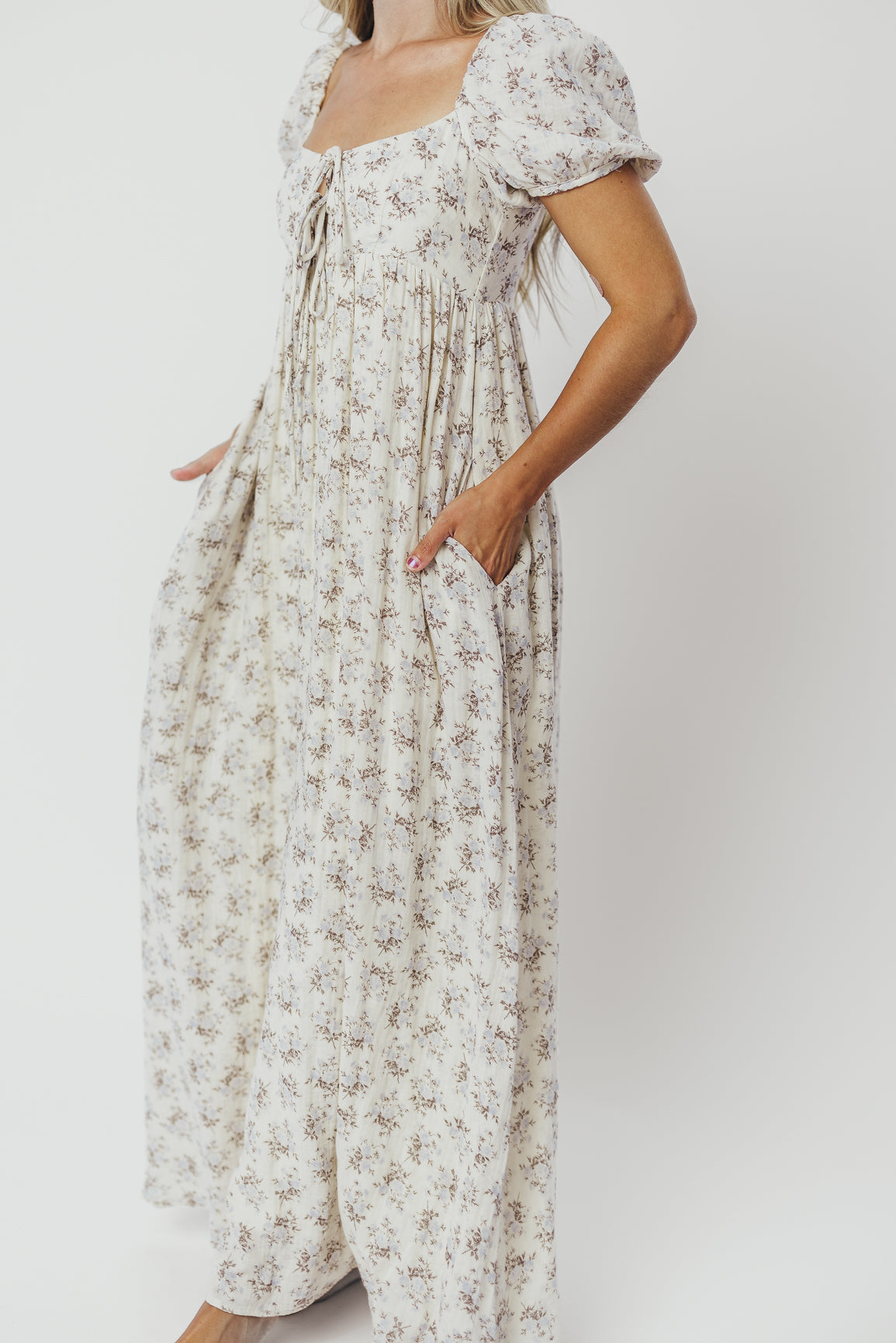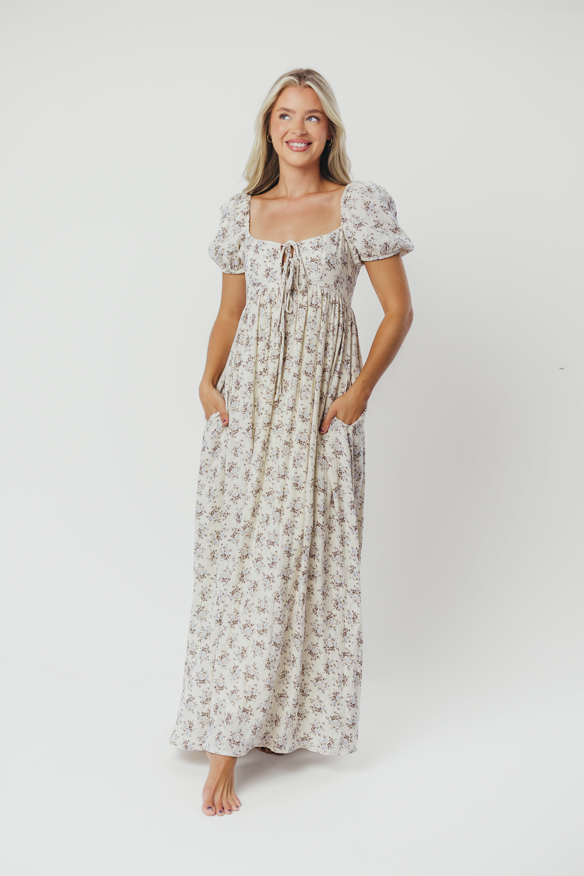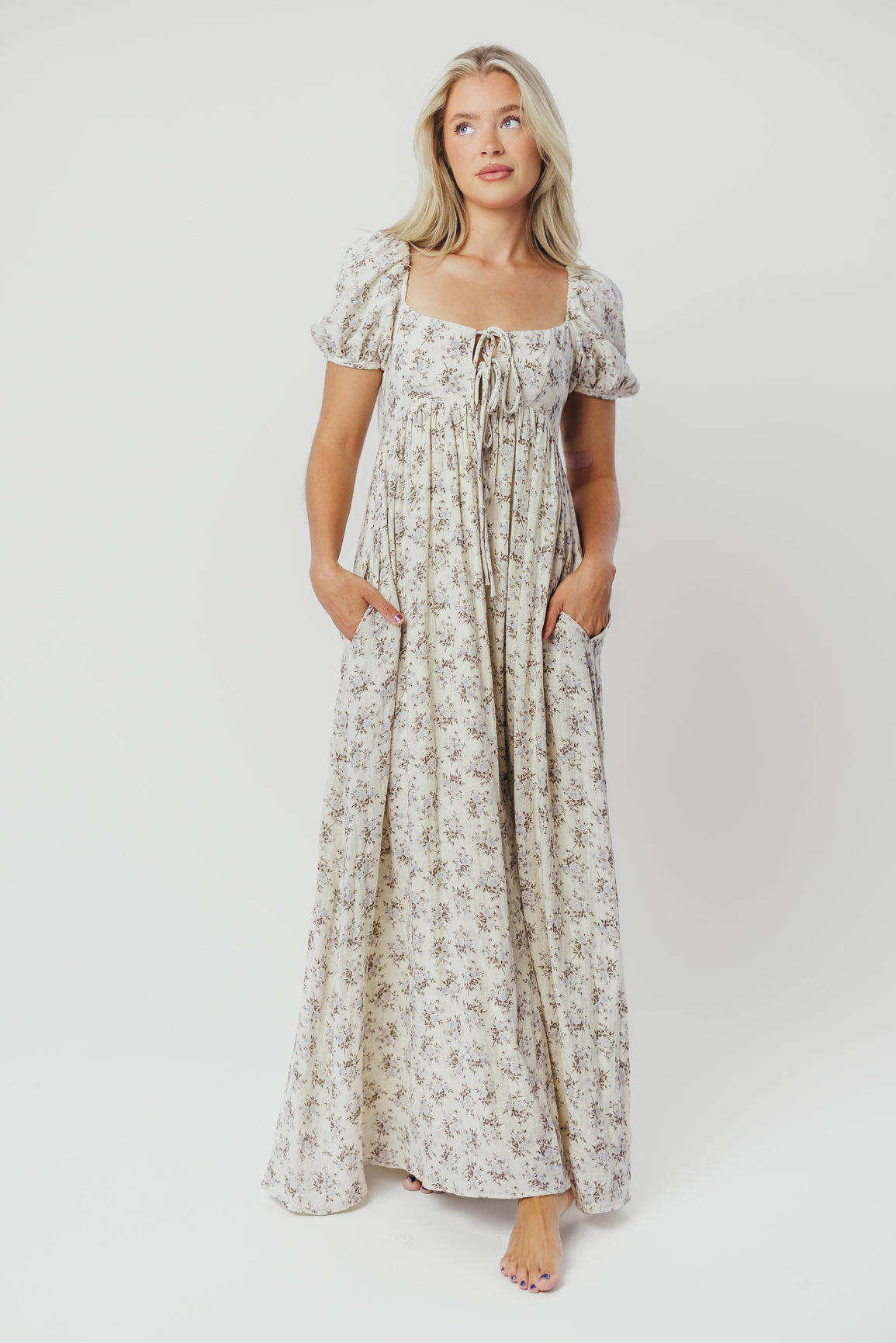 GARMENT DETAILS: Lightweight cotton maxi with a statement square neckline with double tie front details, plus gently puffed short sleeves and empire-waisted silhouette. Features hidden in-seam pockets, scooped back neckline, and a voluminous skirt. Lined.
