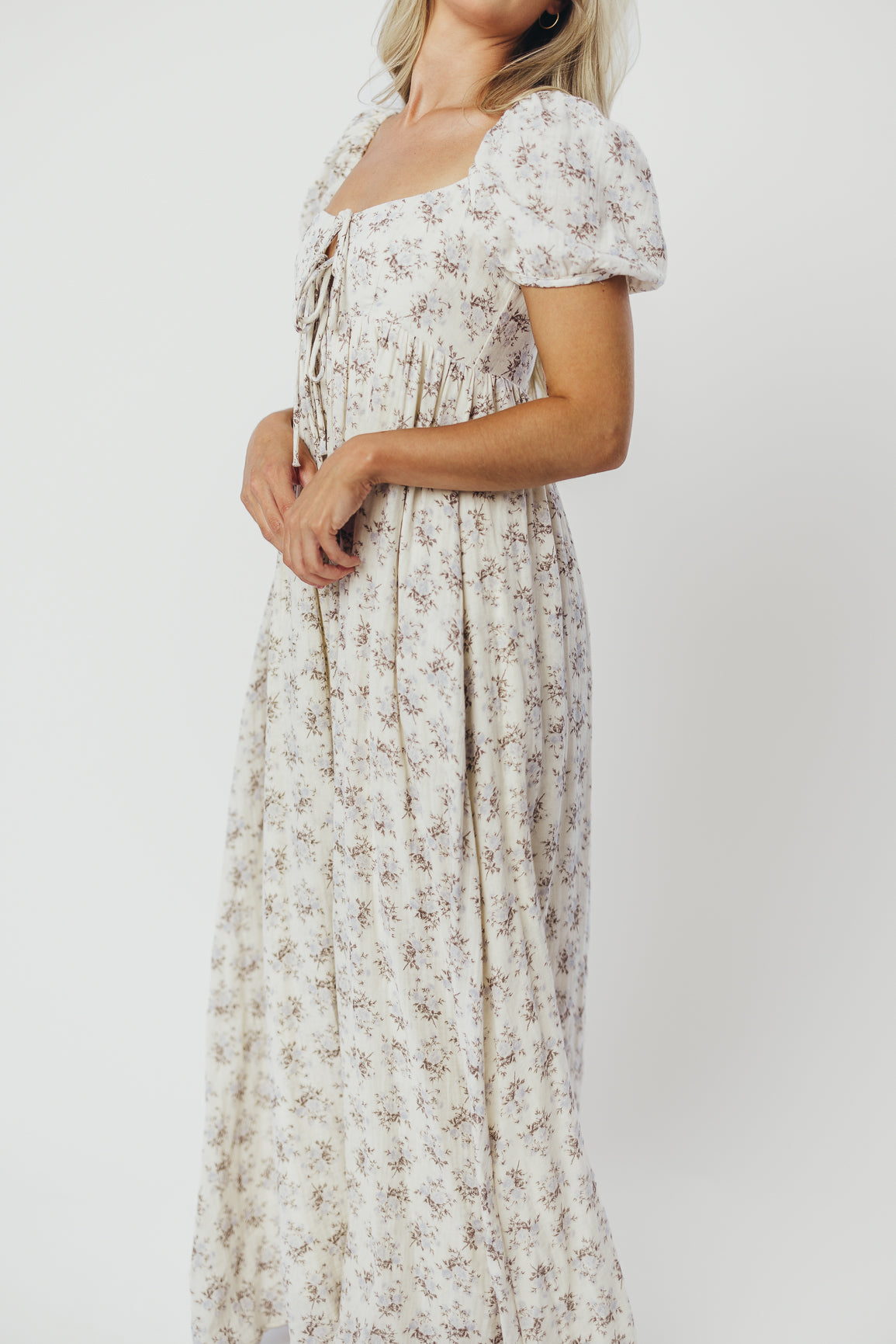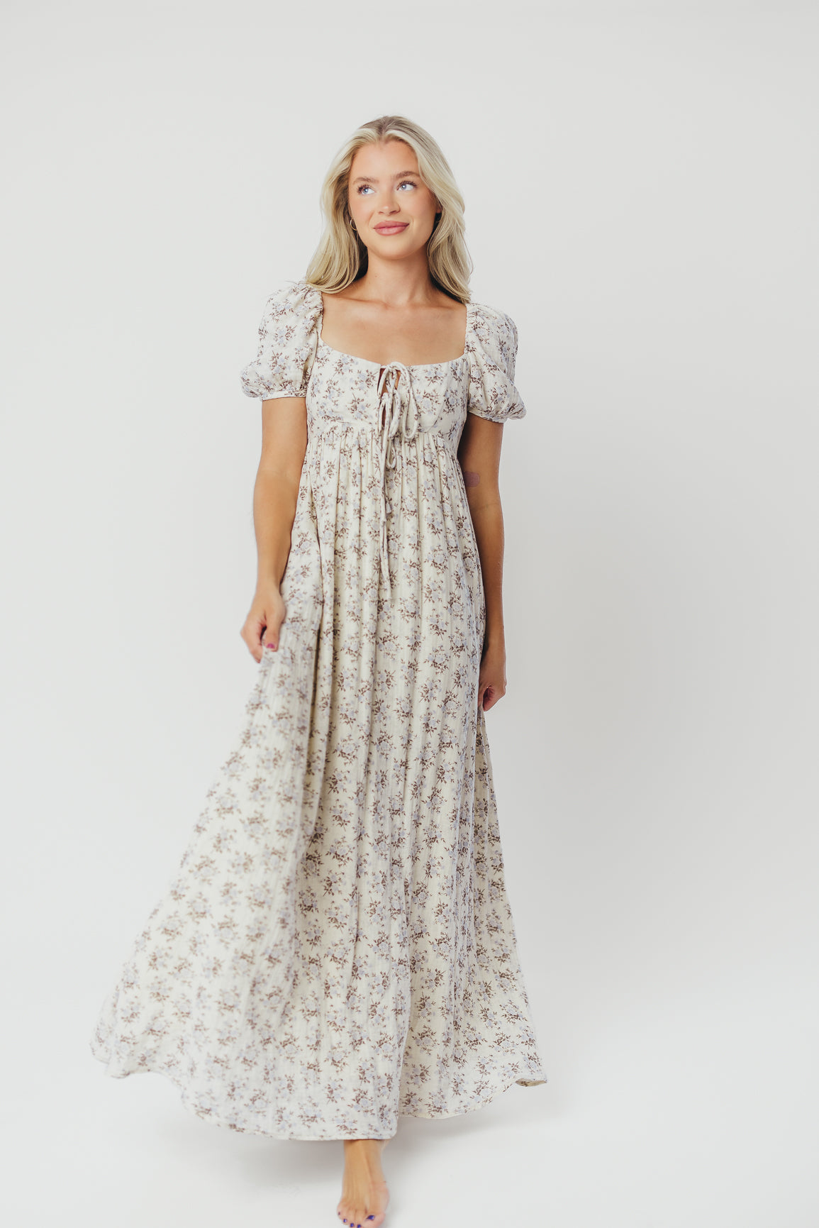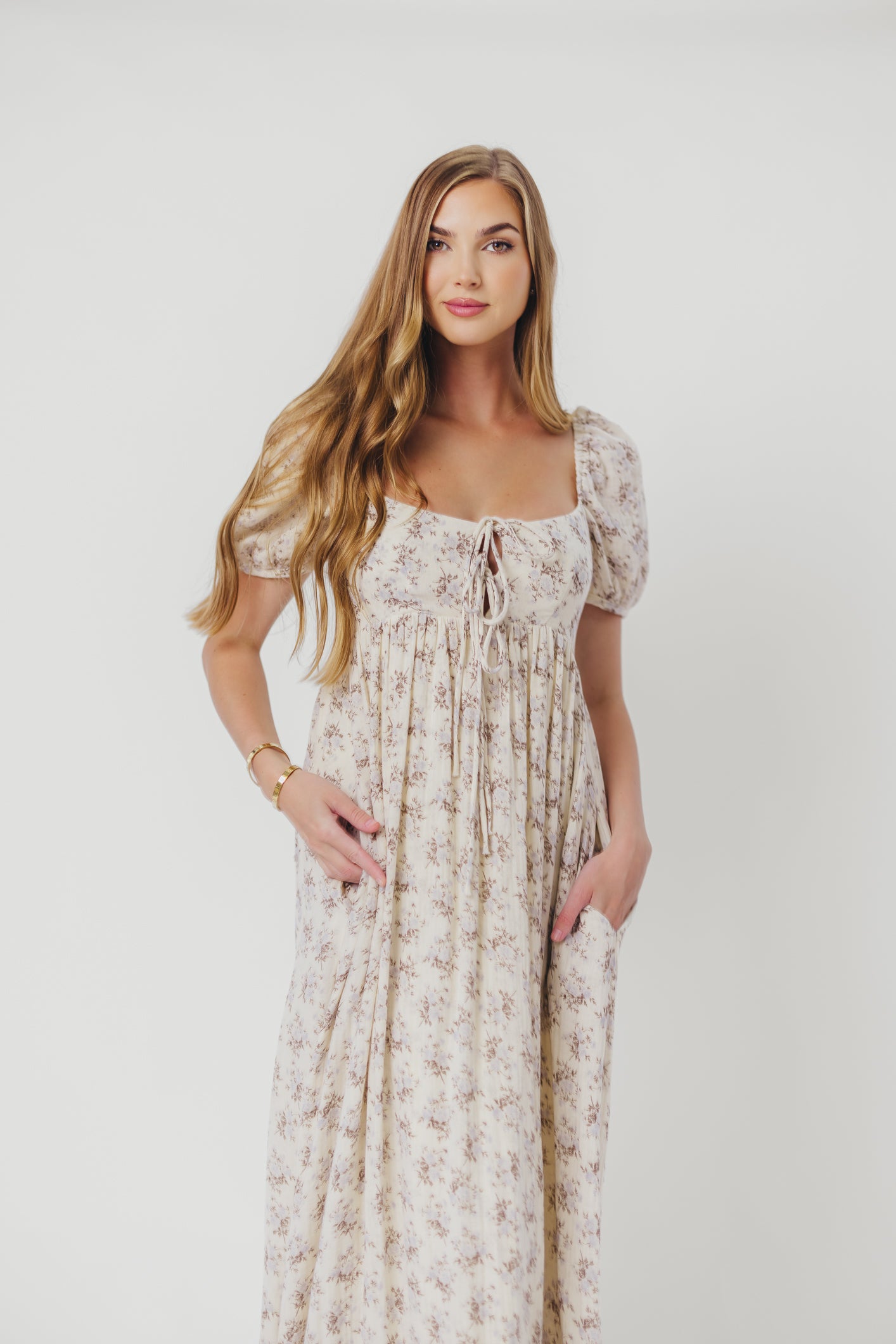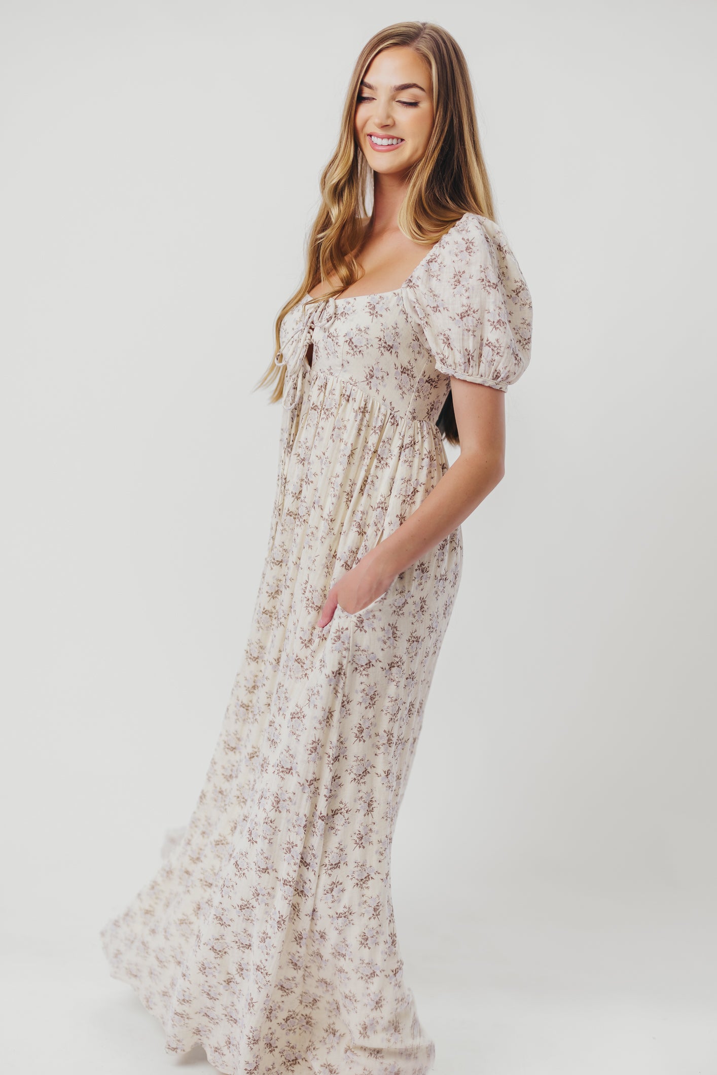 GARMENT DETAILS: Lightweight cotton maxi with a statement square neckline with double tie front details, plus gently puffed short sleeves and empire-waisted silhouette. Features hidden in-seam pockets, scooped back neckline, and a voluminous skirt. Lined.
