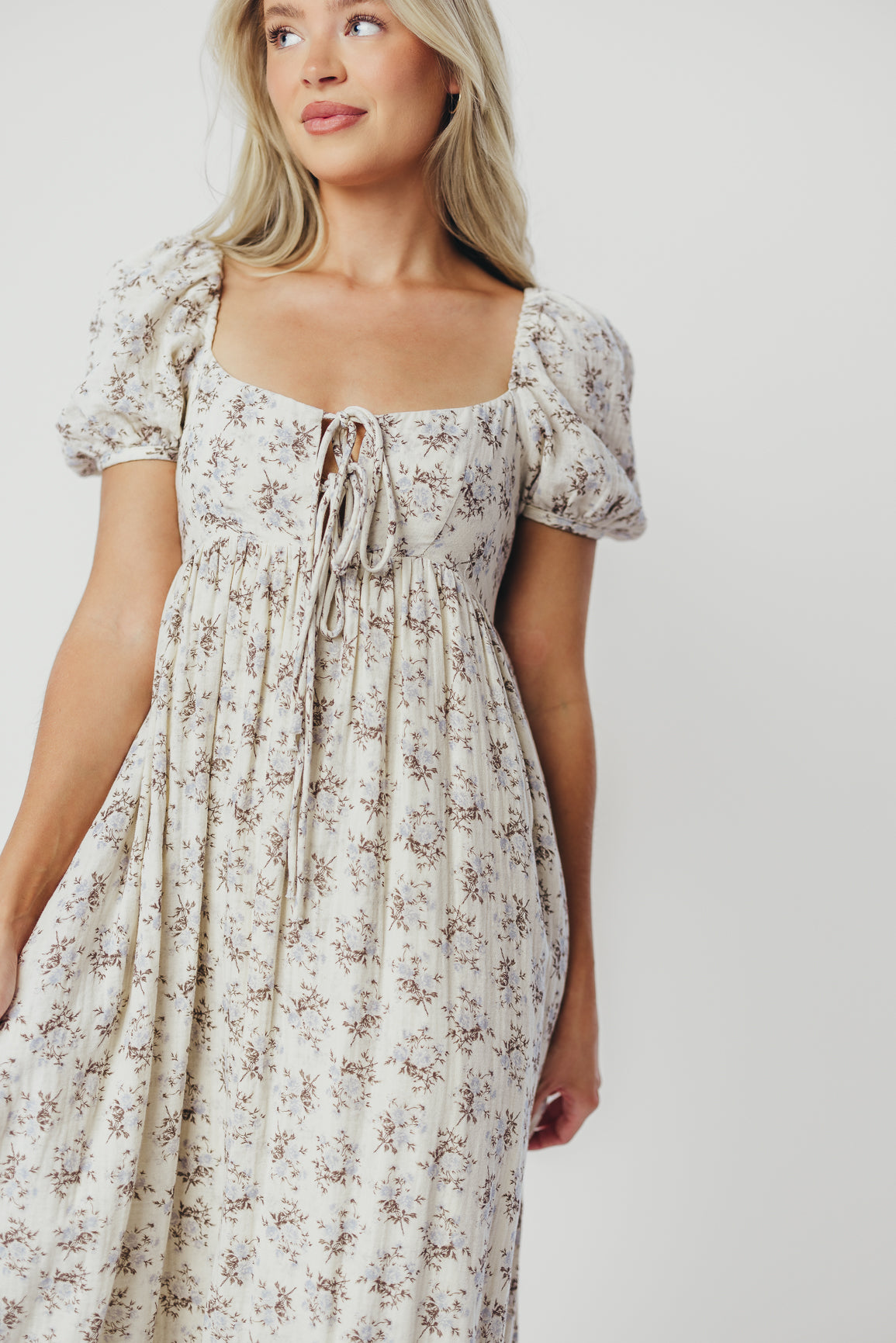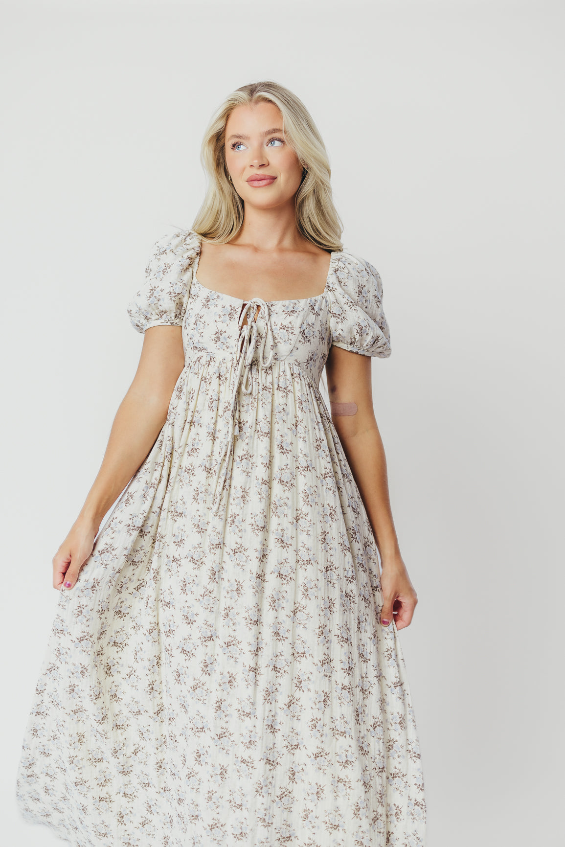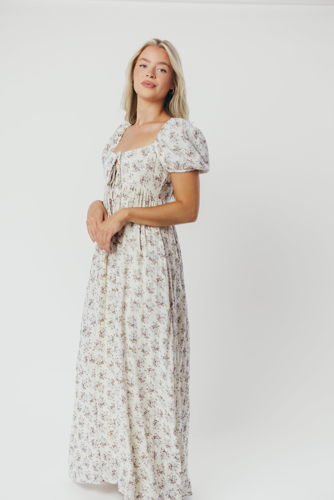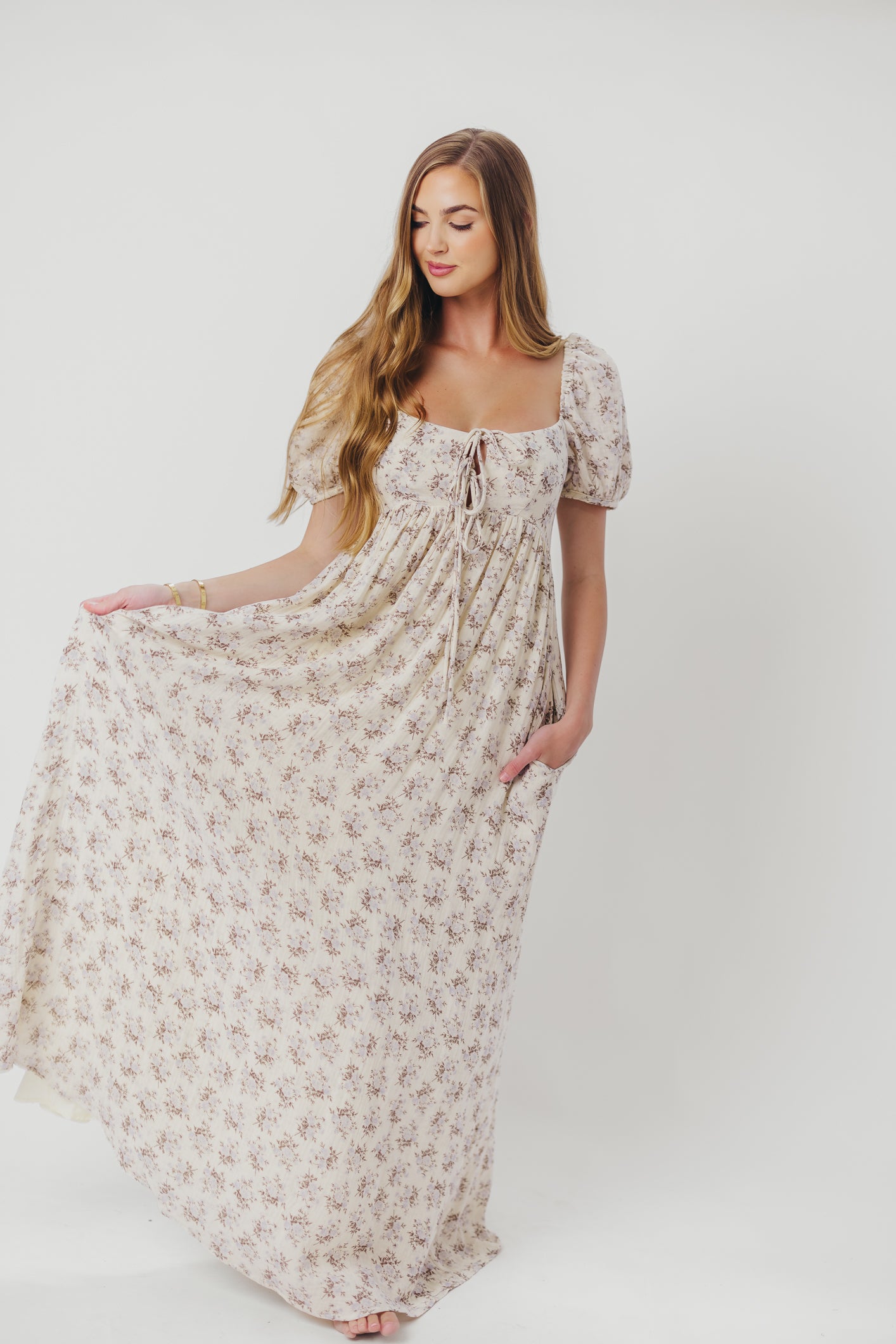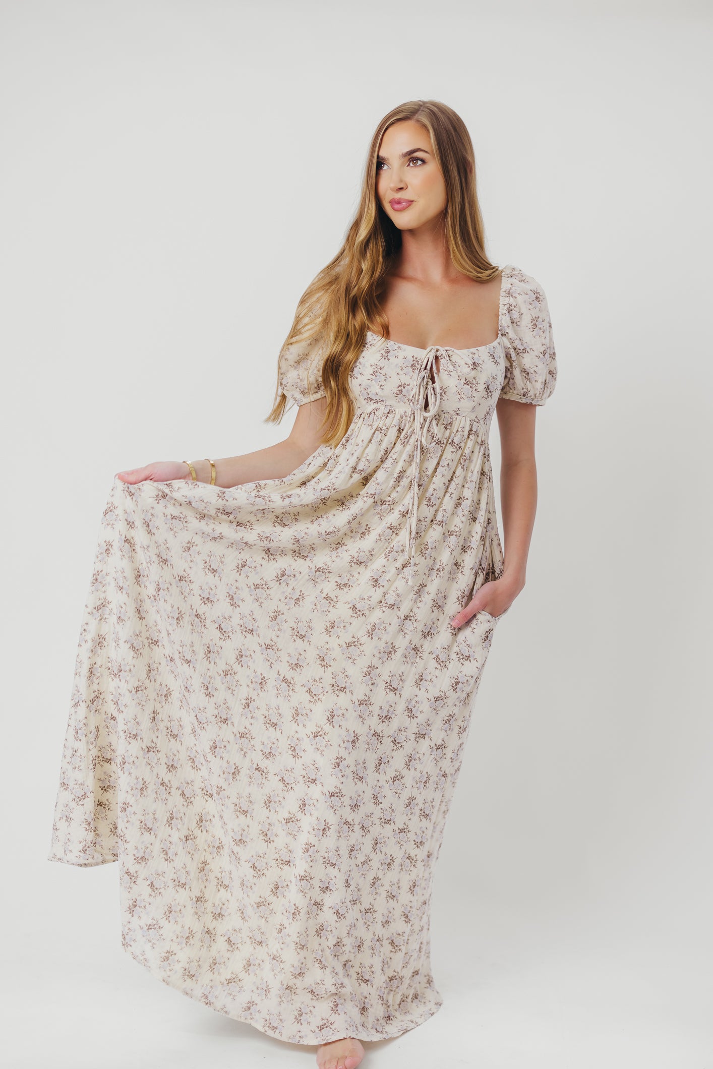 GARMENT DETAILS: Lightweight cotton maxi with a statement square neckline with double tie front details, plus gently puffed short sleeves and empire-waisted silhouette. Features hidden in-seam pockets, scooped back neckline, and a voluminous skirt. Lined.
