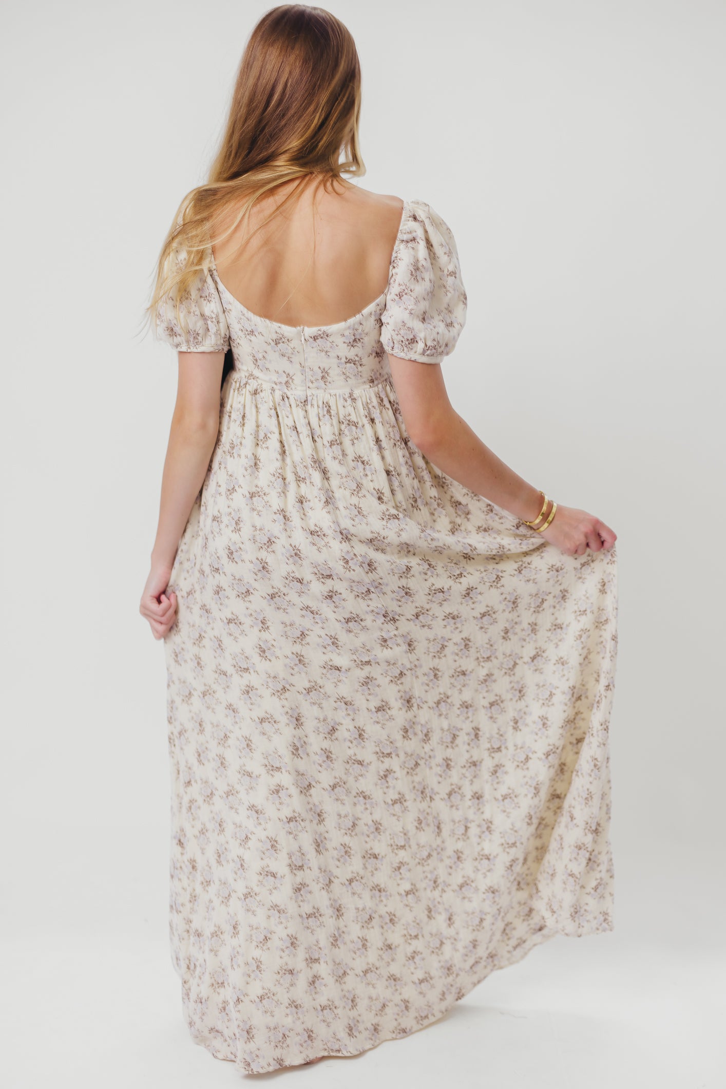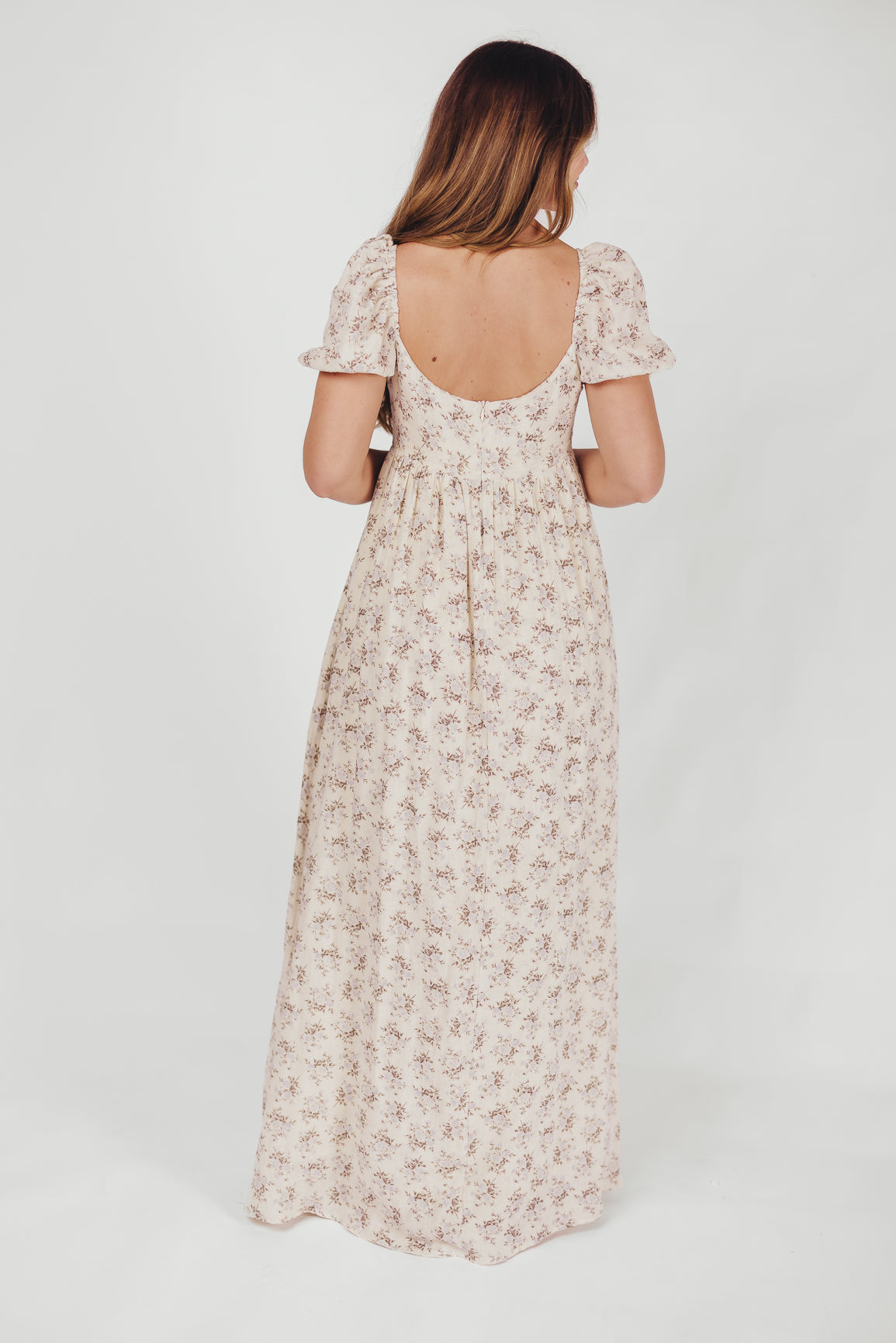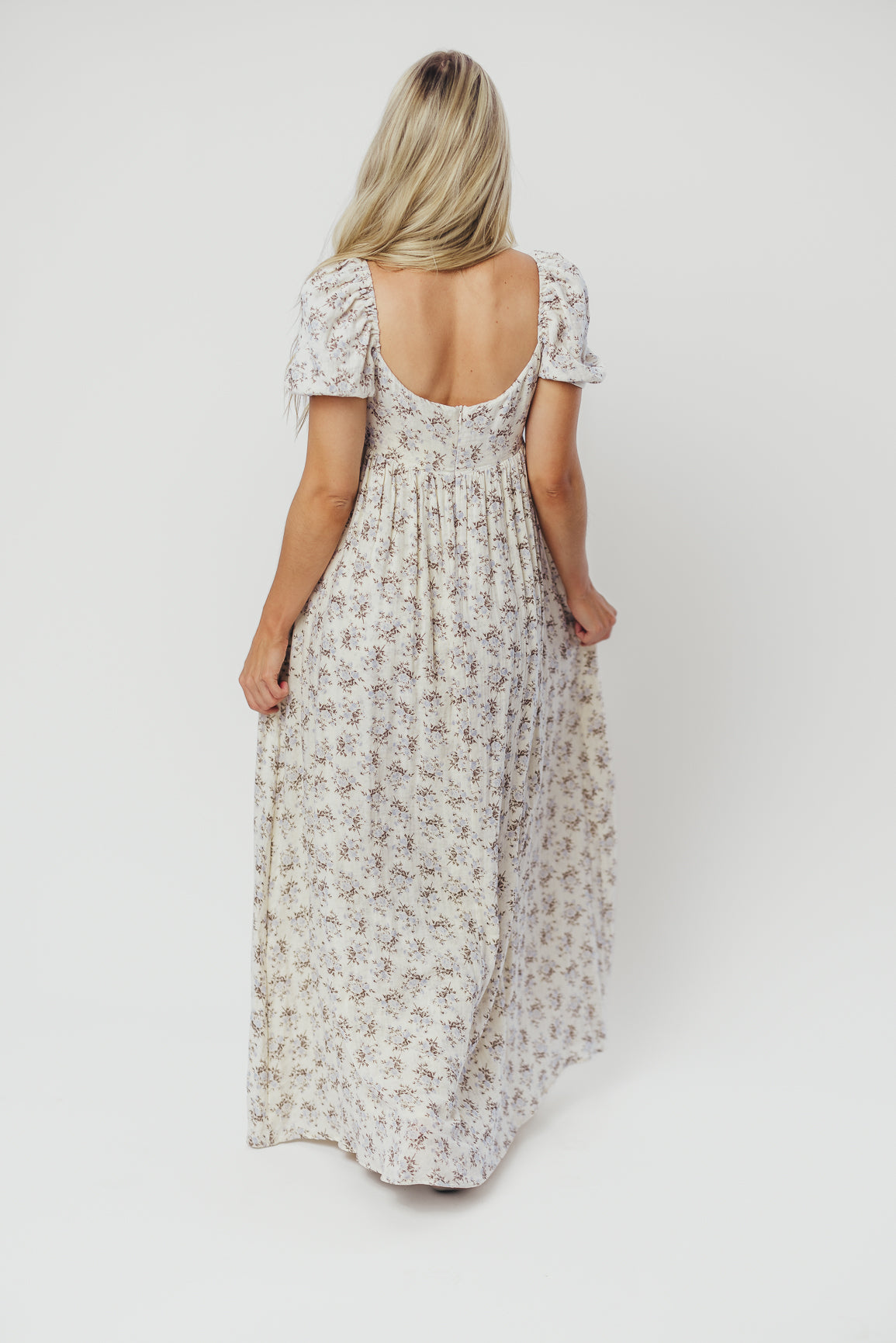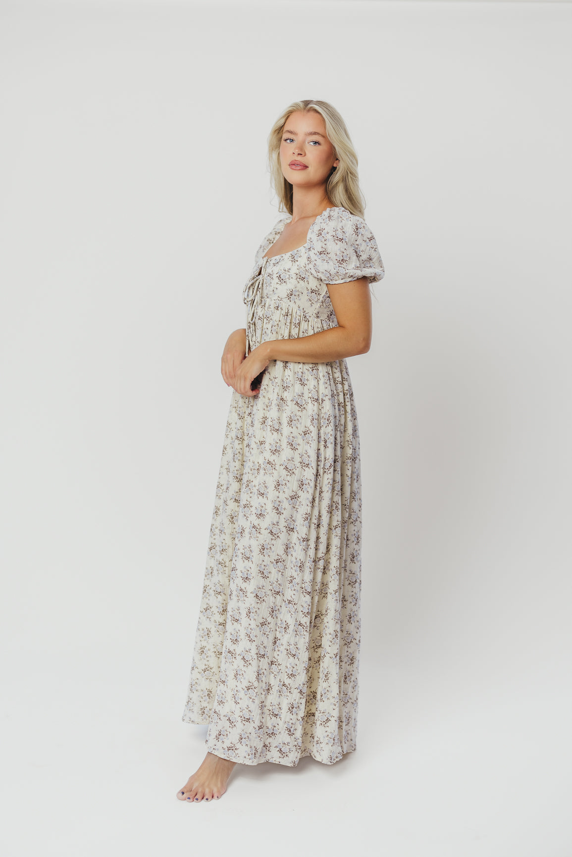 GARMENT DETAILS: Lightweight cotton maxi with a statement square neckline with double tie front details, plus gently puffed short sleeves and empire-waisted silhouette. Features hidden in-seam pockets, scooped back neckline, and a voluminous skirt. Lined.