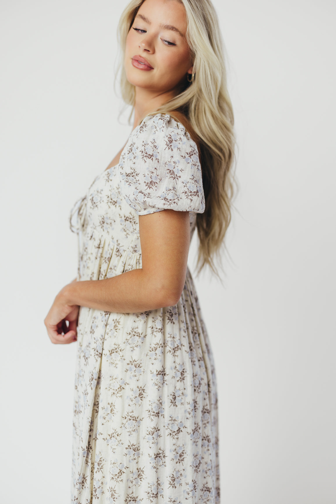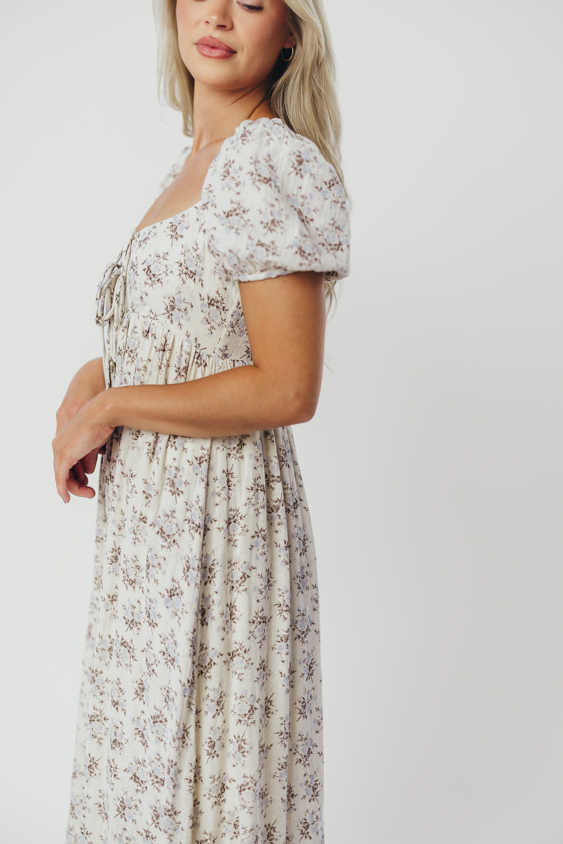 Haven 100% Cotton Tie-Front Maxi Dress in Blue/Brown Floral - Bump Friendly